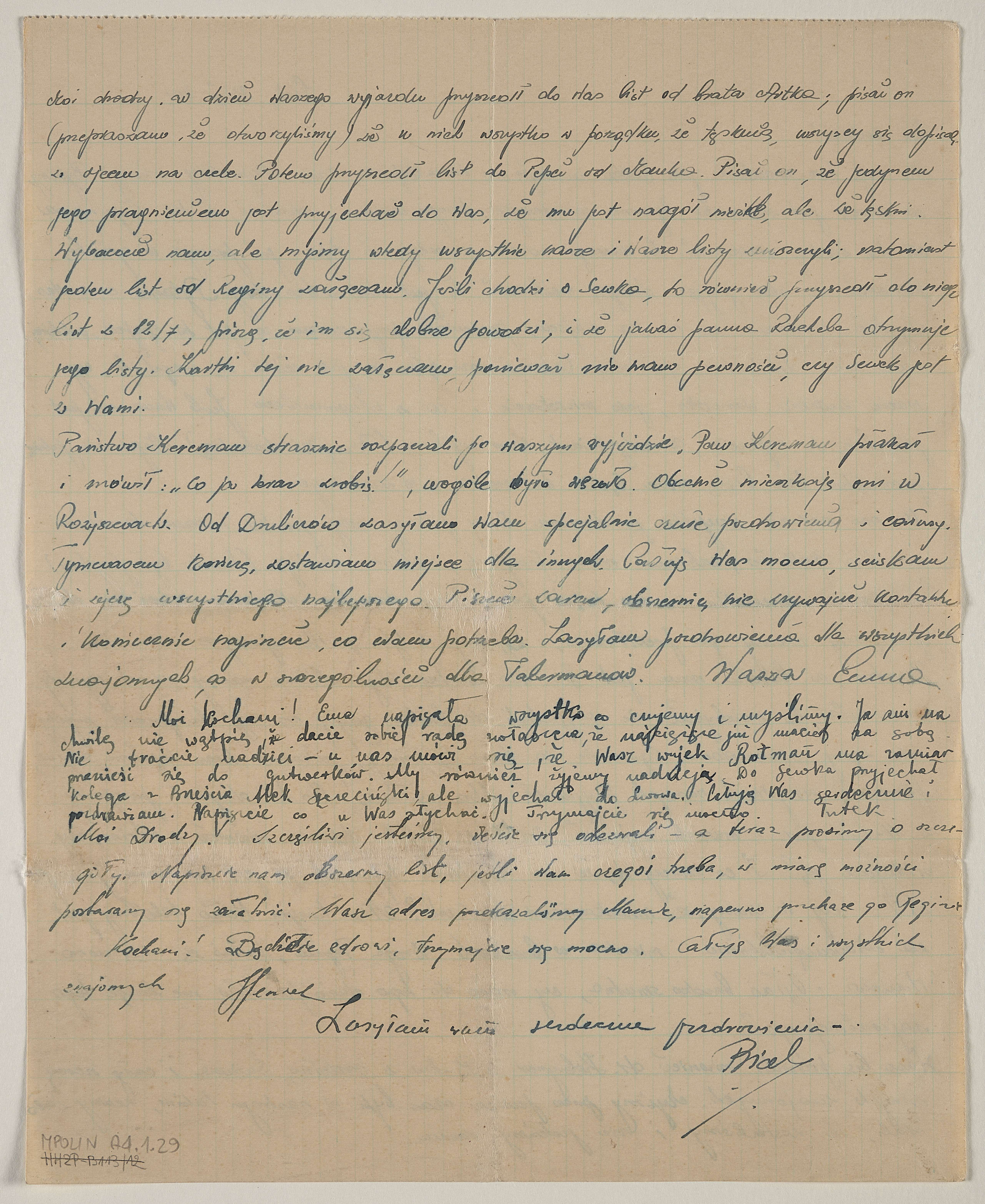 List pisany do Pauliny Włodawer przez jej warszawską przyjaciółkę, Emmę Bialer (Bogusławską) w czasie, kiedy Paulina i Artur Włodawer byli zesłani z Łucka na Syberię, do Asino (autorka listu pozostała w Łucku). Dopisek od Tutka Bialera oraz Heńka (Henryka) Gutaisera oraz ojca Emmy. Emma Bialer pisze: ,,Z waszego adresu wnioskuję, że Pepcia już pracuje w szpitalu, ponieważ nie chcę przyjąć drugiej możliwości, że jest Ktoś z Was chory" (Paulina Włodawer faktycznie pracowała w szpitalu jako pielęgniarka). Inny fragment listu: ,,U nas na razie wszystko po staremu. Owej pięknej nocy groziło i nam to samo, co Was spotkało, zabrano nam paszporty, zrobiono rewizję (Sewek był przy tem) i w ogóle zanosiło się na to, że podzielimy Wasz los. Na razie jakoś się obeszło, paszporty mamy już przedłużone i żyjemy o tyle, o ile spokojnie. [...] jesteśmy teraz zupełnie sami, ponieważ wszystkich naszych przyjaciół albo wysłano, albo też otrzymali paszporty z 11-tym par. i musieli wyjechać. Od Ewy przyszła depesza również z Asino, czy widujecie ją? [...] Nasz kuzyn Henio Waldberg jest za Archangielskiem i mieszka w barakach. Droga Pepciu, śniłaś się niedawno Heniowi [Gutaiserowi, ówczesnemu mężowi autorki listu] i byłaś bardzo smutna, czy masz do tego dużo powodów, nie licząc tego najważniejszego? Wasz los podzielił również dr Kobryner z B-ku [Białegostoku?] z rodziną, Świeca i cały szereg innych znajomych". Emma Bialer donosi, że po wywiezieniu Włodawerów przyszły listy od brata Artura (,,pisał on [...] że u nich wszystko w porządku, że tęsknią, wszyscy się dopisali z ojcem na czele") oraz od Emanuela (,,jest mu na ogół nieźle, ale [...] tęskni"), dodaje jednak: ,,Wybaczcie nam, ale myśmy wtedy wszystkie nasze i Wasze listy zniszczyli; natomiast jeden list od Reginy załączam". Nie wiemy, który list był owym załącznikiem, zapewne zachował się i jest obecnie częścią tej kolekcji rodzinnej.