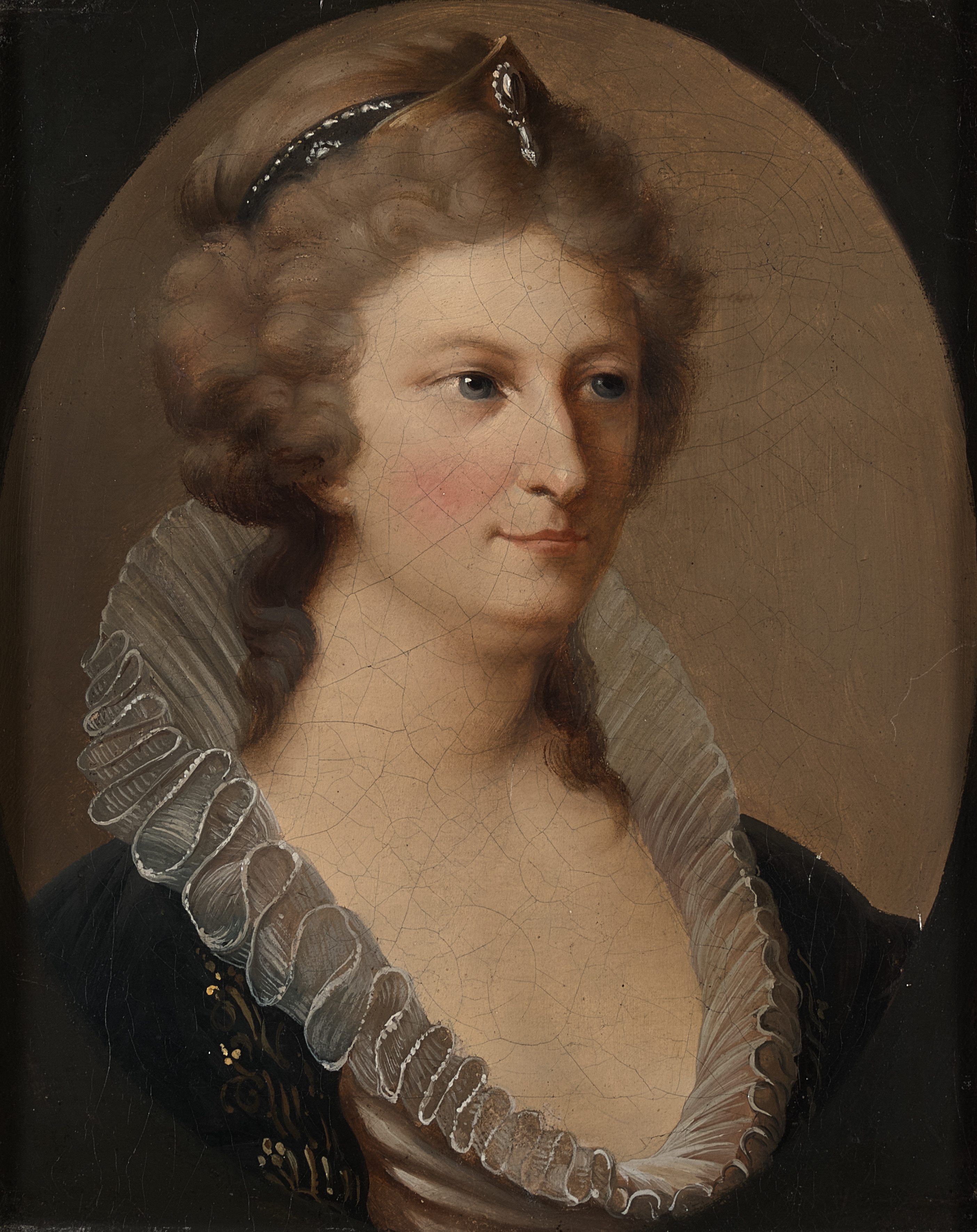 Obraz ze zbiorów muzealnych przedstawia portret kobiety (owal w prostokącie) ukazanej w popiersiu na neutralnym tle. To Józefina Amalia z Mniszchów ( ur. w sierpniu 1798 r, zm. w październiku 1768 r w Petersburgu) córka Jerzego Augusta Mniszcha i Marii Amalii z Bruhlów, polska arystokratka, kolekcjonerka sztuki i malarka amatorka. Malarstwa uczyła się w Warszawie u Antoniego Albertrandiego. W 1774 r poślubiła Stanisława Szczęsnego Potockiego ( była jego drugą żoną), z którym oficjalnie miała jedenaścioro dzieci ( tylko troje z mężem). W posagu wniosła Duklę, Samoklęski, pałace w Warszawie i Gdańsku, liczne srebra, meble i porcelanę. Była energiczną kobietą, zajmowała się sprawami majątkowymi, a jej ulubionym zajęciem było swatanie domowników. Namalowała też kilka obrazów, m.in. portretowała swego męża. Próbowała również swoich sił w literaturze, jest autorką Dwóch Powiastek: „Ożenienie filozoficzne i Panna S” oraz dwóch wierszy. Początkowo pożycie małżeńskie układało się pomyślnie, jednak po nawiązaniu przez Stanisława romansu z Zofią Wittową małżonkowie rozstali się i po porozumieniu w sprawach majątkowych wzięli rozwód w 1798 r. Wkrótce po rozwodzie zmarła, przyczyną śmierci było prawdopodobnie poronienie (zażyła lekarstwo mające przerwać kolejną ciążę). Łańcucki obraz jest późniejszą kopią z oryginału Jana Chrzciciela Lampiego z 1791 r. i jest eksponowany w salonie należącym do Apartamentu Paradnego na I piętrze zamku łańcuckiego. Jan Chrzciciel Lampi (starszy ur. w grudniu1751 r w Romeno, zm. w lutym 1830 r w Wiedniu) to włoski malarz epoki klasycyzmu, tworzący w Austrii (Wiedeń), głownie portrecista. Studiował w Weronie, Trydencie i Salzburgu, potem był profesorem Akademii Wiedeńskiej. W latach 1788 – 91 przebywał w Warszawie, na dworze Stanisława Augusta Poniatowskiego. Był nadwornym malarzem Katarzyny II. Został nobilitowany prze cesarza Franciszka II. Wiele jego obrazów znajduje się w rękach prywatnych właścicieli. Portretował osoby z arystokracji i głowy koronowane.
