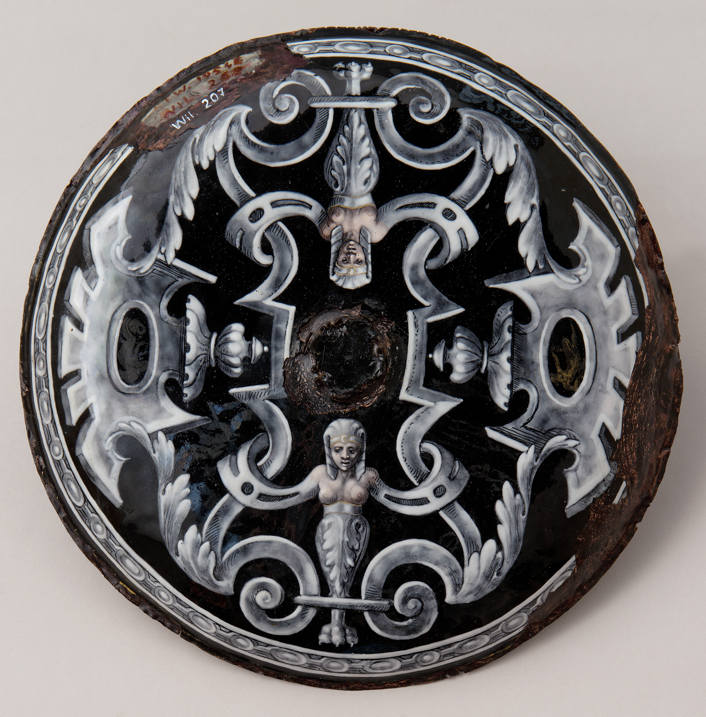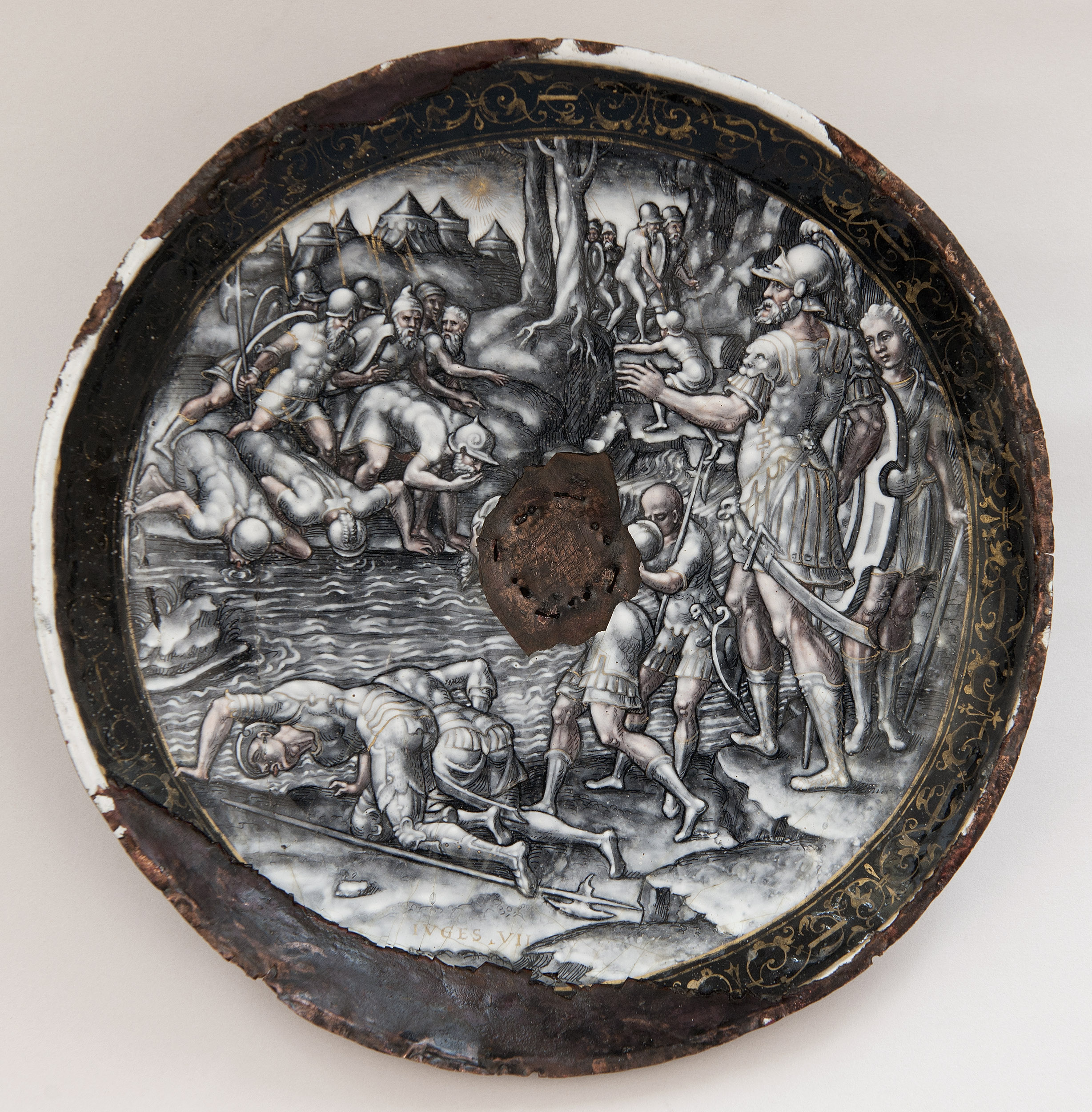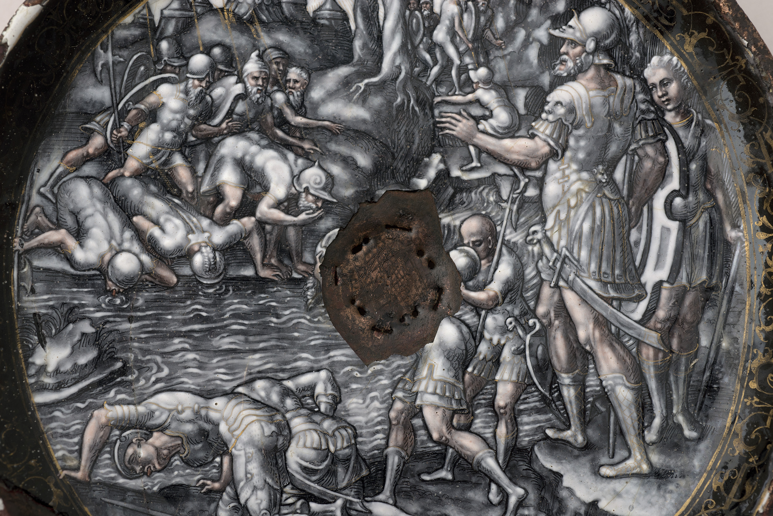 Zachowana część górna patery w kształcie okrągłego talerza, całkowicie pokryta emalią z dekoracją en grisaille na czarnym tle. Na środku lustra widoczne uszkodzenie w miejscu łączenia z podstawą. Brzegi naczynia bardzo mocno zdegradowane, z wykruszoną emalią. Dekorację patery stanowi przedstawienie rycerzy nad rzeką, którzy spragnieni piją wodę. Na pierwszym planie widoczny głównodowodzący, a obok niego przyklękający wojownicy w zbrojach i hełmach. Nachylają się nad taflą, by ugasić pragnienie. Na drugim brzegu rzeki rycerze chłepczący wodę wprost z koryta rzeki oraz tacy, którzy nabierają ją w dłonie. Za nimi w oddali widoczne namioty i drzewa rosnące na skałach. Po prawej widoczny żołnierz wychodzący z wody. Pod spodem złotymi literami: „Juges VII”. Na spodniej stronie patery dwa kartusze renesansowe i dwie kariatydy połączone pasami arabesek.