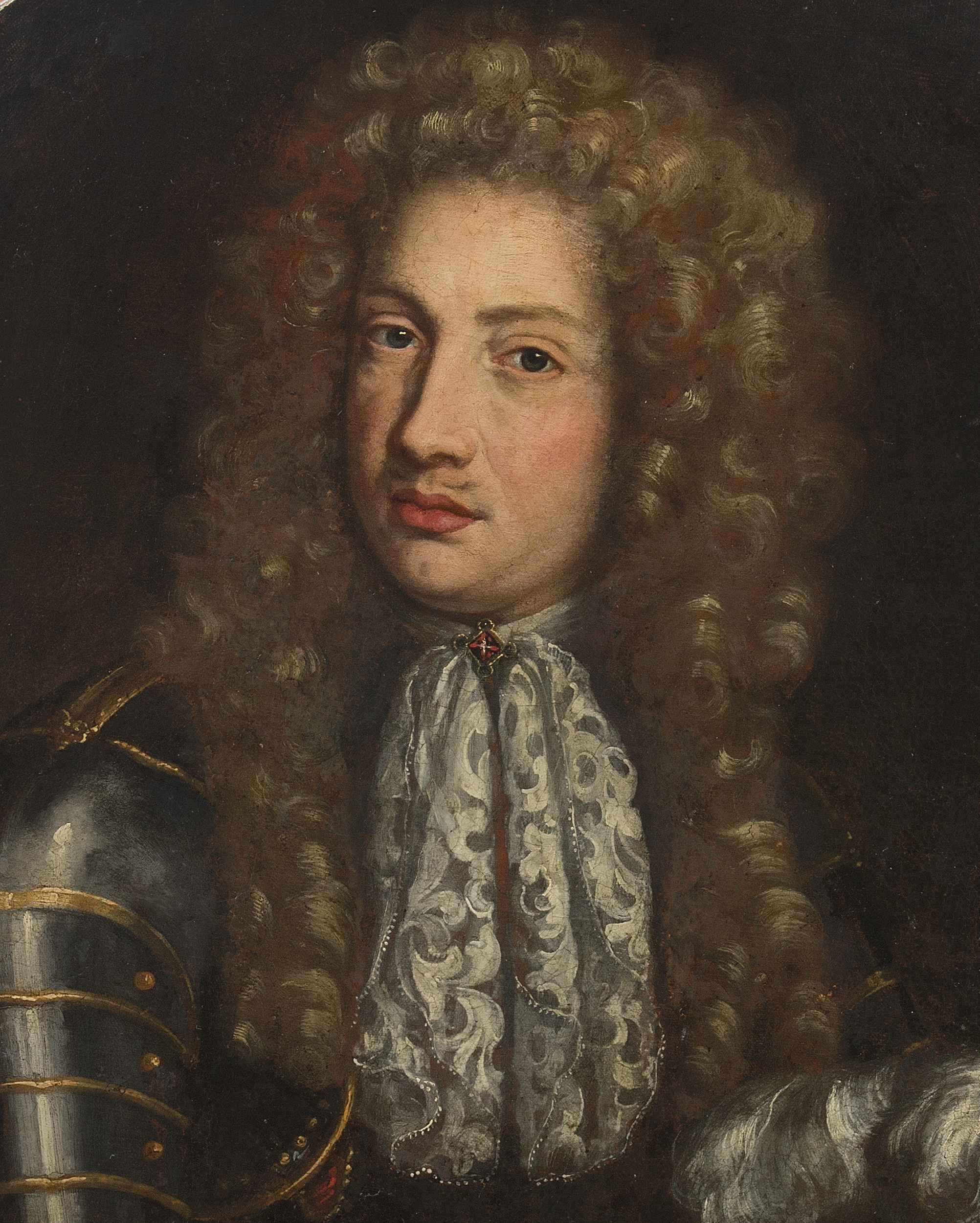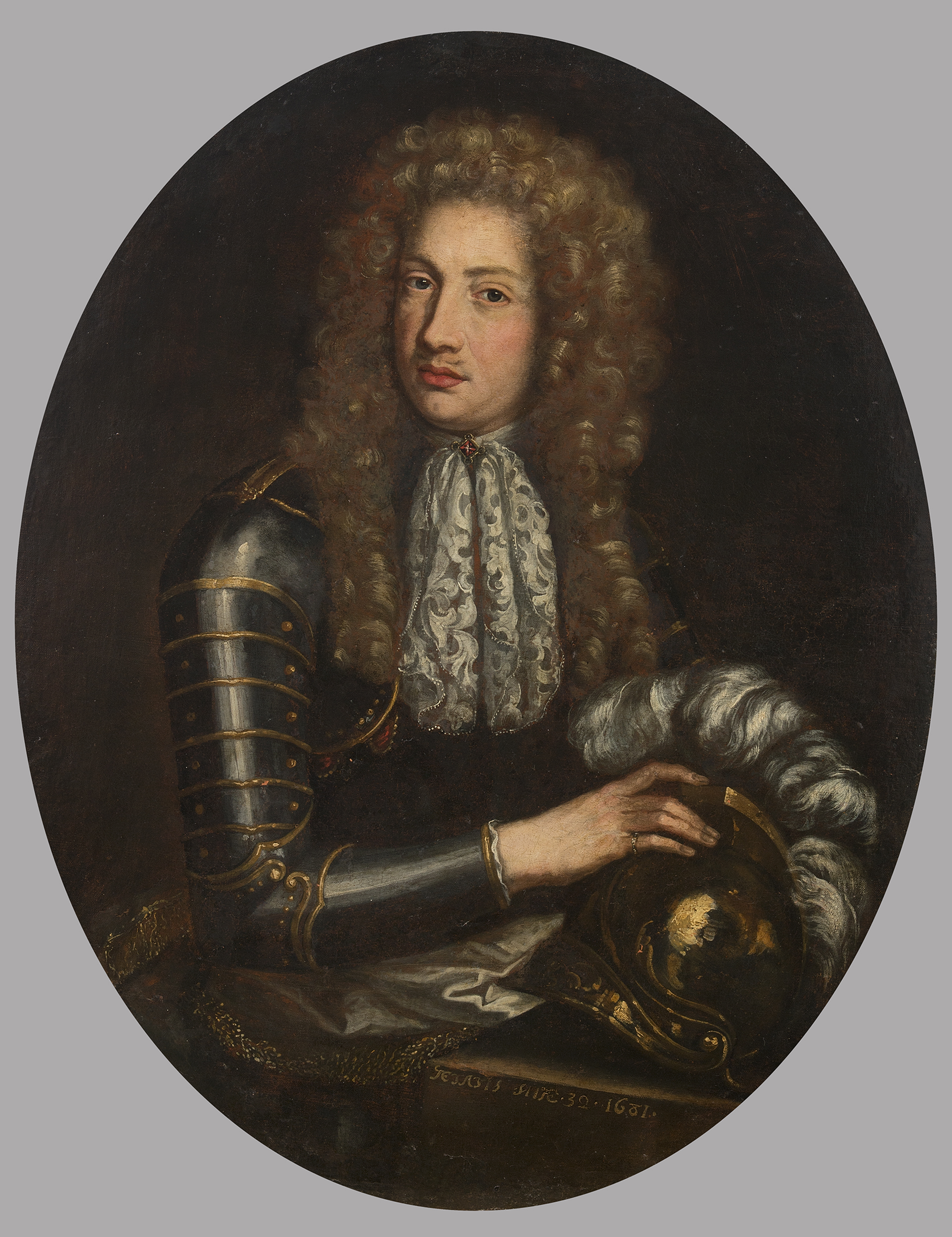 Zakomponowany w owalu portret francuskiego eleganta utrzymany jest w konwencji zachodniego malarstwa dworskiego. Przygarbiony mężczyzna ubrany jest w lśniącą zbroję, prawą ręką przytrzymuje leżący na podwyższeniu hełm ze strusimi piórami. Tors mężczyzny przykrywa upięty broszą na szyi koronkowy żabot. Na głowie peruka à la lion. Ukazany w ruchu. Zawężona do brązów, szarości i różu paleta barw w zupełności wystarczyła do wykończenia tego dzieła. Poniżej hełmu napis żółtą farbą kursywą: „Aetatis suae 32. 1681". Na rewersie obrazu napis wykonany czarną farbą (z XIX w.): „Montgomery” (nazwisko portretowanego).