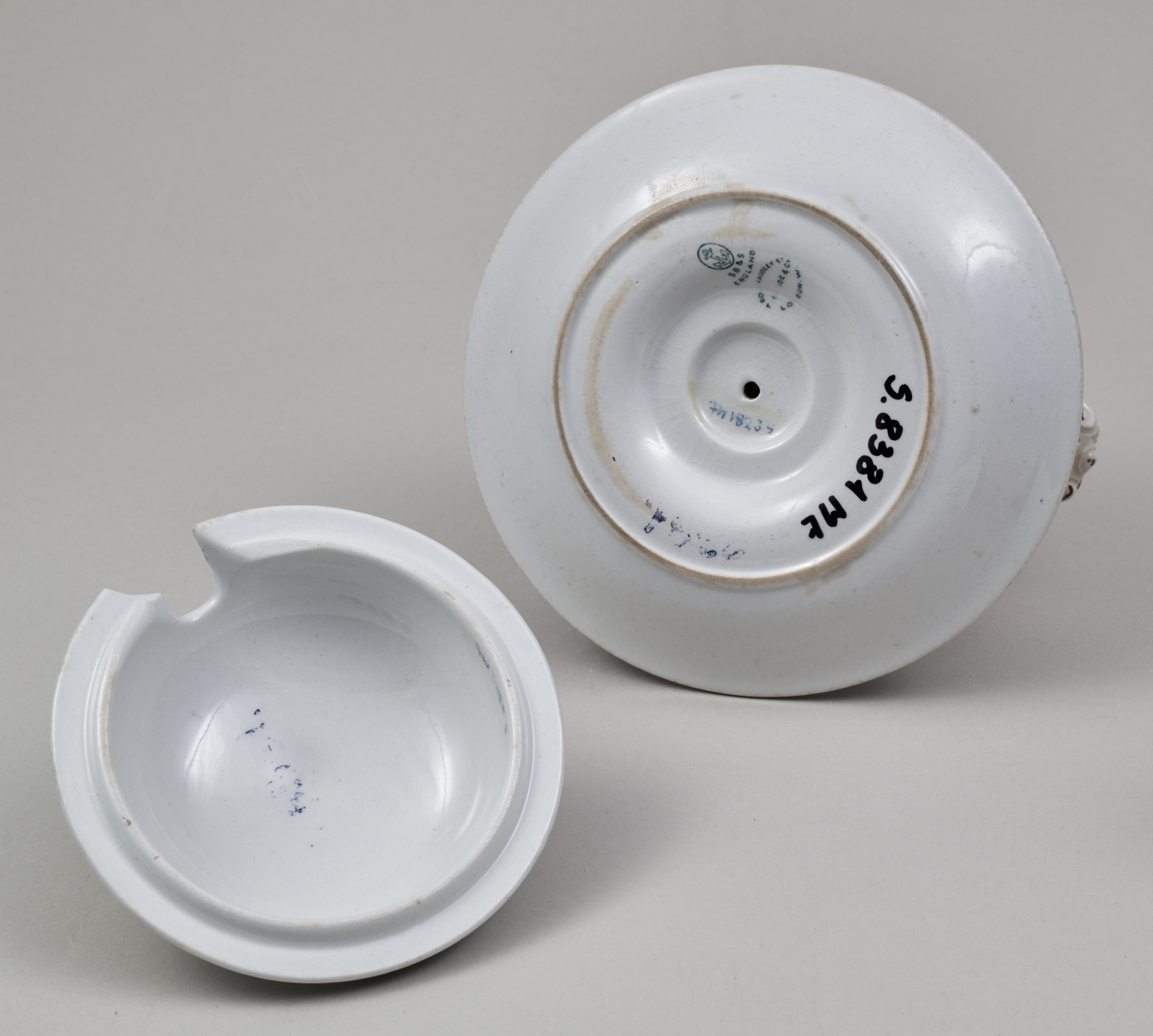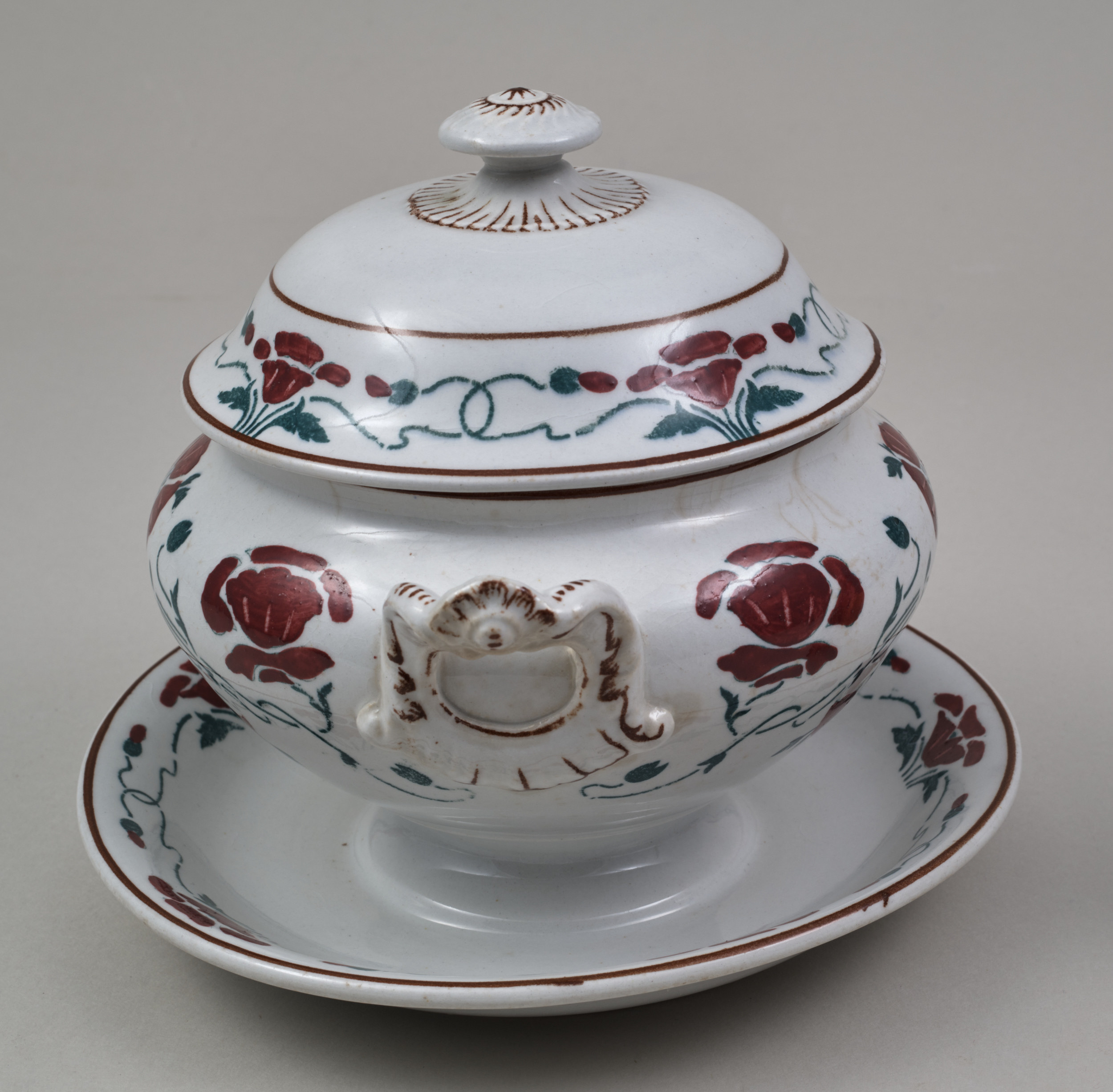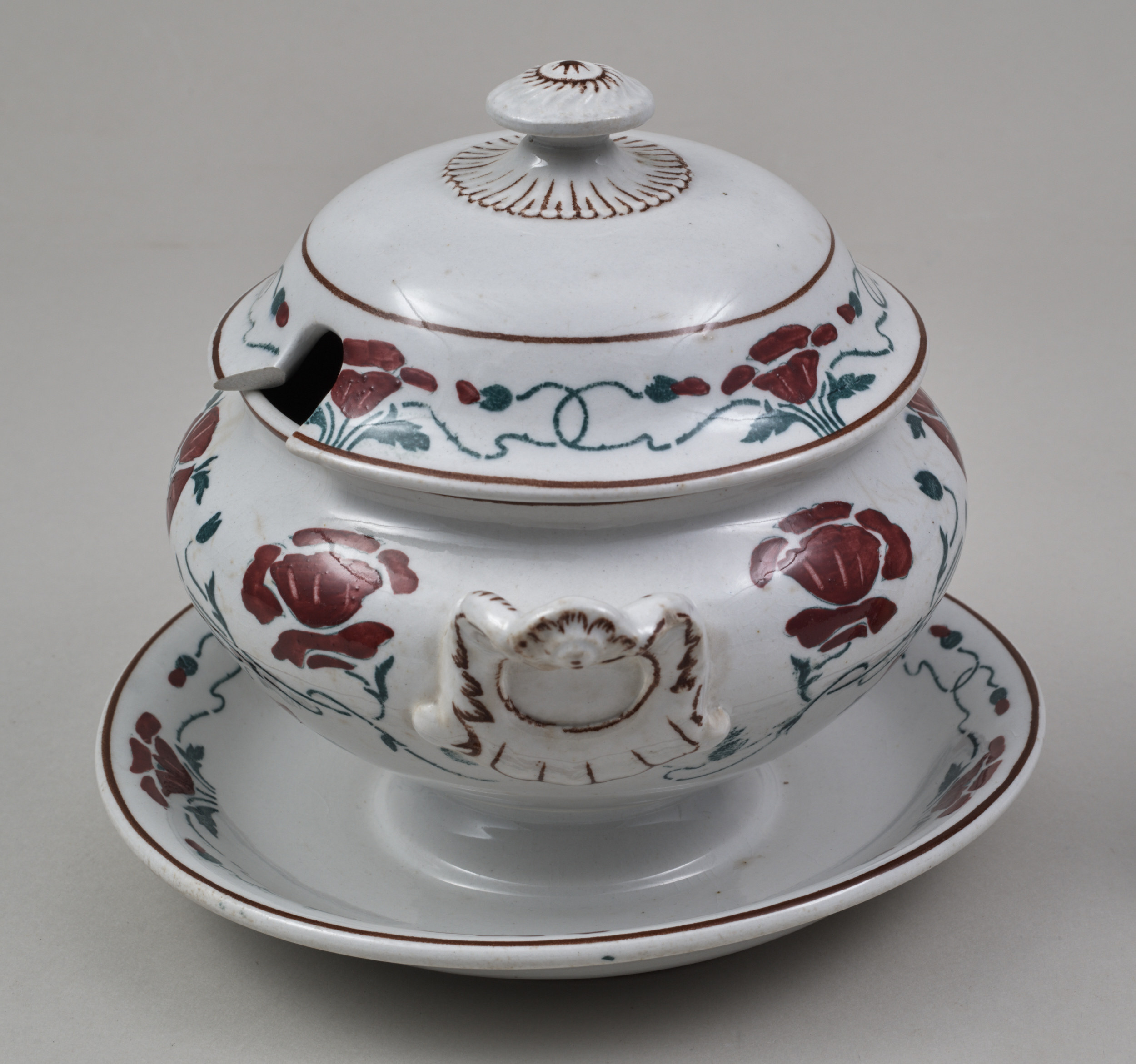 Sosjerka – niewielkie, fajansowe naczynie do sosów, założone na planie koła, składające się z pękatej wazki, jednorodnie połączone z miseczkowatą podstawką w rodzaju spodka i kopulastej pokrywki, mające wcięcie na łyżkę. Wazka stożkowo rozszerza się ku górze, gdzie po uzyskaniu odpowiedniego wybrzuszenia, raptownie przewęża się w otwór, natomiast dołem posiada zaznaczoną małą stopkę, która w wypadku gdyby naczynie było wolnostojące, nie zapewniałoby mu statyczności. Na szczycie wybrzuszenia wazki umiejscowione dwa pionowe uchwyciki, które swą formą przypominają ozdobny kartusz (dwa wolutowe ramiona górą spięte guzem-kwiatem, dołem wachlarzowatym grzebieniem) uplastyczniony motywem kwiatu i piór z liści oraz podrysowanych brązem. Pokrywka uwypukla się na bliskiej odległości od brzegu i kończy guzowatym uchwytem, mającym za podstawę dużą, drobnolistną rozetę, nałożoną na spłaszczony szczyt wypukłości. Czoło uchwytu i jego podstawę pokrywa reliefowy motyw drobnych płatków, które na czole tworzą niniejszą rozetę. Relief ten częściowo podrysowany jest brązem. Brzeg pokrywki wystaje poza obręb otworu wazki, a w otworze utrzymuje się ona poprzez otokową wypustkę, która, podobnie jak i fragment płaszczyzny pokrywki, przerywa dość głębokie, łukowate wcięcie na łyżkę. Naczynie zdobi dekoracja malarska złożona z dwubarwnego wzoru maków stylizowanych w duchu umiarkowanej secesji. Wzór naniesiony mechanicznie przez szablon. Na brzuścu wazki, z obydwu jej stron, występuje dekoracja w postaci umownego bukietu, złożonego z 5 kwiatów, z których jeden stanowi oś kompozycji. Natomiast wokół brzegu pokrywki i miseczkowatej podstawki wzór przyjmuje układ pasowy. Na ogniwo wzoru składa się kwiat altermowany dwoma pączkami. Wzór na pokrywce przebiega pomiędzy dwoma brązowymi prążkami. Podobny brązowy prążek otacza otwór wazki oraz brzeg miseczkowatej podstawki. Na odwrociu naczynia (podstawki) znajdują się dwa firmowe znaki w zielonym pieczętnym nadruku - sygnatura warsztatu: kotwica w owalnej tarczy, pod nią napis: S.B. & S / ENGLAND i sygnatura magazynu londyńskiego SOUTH AUDLEY S/ T. GOODE & Co / LONDON. W. W znacznej odległości od sygnatur widoczna bardzo krótka i cienka bordowa kreseczka.