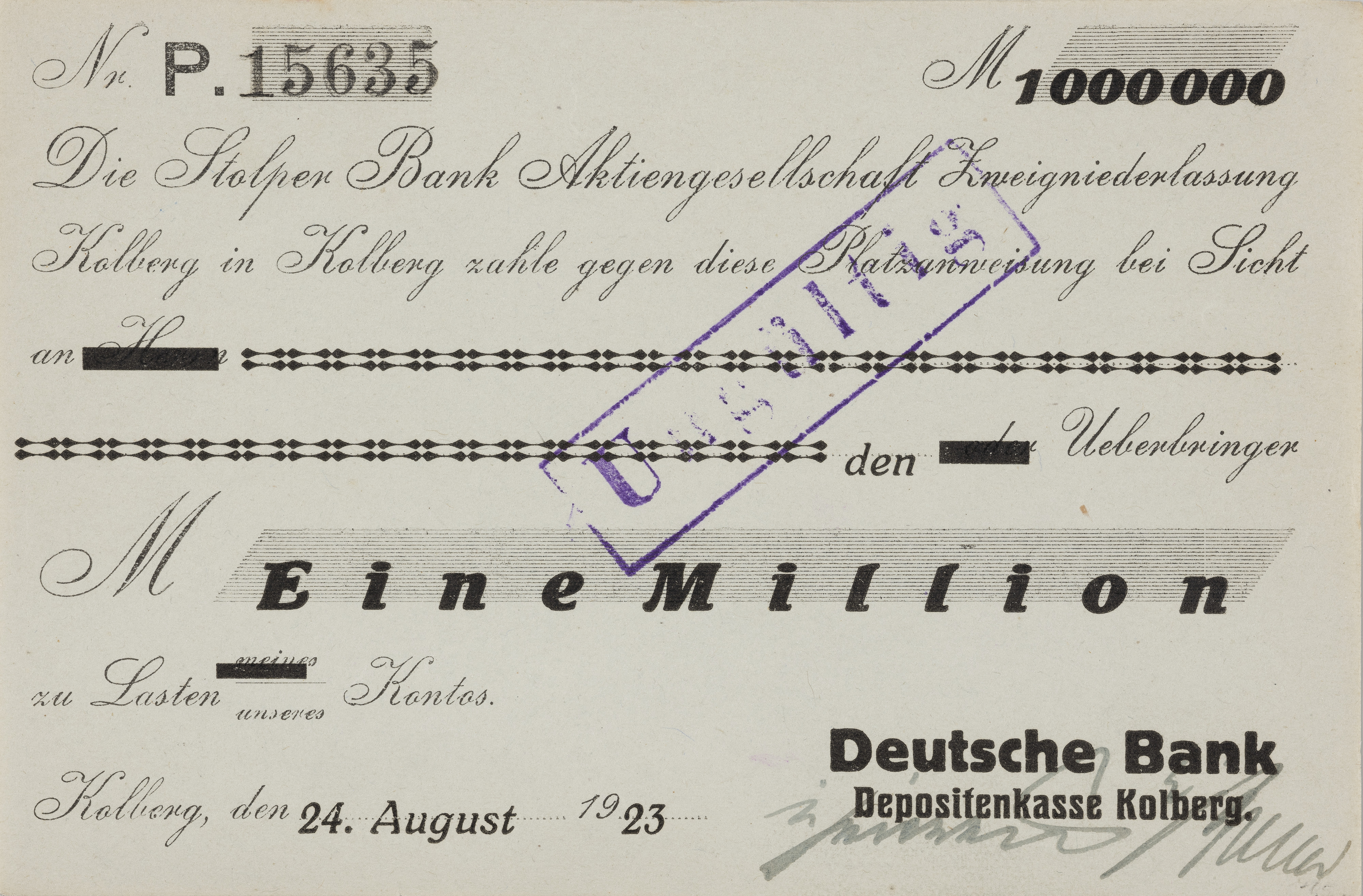 Przedstawiony formularz czekowy opatrzony datą 24 sierpnia 1923 roku i kwotą 1 miliona marek, firmowany przez kołobrzeską Kasę Depozytową Banku Niemieckiego wystawił oddział kołobrzeski Banku Słupskiego S. A. Podobne czeki na kołobrzeską Kasę Depozytową Banku Niemieckiego wystawiał także sam Bank Słupski S. A. w Słupsku. Były to tak zwane czeki krzyżowe, dość częsta praktyka wśród współpracujących ze sobą niemieckich instytucji finansowych podczas inflacji.
