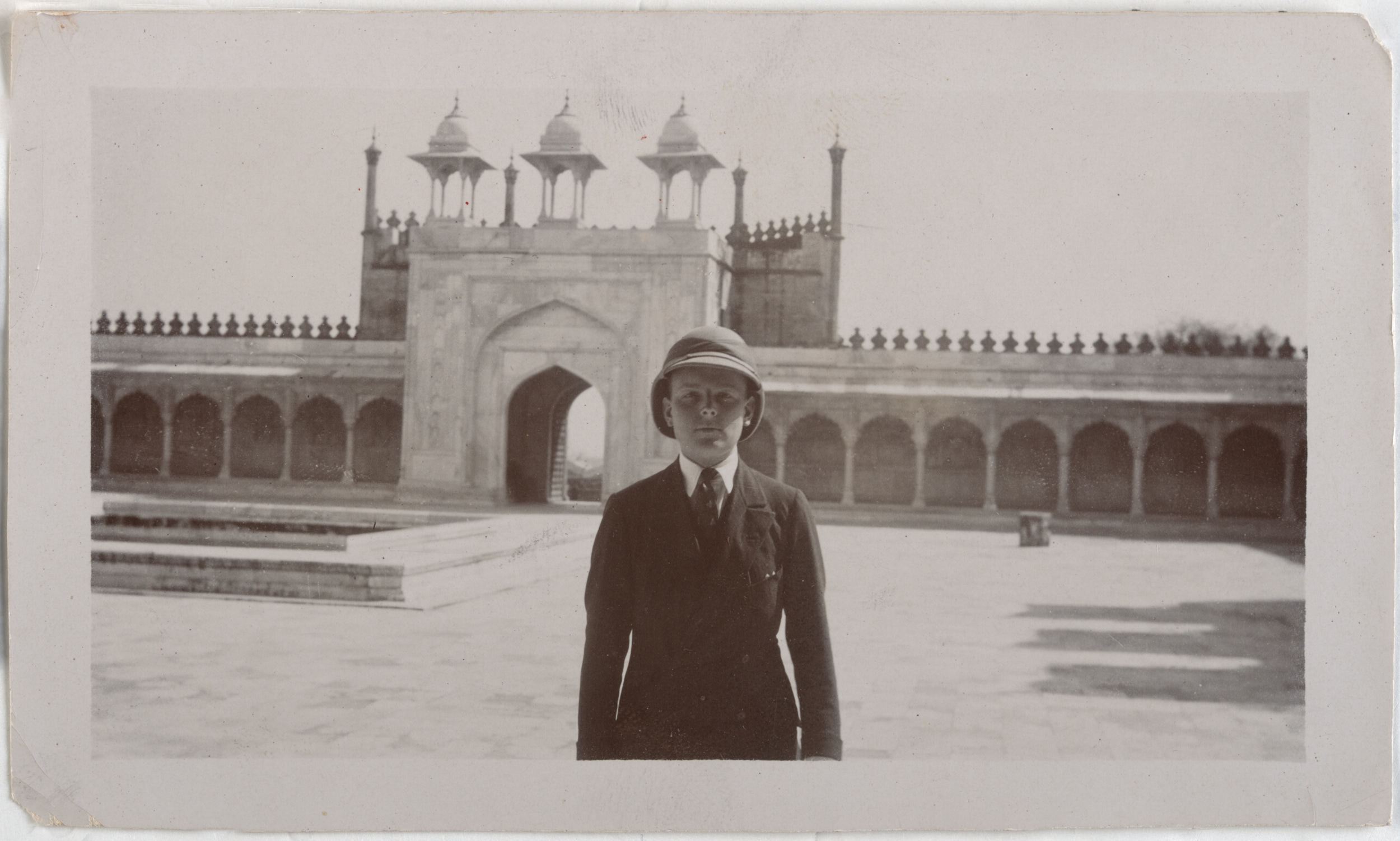 Fotografia przedstawiająca Alfreda Antoniego Potockiego, przyszłego IV ordynata łańcuckiego. Alfred Potocki w półpostaci (w planie amerykańskim), w ciemnej marynarce i białej koszuli z ciemnym krawatem i w tropikalnym hełmie na głowie stoi na dziedzińcu pałacu, który widoczny jest w tle powozu Fotografia wykonana w 1910 roku podczas podróży Alfreda Potockiego do Indii.