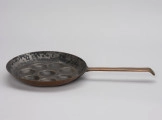 Patelnia wykonana jest w całości miedzi – materiału, który bardzo dobrze przewodzi ciepło, co zapewnia szybkie i równomierne smażenie. Wadą miedzi jest to, że w kontakcie z niektórymi produktami spożywczymi wytwarza szkodliwe dla zdrowia substancje, żeby tego uniknąć wnętrza wykonanych z niej naczyń bielono cyną. Naczynia z miedzi, nie tylko patelnie, ale też rondle, brytfanny, formy na ciasto, dzbany czy czajniki ceniono nie tylko za funkcjonalność, ale także za walory estetyczne. Były uznawane za prawdziwą ozdobę kuchni, jednak ze względu na wysoką cenę nie każdy mógł sobie na nie pozwolić. Ten fakt znajduje aktualnie odzwierciedlenie także i w zbiorach muzealnych. Używanych dawniej na Pomorzu Zachodnim miedzianych naczyń zachowało się bowiem stosunkowo niewiele.