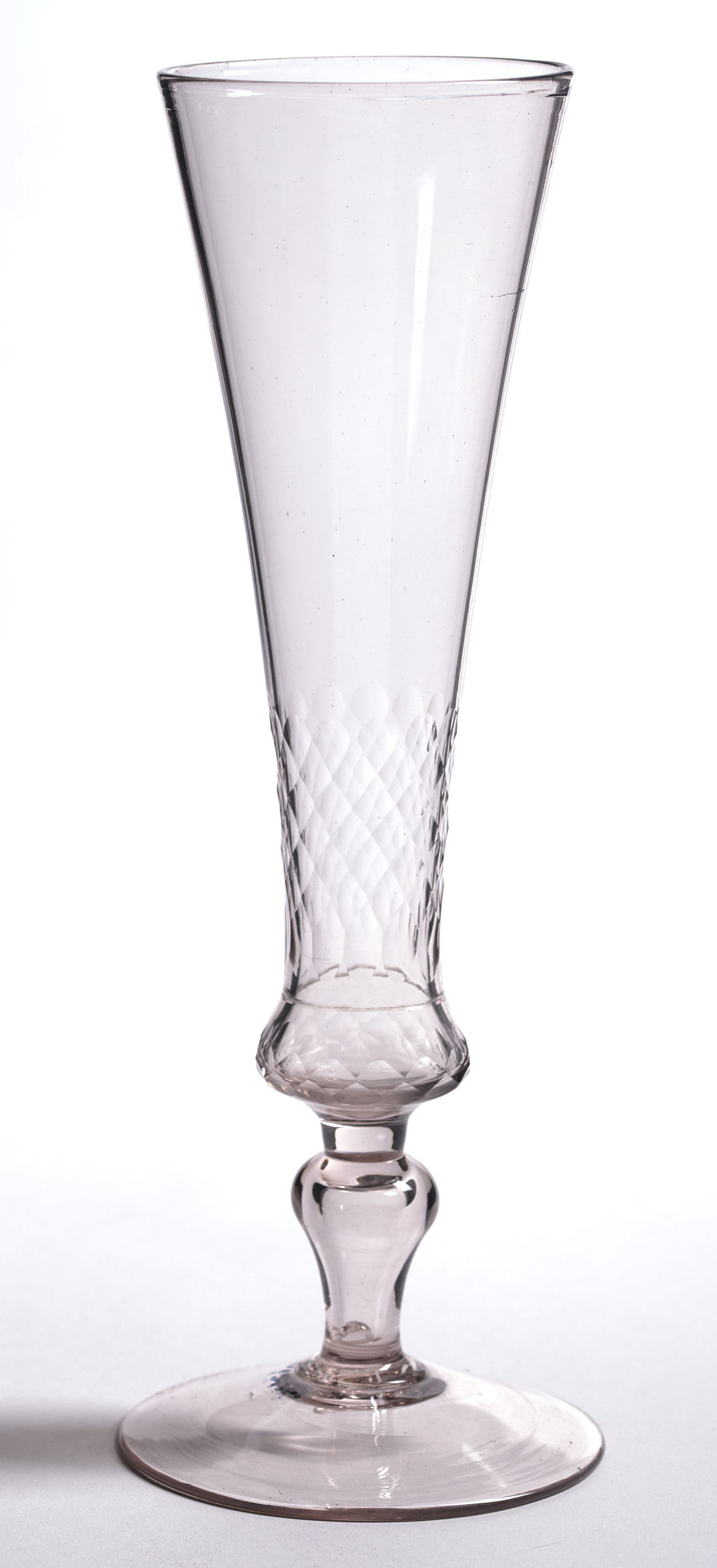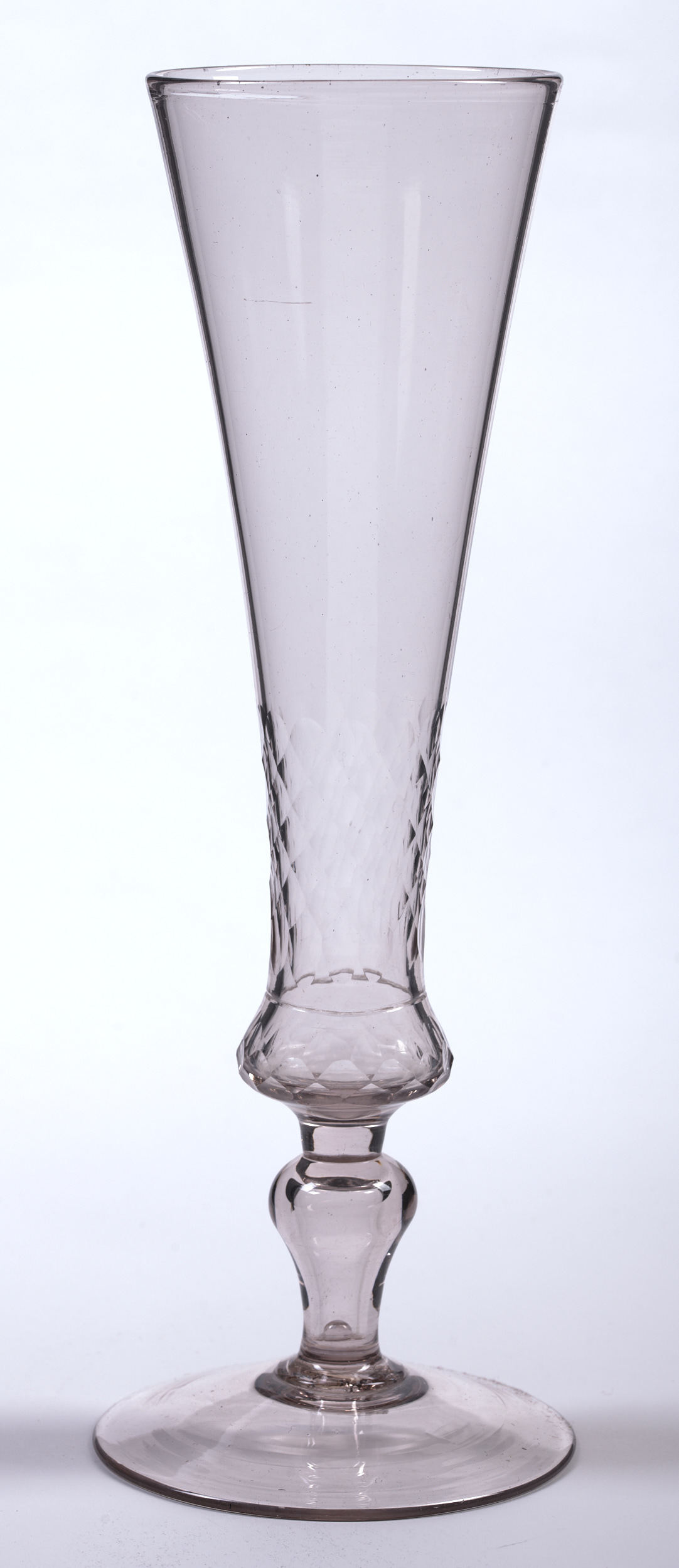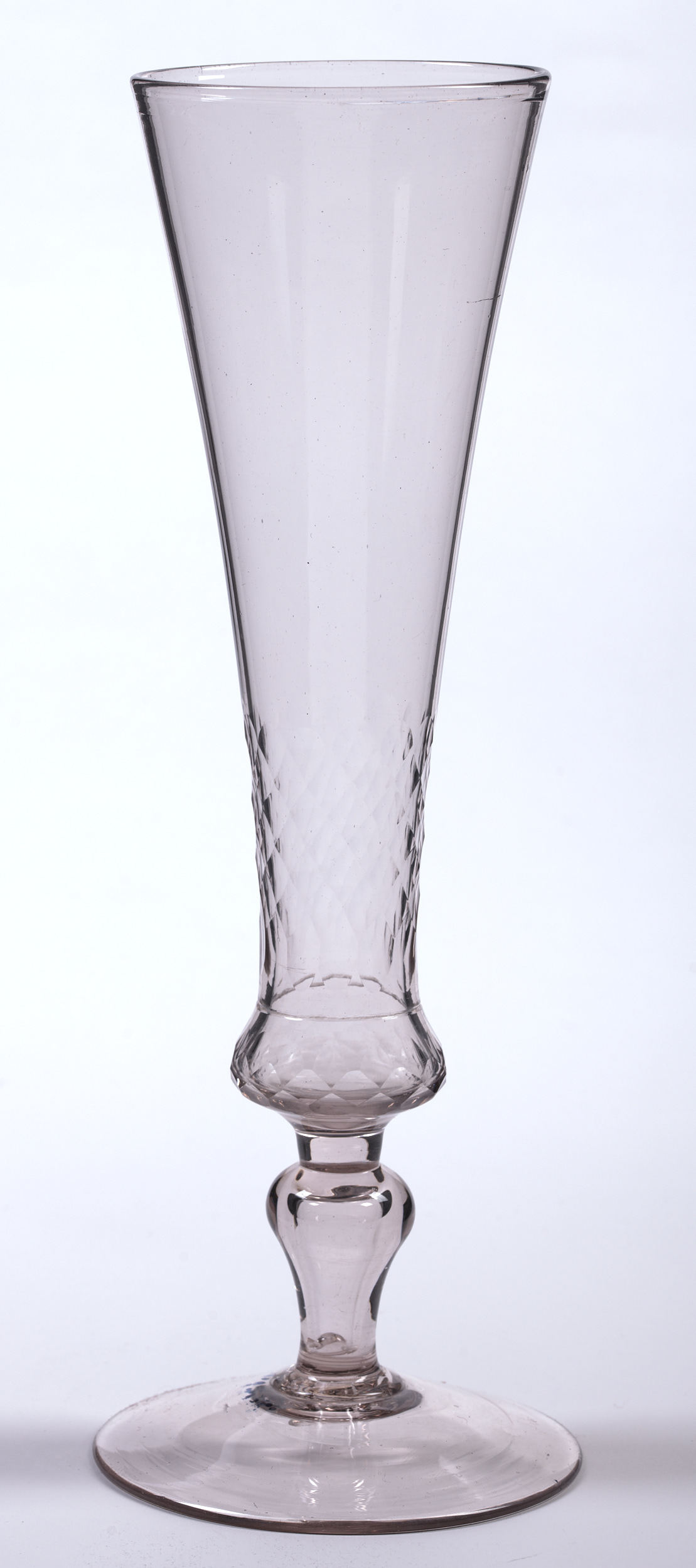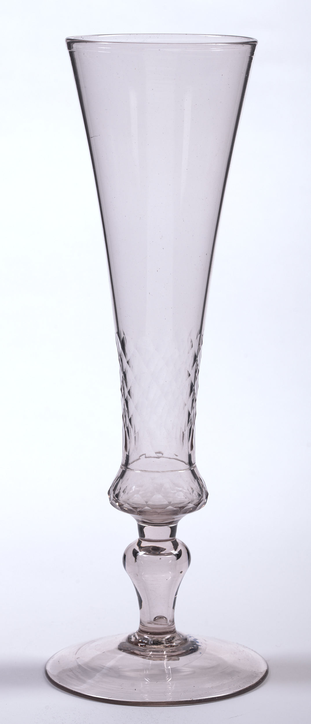 Kielich – flet wykonany został w latach 1720-1730, przypuszczalnie w manufakturze szkła pod Lubaczowem, zwanej Hutą Kryształową, założoną w 1717 r. przez hetmana Adama Mikołaja Sieniawskiego. Był on żonaty z Elżbietą Lubomirską, córką Stanisława Herakliusza Lubomirskiego, właściciela Łańcuta w latach 1699-1702. W zbiorach szkła polskiego w Łańcucie najliczniejsza jest grupa zabytków z tejże pobliskiej huty. Była to jedna z najstarszych polskich manufaktur szkła, która w produkcji swoich wyrobów osiągnęła bardzo wysoki, europejski poziom ich wykonania. Kierował nią Franciszek Fremel, znakomity specjalista saski, sprowadzony do Polski w 1710 r. przez Augusta II Sasa. Huta czynna była przez cały wiek XVIII. Wyrabiano w niej szkła stołowe i świeczniki. Wśród kielichów wiwatowych charakterystyczne były flety do szampana, o wąskiej i wysmukłej czarze na tralkowym trzonie i okrągłej stopie. Powyższy kielich wykonany został ze szkła zabarwionego fioletem. Jest to kielich z dużą, okrągłą stopą, z tralkowym, dętym trzonem, o wysmukłej, stożkowatej czarze dołem wybrzuszonej. Dolna część czary oszlifowana rombowymi, podłużnymi fasetami.