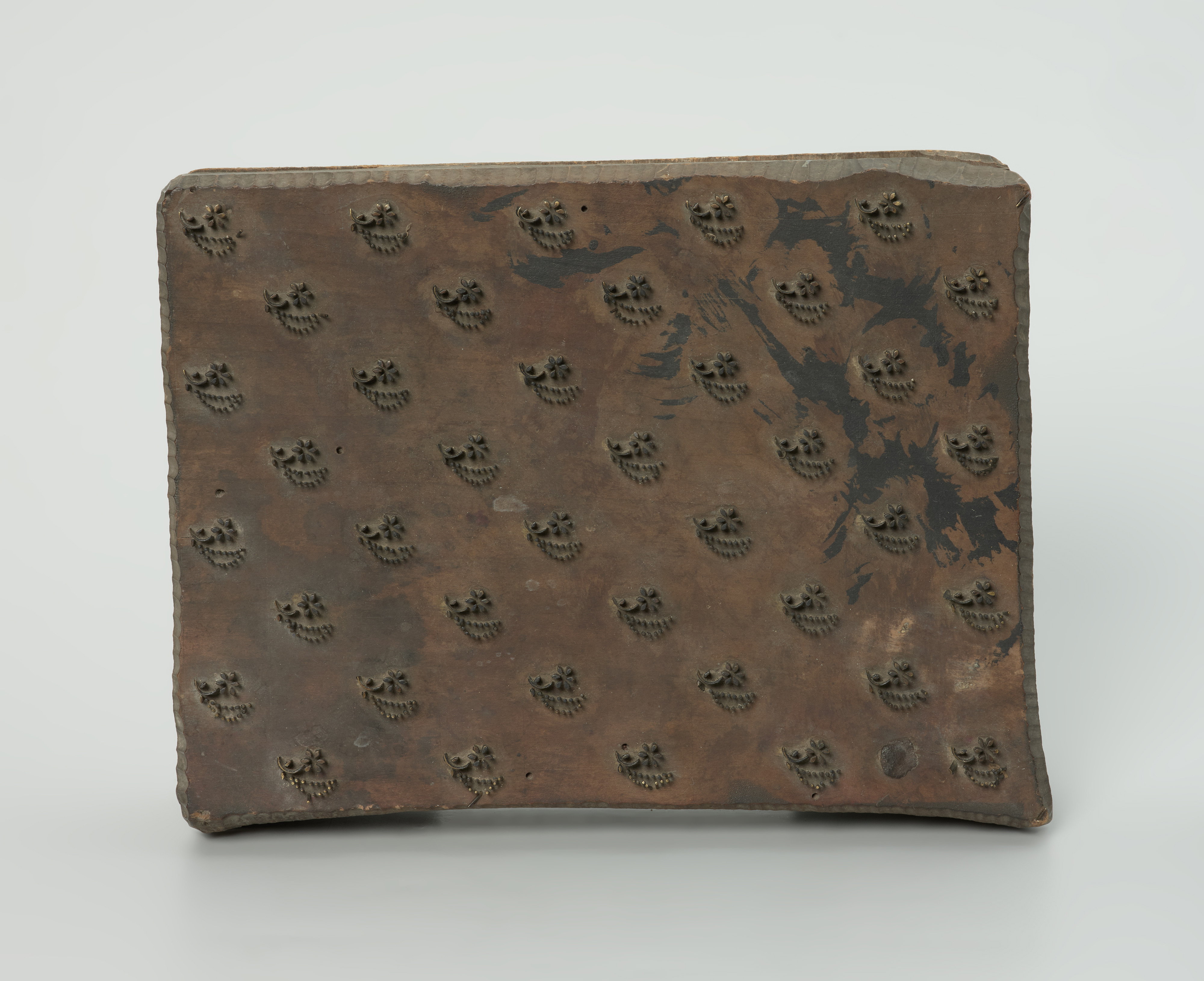 Drukarstwo tekstylne, znana do dawna technika zdobienia tkanin, do Europy dotarło ze Wschodu. Warsztaty drukarskie działały zarówno w dużych miastach, jak i mniejszych osadach. Produkowane przez nie wyroby cieszyły się sporą popularnością wynikającą m.in. z umiejętnego naśladownictwa drogich materiałów szlachetnych. Dzięki temu, że drukowanie na tkaninach nie wymagało wielu narzędzi zajmowali się nim również wędrowni rzemieślnicy, zaspakajający zapotrzebowanie na „drukowanki” mieszkańców wsi. W miastach rozkwit ręcznego drukarstwa tekstylnego został zatrzymany w okresie rozwoju manufaktur. Część rzemieślników przeniosła się wtedy na prowincję, gdzie popyt na ich wyroby wciąż był duży. W połowie XIX stulecia w wielu regionach, w tym na Pomorzu, istniało wiele lokalnych farbiarni. W miarę zalewu targów tkaninami fabrycznymi krąg odbiorców ręcznych druków kurczył się i ostatecznie małe pracownie nie wytrzymały konkurencji z nowoczesnym przemysłem tekstylnym. W warsztatach drukarskich, obok prostej metody polegającej na bezpośrednim odciskaniu na tkaninie wzoru z formy pokrytej farbą, stosowano technikę druku batikowego. Polegała ona na odbijaniu na materiale masy izolującej, która chroniła pokryte nią miejsca przed działaniem barwnika. W efekcie otrzymywało się niebarwiony ornament na kolorowym tle. W drukarstwie tekstylnym używano specjalnych form, z czasem wytwarzanych z coraz większym kunsztem. Prezentowana matryca ma przedstawiający rozmieszczone w układzie szachownicowym drobne kwiatki ornament, który wykonany jest w całości z nabitych w drewno mosiężnych sztyfcików i blaszek. Formy z wykonanymi tą techniką wzorami pojawiły się dopiero w XIX wieku. Początkowo motywy zdobnicze wykonywano w całości w drewnie, stopniowo zaczęto dokładać do nich drobne, metalowe elementy. Z czasem całkiem zastąpiły one ryty wzór.