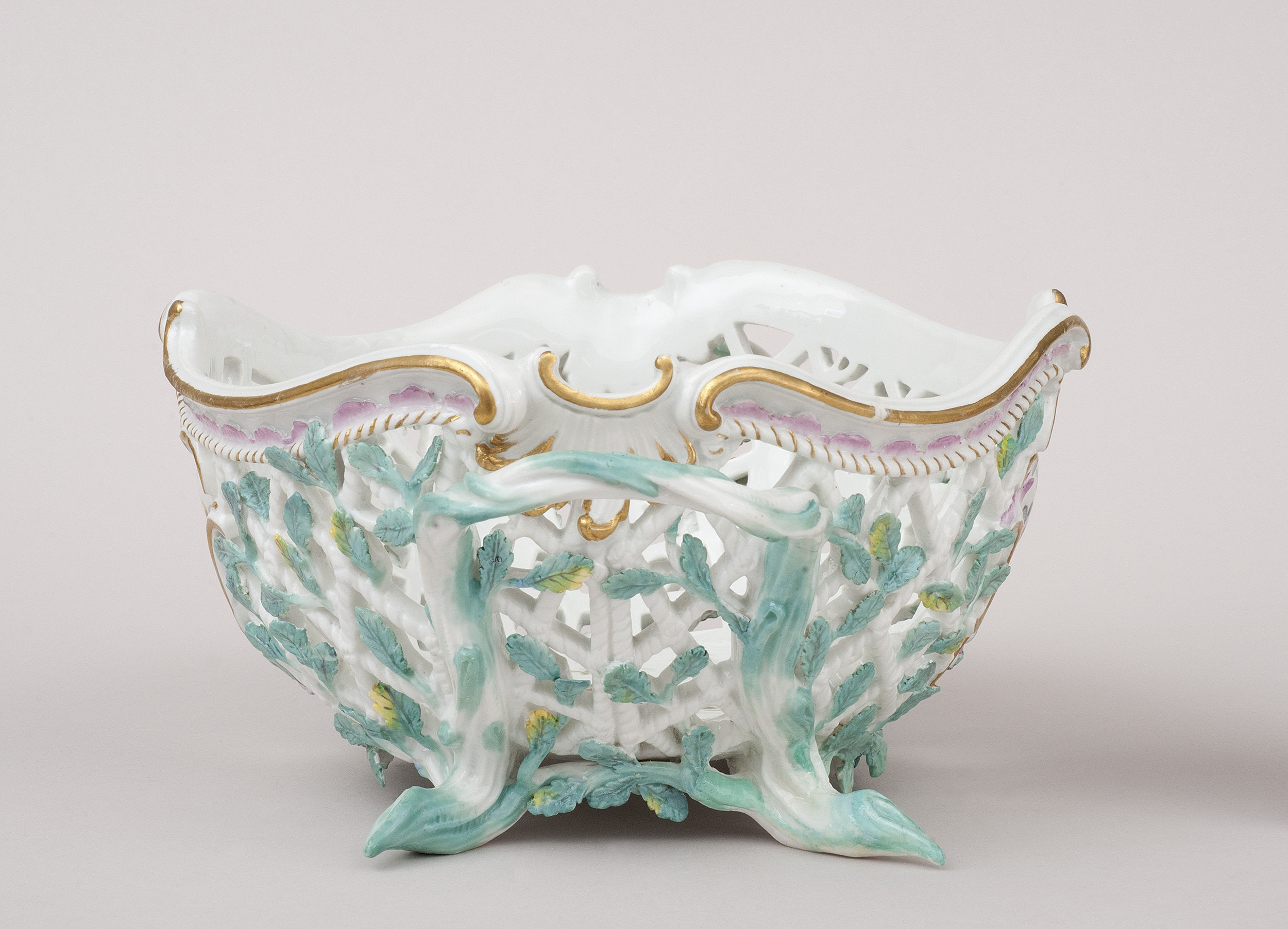 Porcelanowy koszyk z nałożonymi na ażurową plecionkę zielonymi gałązkami z listkami przypominającymi dąb. Gałązki tworzą także uchwyty i nóżki koszyka. W kolekcji wilanowskiej znajduje się para tych delikatnych wyrobów (Wil.4157 oraz Wil.2045).