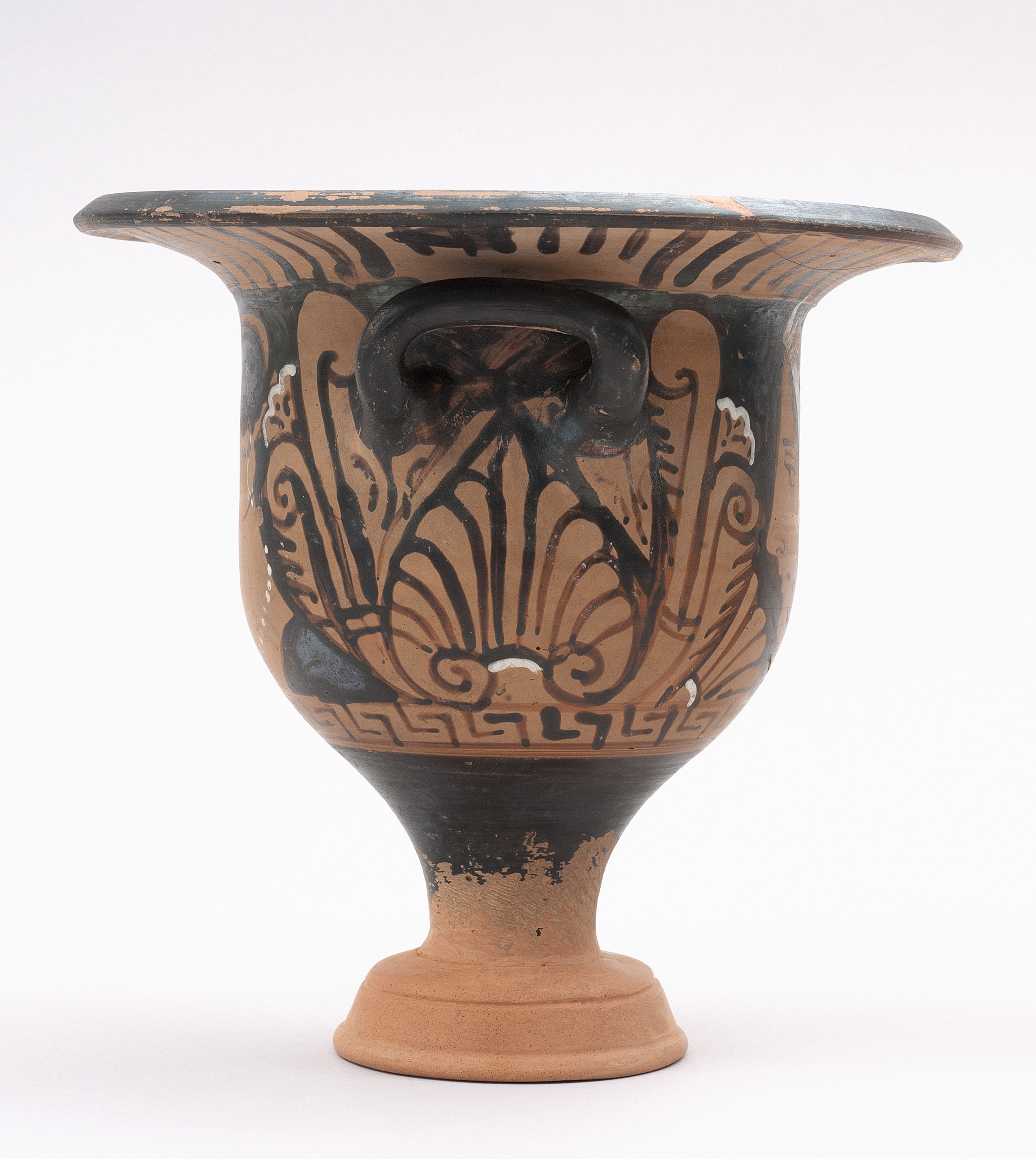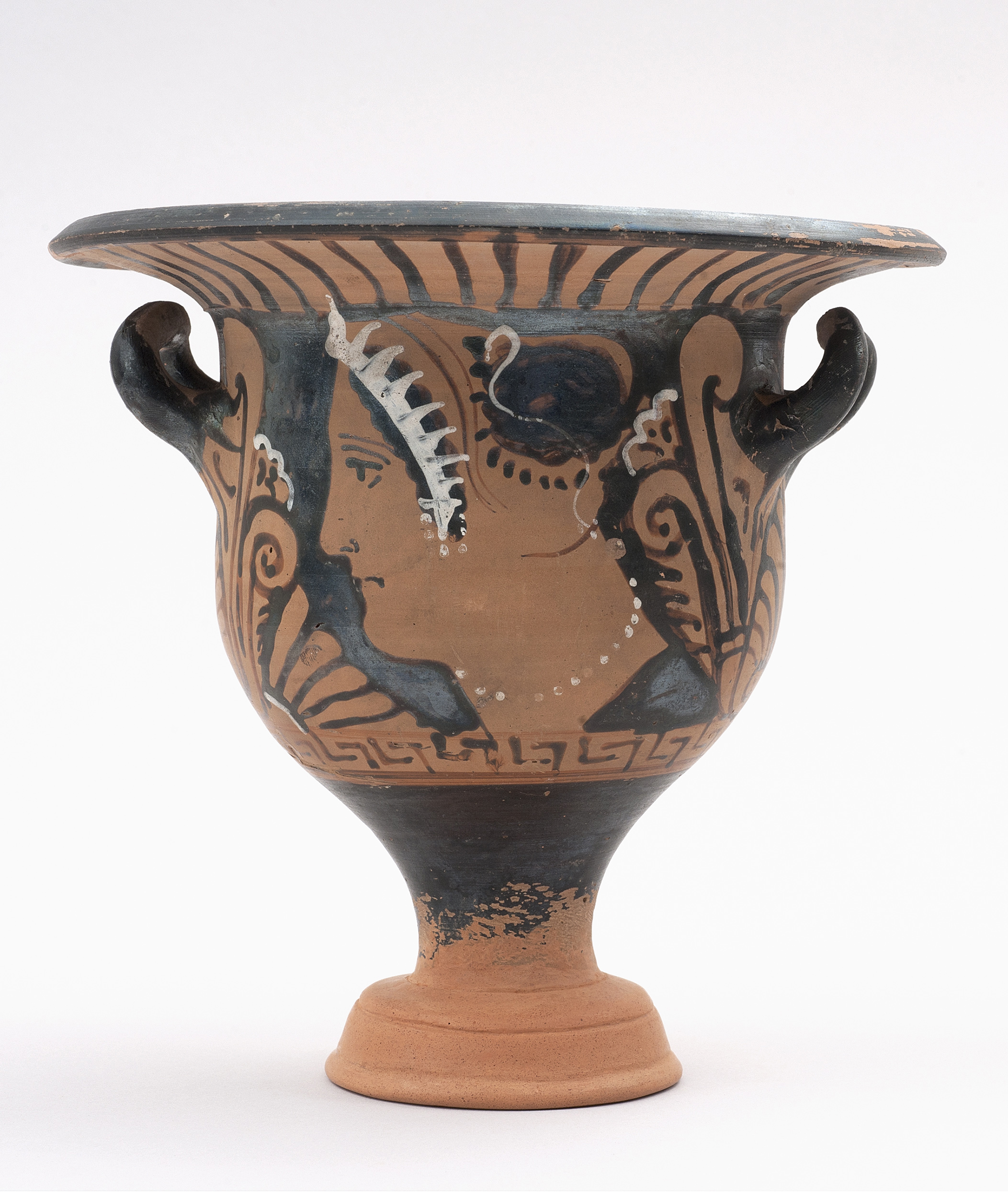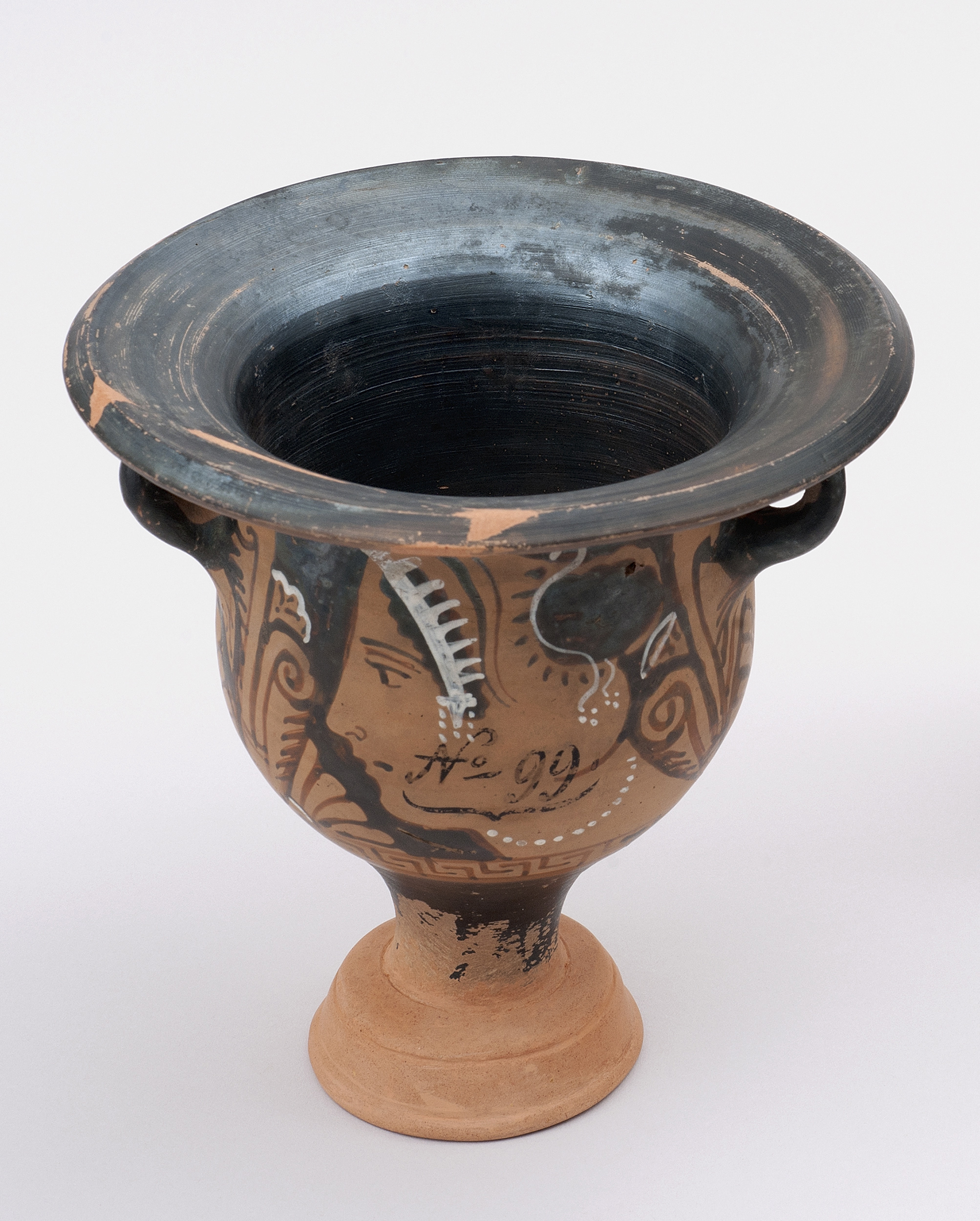 Starożytni Grecy pili wino zmieszane z wodą, a zwyczaj ten wymagał stworzenia odpowiednich naczyń do łączenia obu płynów – kraterów. Za względu na ich rozpowszechnienie istnieje bardzo wiele wariantów tej formy. Są to jednak zawsze pojemniki głębokie, o szerokiej i niskiej szyi (co ułatwiało korzystanie z nich) zwykle na niskiej stopce, z dwoma uchwytami (zwanymi imadłami). Ze względu na ich charakterystyczne kształty wyróżnia się kilka typów kraterów, takich jak: kolumienkowy, wolutowy, kielichowy czy dzwonowaty. Zabytek wilanowski należy do tego ostatniego – najprostszego, a także wykształconego najpóźniej, a jednocześnie najbardziej popularnego na terenach Południowych Włoch, gdzie najprawdopodobniej powstał. Wilanowskie naczynie ma wysoką nóżkę i kielichowaty brzusiec z dwoma imadłami (uchwytami). Jego powierzchnię zdobią dosyć często spotykane przedstawienia namalowane w technice czerwonofigurowej. Są to dwie kobiece głowy ukazane w lewym profilu, rozmieszczone po obu stronach brzuśca. Obie damy mają na spiętych włosach czepki, a także biżuterię – diademy i korale malowane bielą. Po bokach krateru (pod imadłami) dekorację uzupełniono o palmety, a pod przedstawieniami figuralnymi pas meandra.