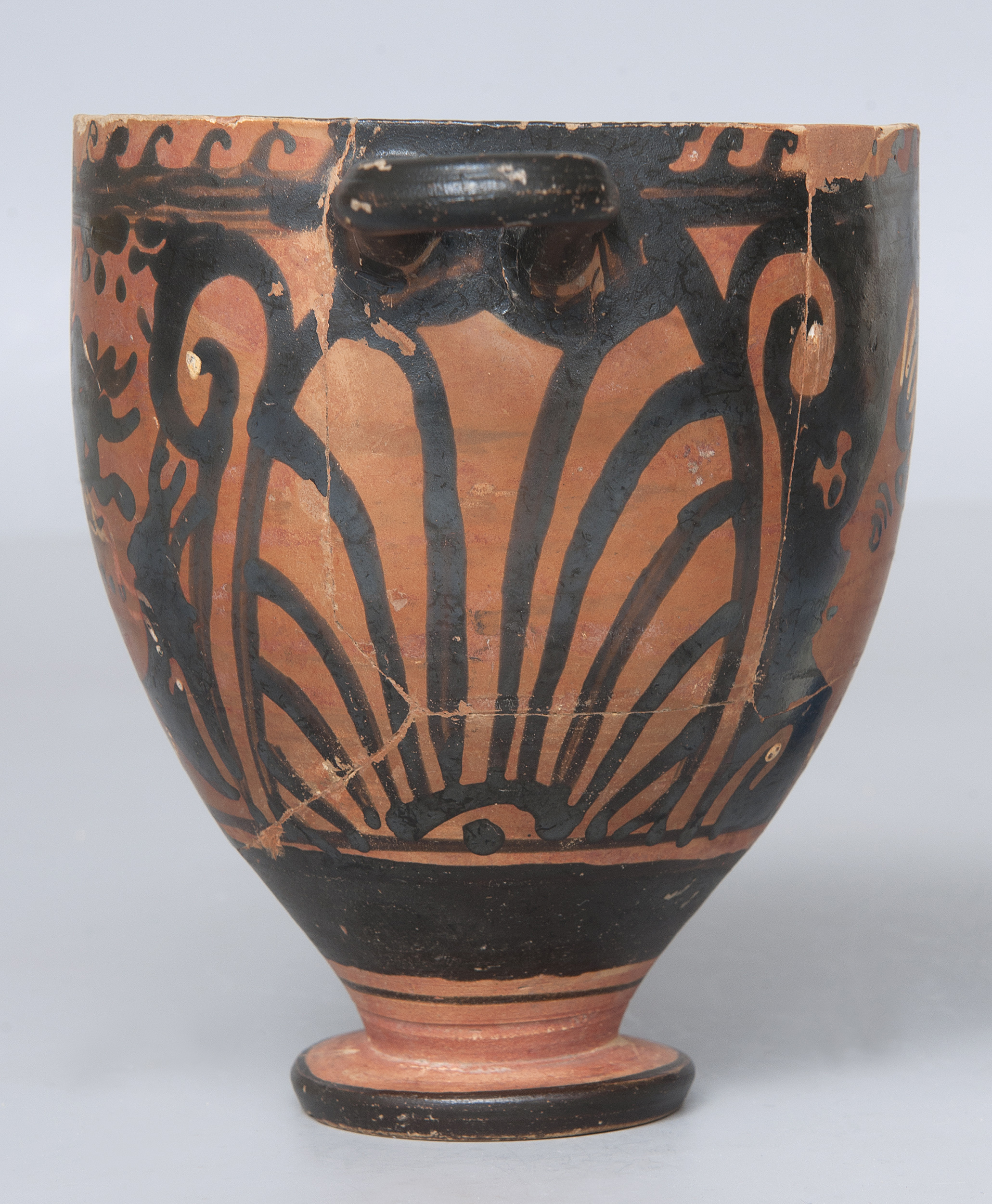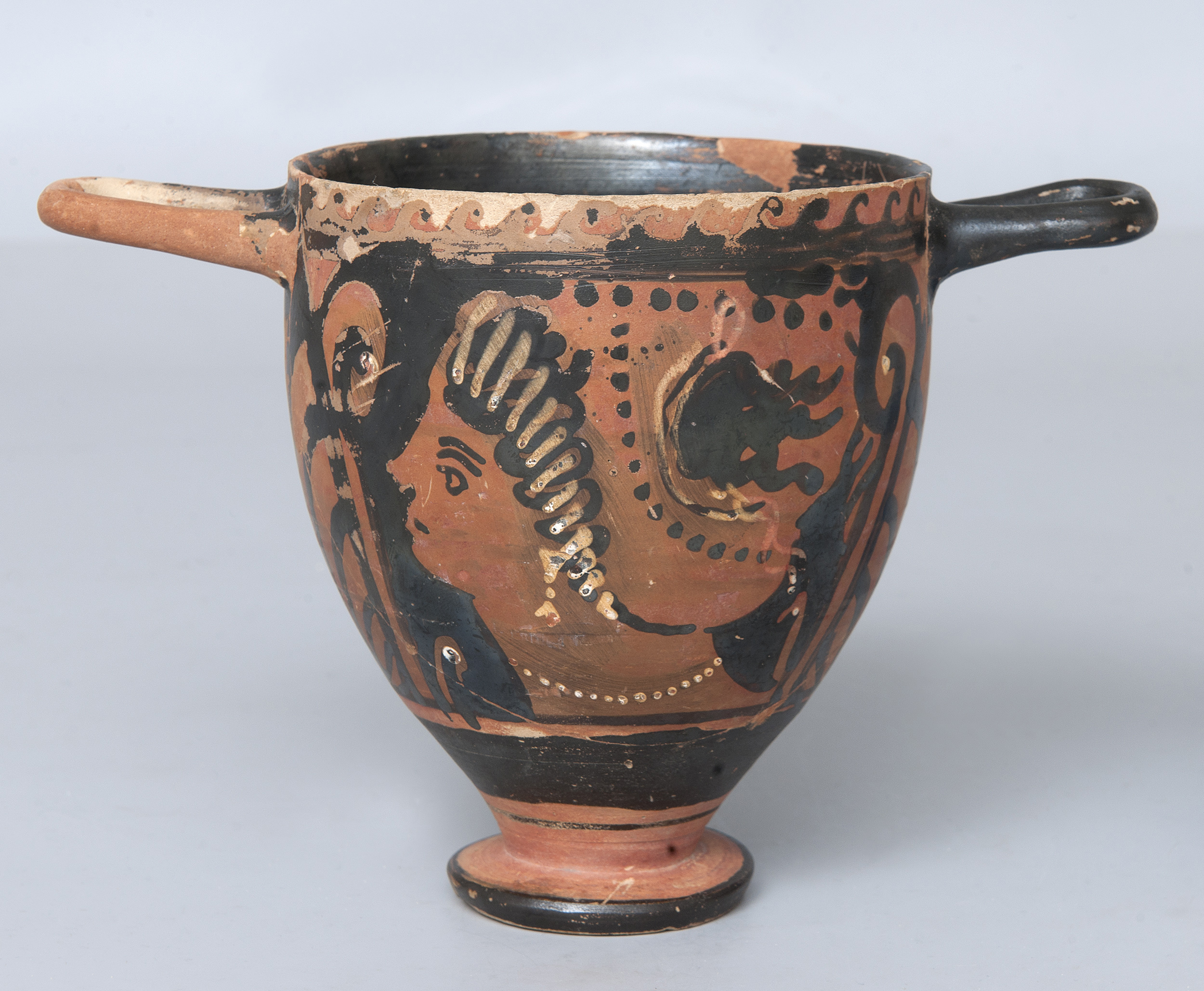 W ceramice Starożytnej Grecji istniało wiele kształtów naczyń przeznaczonych do picia wina. Szeroko rozpowszechnione były m.in. skyfosy, o kształcie kubków na cylindrycznych stopkach z dwoma uchwytami. Taki właśnie typ reprezentuje zabytek wilanowski. Powierzchnię naczynia zdobią dosyć często spotykane przedstawienia namalowane w technice czerwonofigurowej. Po obu stronach skyfosu widnieją przedstawienia głów kobiecych w lewym profilu. Damy mają włosy schowane pod czepkami, a zdobi ją je diademy, kolczyki i korale, namalowane białożółtym, odcinającym się na tle innych kolorem. Dekorację uzupełniają popularne ornamenty – pod wylewem motyw tzw. goniących się fal, a pomiędzy uchwytami palmety.