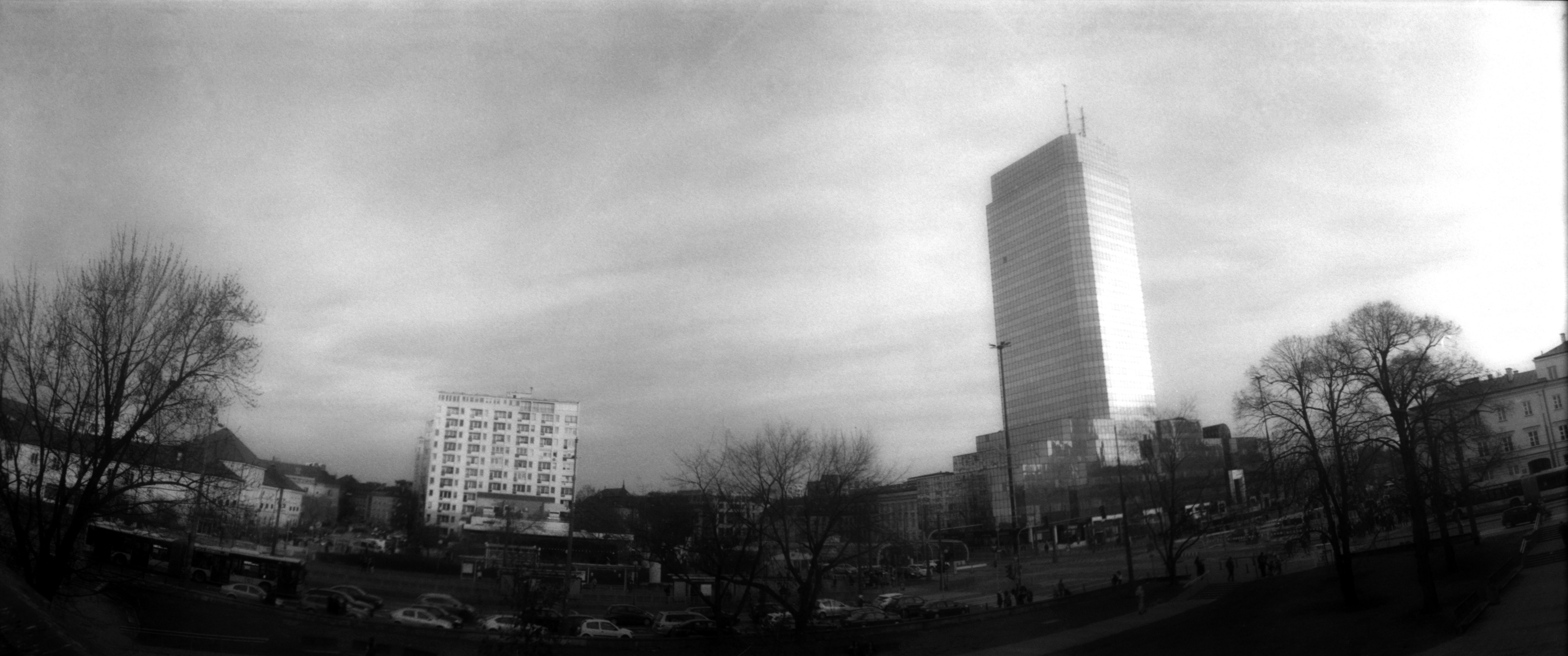 Drugie z ujęć prezentujące aktualny widok pl. Bankowego jak na fotografii MPOLIN-M1058, z dominującą bryłą „Błękitnego Wieżowca”. Kadr pokazuje plac w oddaleniu.
