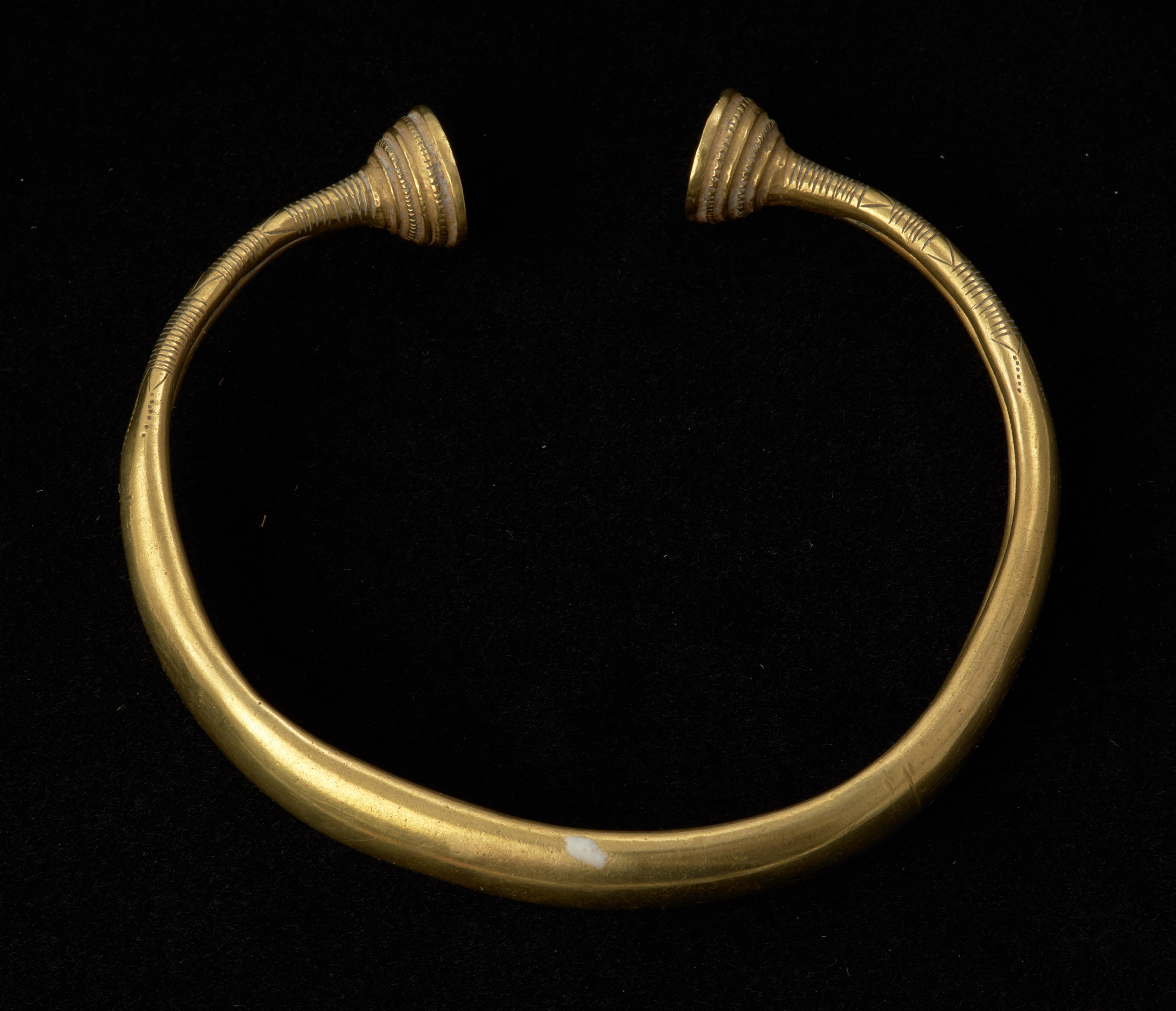 Ta piękna bransoleta wykonana została z grubej złotej blachy. Zwieńczona jest tzw. pieczątowatymi zakończeniami, ornamentowanymi efektownym dookolnym żebrowaniem. Kabłąk natomiast zdobią grupy poprzecznych nacięć i motyw zygzakowy. W literaturze archeologicznej ten typ bransolet określany jest jako goldene Eidringe, co tłumaczy się jako „pierścienie przysięgi”. Tę romantyczną nazwę wprowadził do literatury naukowej w 1837 roku duński badacz Christian Jürgensen Thomsen. Bransoleta należy do skarbu odkrytego podczas orki, prawdopodobnie około połowy XIX wieku. Cały depozyt składał się z trzech złotych bransolet jednego typu, które ukryto w glinianym naczyniu. Do zbiorów szczecińskiego Towarzystwa Historii i Starożytności Pomorza zakupiono go od właściciela majątku Drehera z Orla. Pod koniec drugiej wojny światowej skarb został ewakuowany na zachód Niemiec, gdzie został ukryty przed zniszczeniem lub rabunkiem. Do Szczecina bransolety powróciły w 2009 roku w efekcie polsko-niemieckiej wymiany dawnych zbiorów archeologicznych. Wywodzące się z kultury nordyjskiej bransolety z pieczątkowatymi zakończeniami, charakterystyczne dla późnego okresu epoki brązu, docierały na Pomorze najpewniej w ramach wymiany handlowej ze społecznościami północnej Europy. Analiza szczegółów technologicznych pozwala przypuszczać, że bransolety te nie były wytwarzane w miejscowych warsztatach pomorskich.