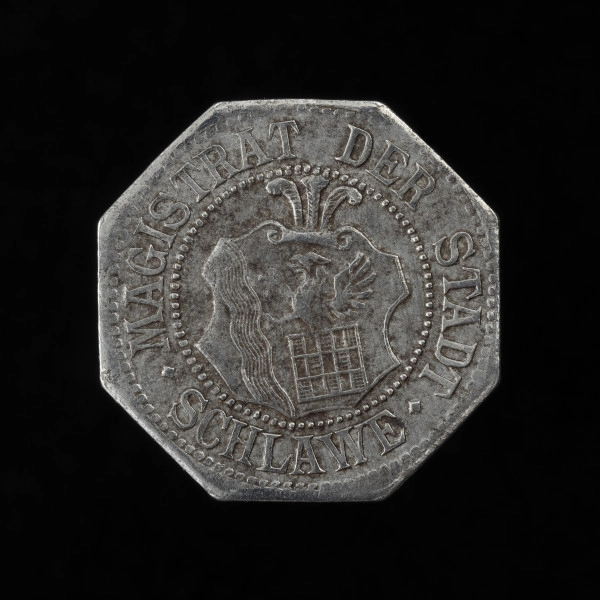 Z takich możliwości skorzystało również miasto Sławno, emitując własne 50-fenigówki. Zlecenie wykonała firma Münzpräge-& Graviranstalt C. Blamberger z Norymbergi. Wybitym w żelazie monetom, nadano kształt ośmioboczny, co było swego rodzaju standardem dla pieniędzy zamawianych przez władze miejskie. Na awersie w perełkowej obwódce umieszczono herb miasta, a w otoku informację, że odpowiedzialność za emisję ponosi magistrat miasta Sławna. Rewers oprócz umieszczonego w perełkowej obwódce nominału zawiera informację, że przedmiot jest drobnym pieniądzem zastępczym (Kleingeldersatzmarke).