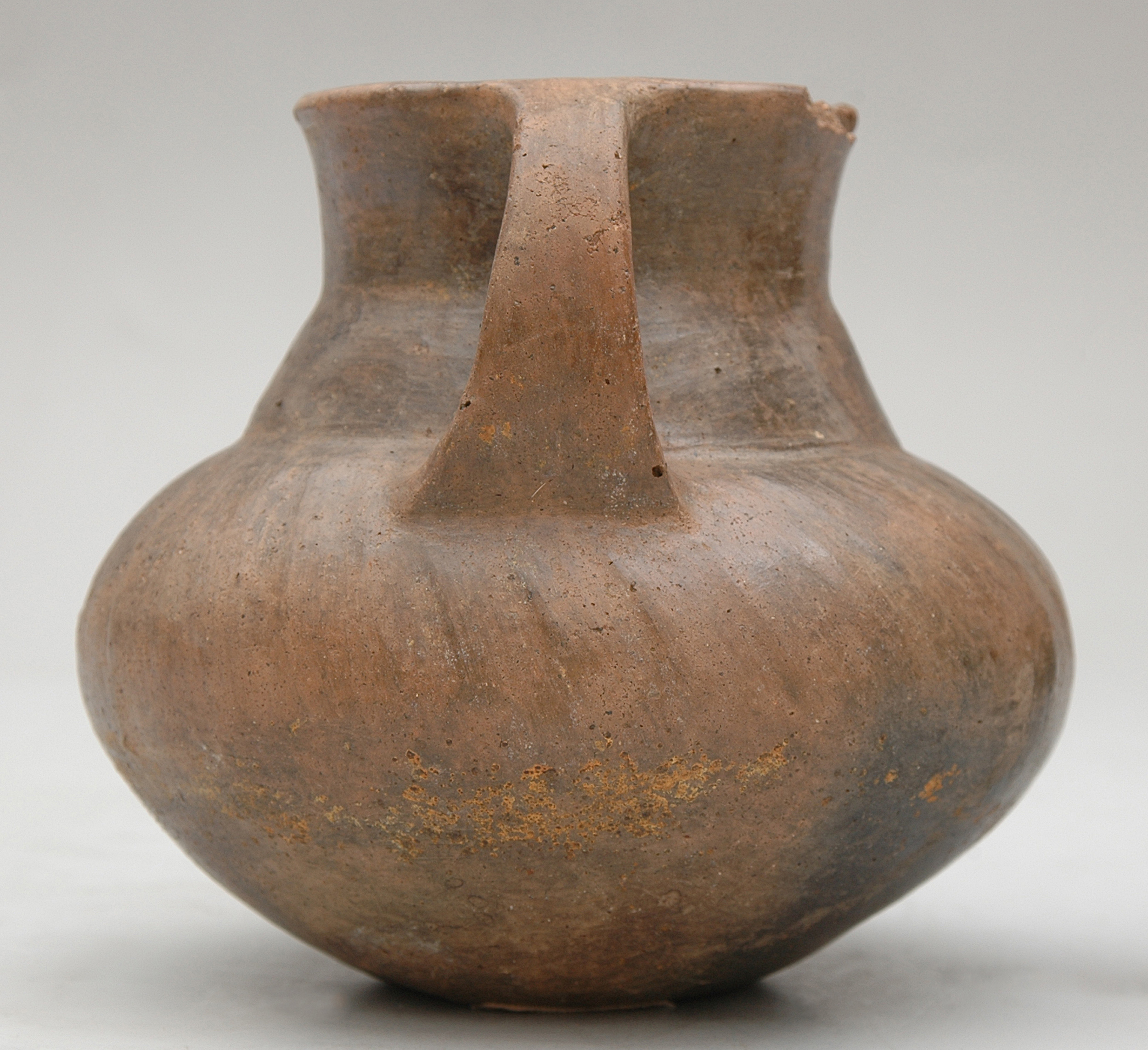 Niska, brzuchata amforka o zaokrąglonych ramionach z dwoma szerokimi uchwytami. Jej jedyną dekoracją są ukośne, równoległe, wklęsłe linie na brzuścu. Powierzchnia naczynia ma niejednolity kolor - od brązowego do czarnego.