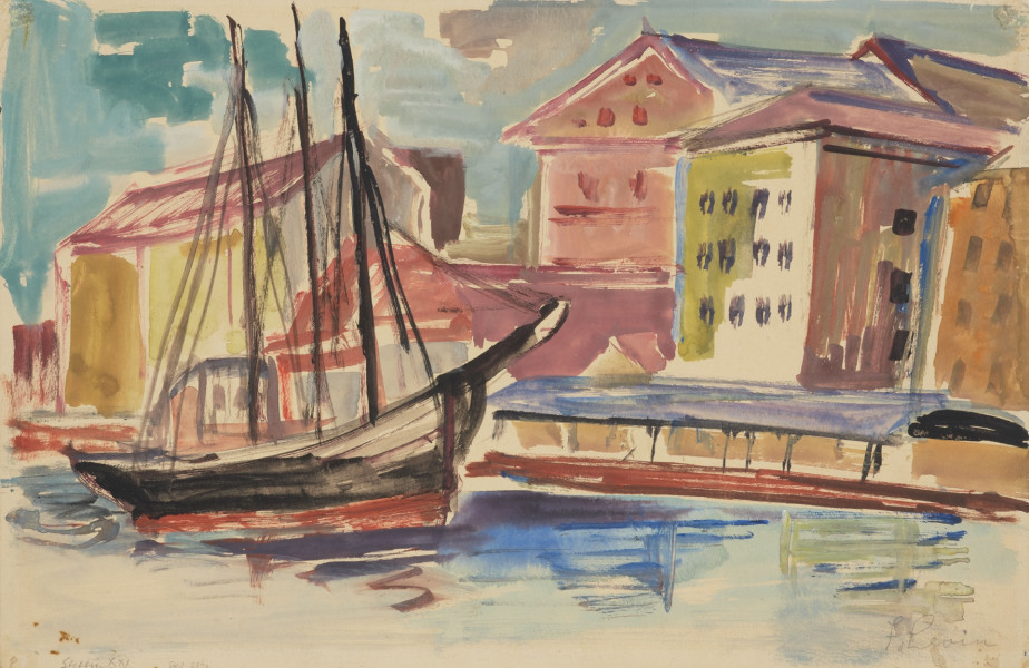 Muzeum Narodowe w Szczecinie jest w posiadaniu czterech dzieł malarza, przedstawiających rodzinne miasto – obrazu wykonanego techniką olejną oraz trzech akwareli. Jedna z niewielkich akwarel jest dwustronna. Kompozycja na verso przedstawia siedzącego na ławce, na Tarasie Hakena (obecnie Wały Chrobrego) szczecińskiego flanera, spoglądającego na rozciągający się stamtąd malowniczy widok na Odrę i Łasztownię. Praca znajdująca się na odwrocie także jest pejzażem. Prezentuje widok na brzeg Łasztowni ze znajdującymi się tam budynkami gospodarczymi i magazynami. Na pierwszym planie z lewej strony artysta umieścił przycumowany do brzegu niewielki trójmasztowiec ze zwiniętymi żaglami. Obie kompozycje są świadectwem szczęśliwych wakacji Levina spędzonych w Szczecinie, beztroskiego czasu kontemplacji znajomych miejsc.