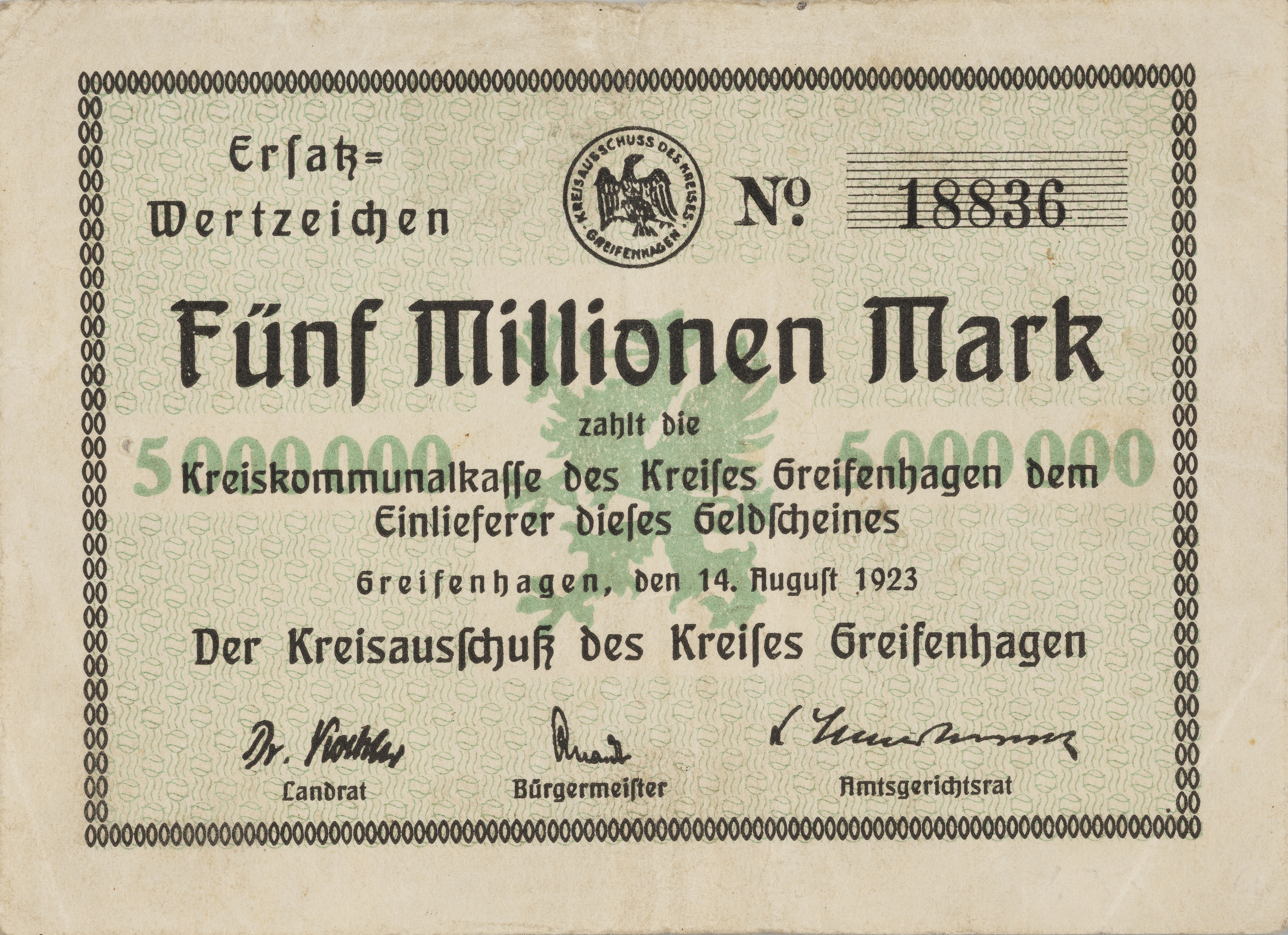 W połowie 1923 roku na niemieckim rynku pieniężnym zaczęło brakować banknotów. Szczególnie ciężka sytuacja była na prowincji. Dlatego też administracje lokalne starały się samodzielnie rozwiązywać problem braku gotówki drukując pieniądze zastępcze. Podobnie postąpił zarząd powiatu Gryfino, który 17 sierpnia 1923 roku otrzymał stosowne zezwolenie od ministra finansów Rzeszy. W obieg puszczono odcinki z datą 14 sierpnia 1923 o wartościach 500 000, 1 000 000 i jak przedstawiony na fotografii – 5 000 000 marek.