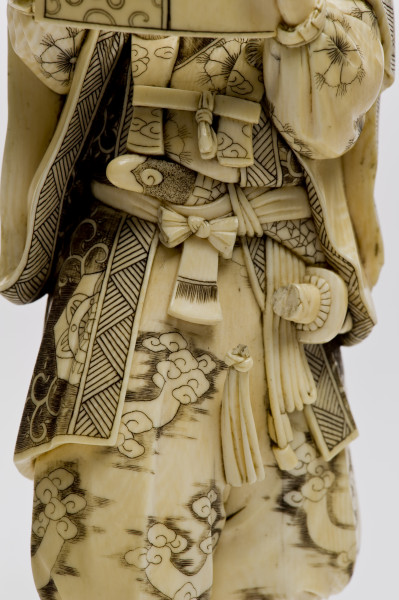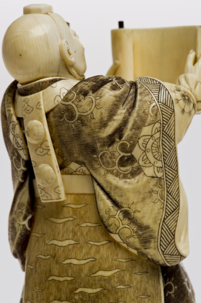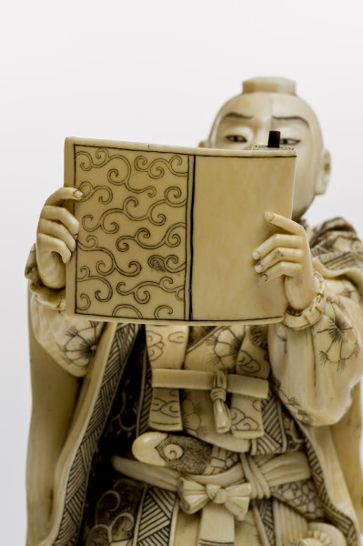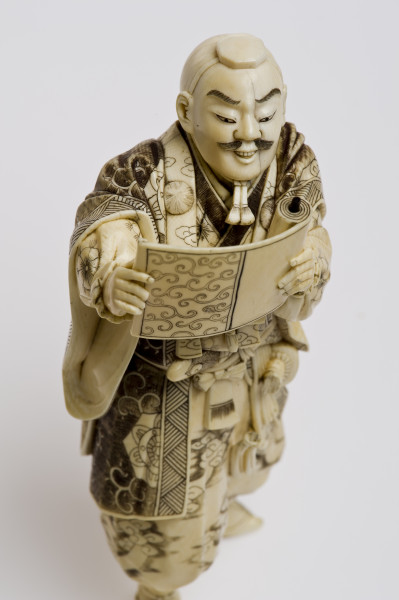 Miniaturowe rzeźby w drewnie lub kości, obecne są w kulturze japońskiej od ponad trzystu lat i należą do jednej z tych dziedzin sztuki japońskiej, która w Europie od drugiej połowy XIX wieku kojarzy się nieodmiennie z oryginalnością i niezwykłością twórczości japońskich artystów. Jest także uważana za zwierciadło japońskich obyczajów, wierzeń, historii, widzenia świata, stosunku do przyrody. Figurka przedstawiająca samuraja ze zwojem jest przykładem dekoracyjnej rzeźby, wykonywanej od 2 połowy XIX w. z kości słoniowej. Rzeźby te nazywane okimono (co po japońsku oznacza ozdobę, ornament), utrzymane były w realistycznej konwencji. Są one jednocześnie popisem wirtuozerii, przejawiającej się w dbałości o najdrobniejsze detale i niezwykle precyzyjnym ich oddaniu, tak by całość była nie tylko starannie opracowana, ale i dekoracyjna. Okimono przedstawiały różne bóstwa, postacie z dalekowschodniej mitologii i literatury, wojowników, postacie z ludu (tragarzy, handlarzy, ogrodników), gejsze itp. Te niewielkie, wolnostojące figury, rzeźbione w kości słoniowej, powstawały przede wszystkim dla kolekcjonerów z Zachodu, wśród których cieszyły się i nadal cieszą wielkim uznaniem. Tworzyli je mistrzowie netsuke, którzy zaczęli wykonywać większe okimono, bowiem zapotrzebowanie na tradycyjne elementy japońskiego stroju malało wraz z coraz powszechniejszym korzystaniem z europejskich ubiorów. Netsuke były to kunsztowne, miniaturowe rzeźby, wykonane z głównie z drewna lub kości słoniowej używane w Japonii od ok. XV w. Służyły jako breloki do zbalansowania przewieszonych przez pas obi sakiewek, tabakierek, przyborów do palenia, puzderek na leki (inrō) itp. Figurka przedstawia mnicha – wojownika Benkeia. Saito Musashibo Benkei (1155–1189) jako postać historyczna był bohaterem wielu legend i sztuk teatralnych, jako wzór lojalności i bohaterstwa. Figurka ze zbiorów toruńskiego muzeum jest ilustracją sceny ze sztuki „Kanjincho” („Lista subskrypcyjna”). Benkei odczytuje z pustego zwoju rzekomy list polecający ze świątyni, pełniący rolę glejtu. Ta brawurowa akcja uratowała życie Minamoto-no Yoshitsune. Benkei był postacią historyczną, ale później obrosła ona na wpół legendarnymi wydarzeniami, które zostały zobrazowane w sztukach teatralnych.