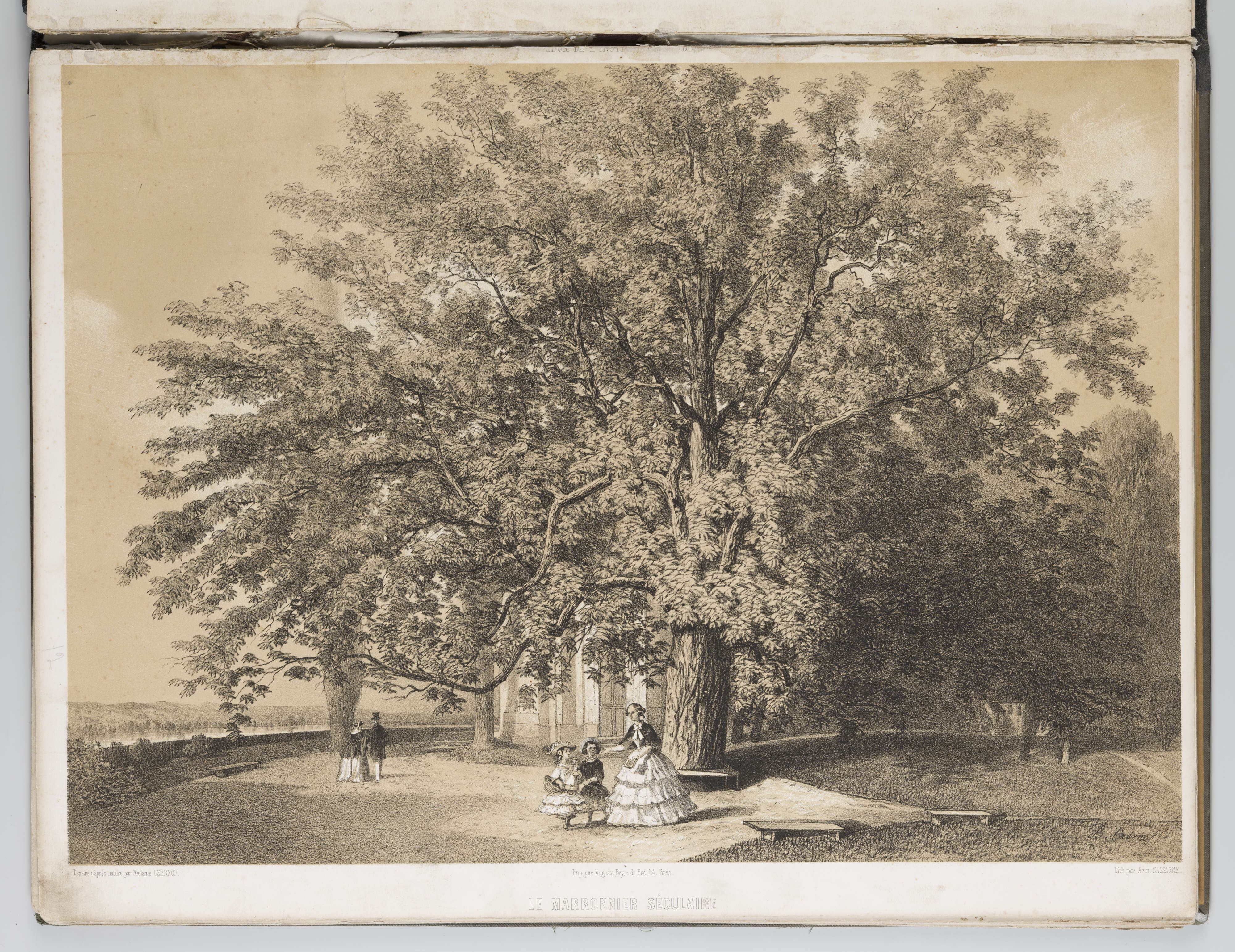 Na karcie Le marronnier séculaire widnieje wycinek obsadzonej drzewami przestrzeni parkowej, pochodzący z usytuowanego nad Wisłą Dolnego Ogrodu, przy Domku Chińskim. Prawie całe pole przedstawienia zajmuje wielka korona starego dębu. Obok tego miejsca biegnie szeroka aleja, którą przechadza się kilka osób. Pod drzewem zatrzymała się matka lub bona z dwojgiem dzieci, obok przeszła elegancka para. Po lewej stronie otwiera się rozległy widok na rzekę i przeciwległy brzeg. W oddali rysują się łagodne wzgórza o nisko poprowadzonej linii horyzontu, z ogromną połacią nieba zasnutego lekkimi obłokami. W prześwitach między zielenią ukazują się niewielkie fragmenty dawnej herbaciarni i małego domku, położonego po prawej stronie na dalekim pagórku.