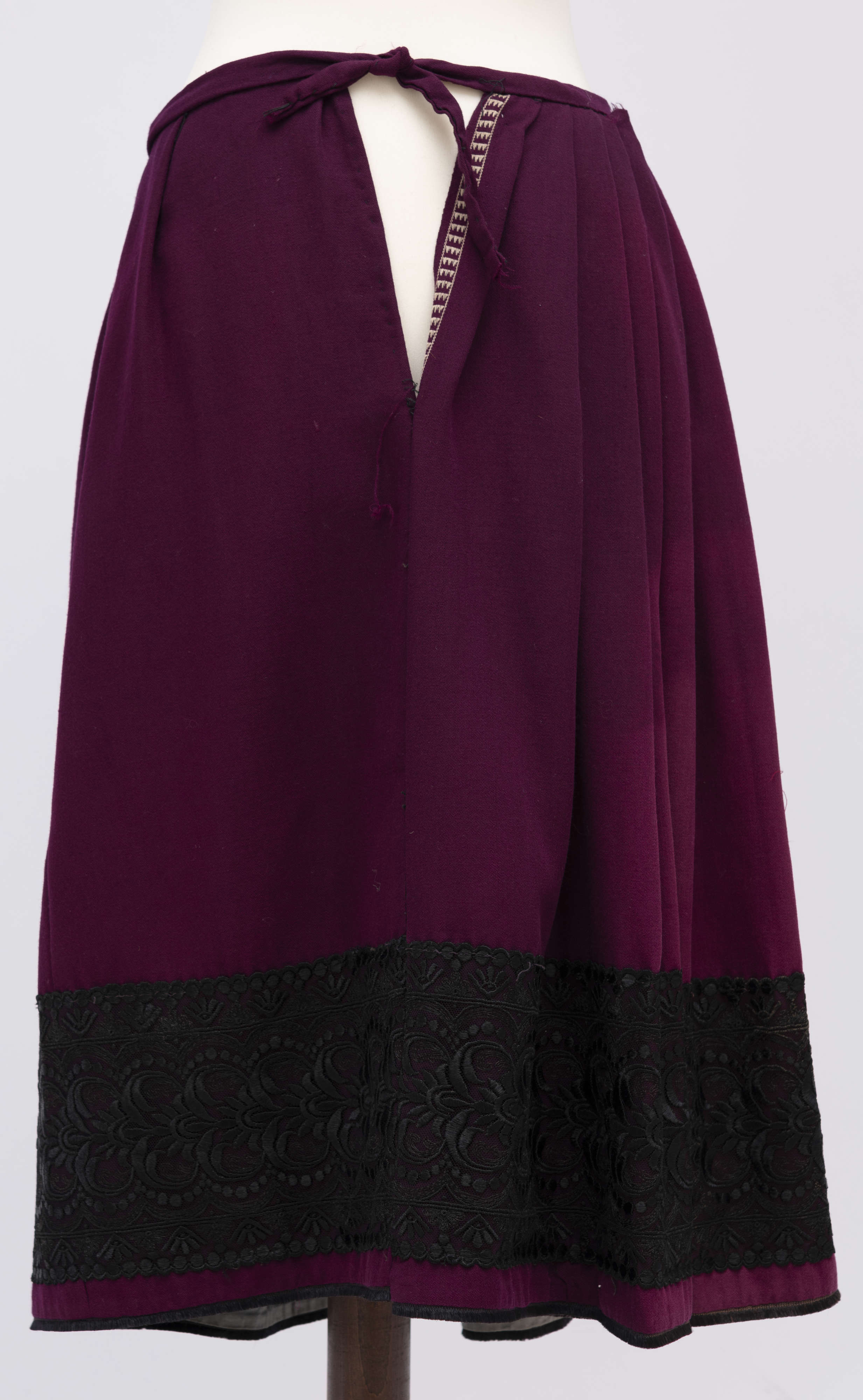 Prezentowana spódnica była noszona przez mężatki w ostatnim okresie użytkowania stroju świątecznego w okolicach Krzczonowa, czyli przed I wojną światową. Świadczy o tym jej kolor, a stonowane zdobnictwo wskazuje na kolejny etap przeobrażeń stroju. Nie był już wówczas tak barwny, przynajmniej te jego elementy, które były noszone przez dojrzałe kobiety. Bardzo podobnie był zdobiony kaftan zakładany do tej spódnicy, którego jedyną dekorację stanowiły koronki fabryczne, a nie kolorowe wstążki czy złote taśmy, jakie naszywano na spódnicę i gorset w poprzedniej wersji.