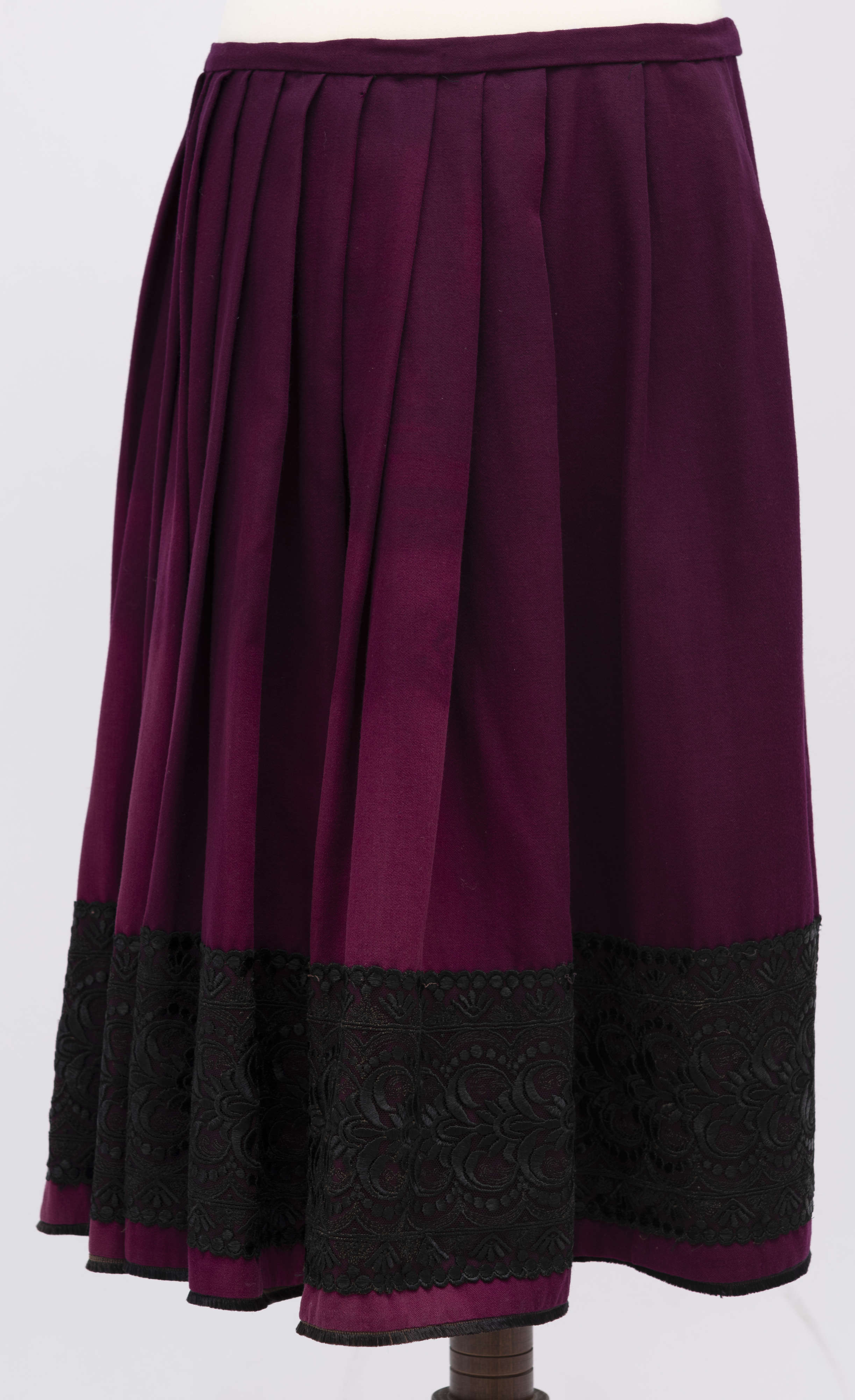 Spódnica do stroju świątecznego krzczonowskiego pochodzi z Bychawki, w gminie Bychawa. Została wykonana przez krawcową w 1910 roku. Jest uszyta maszynowo z ciemnofioletowej wełenki z czterech brytów, jej długość to 73 cm, szerokość 260 cm. W górnej części materiał na prawie całej szerokości jest ułożony w plisy, wszyte w wąski pasek wykonany z tego samego materiału, zwany oszewką, którego końcówki, przy rozcięciu, wystają poza pas i służą do zawiązywania spódnicy. Przy rozcięciu, które znajduje się z przodu, spódnica jest gładka, nieułożona w fałdy dla oszczędzenia materiału; ta część była zakrywana fartuchem. Dołem od wewnętrznej strony spódnica jest obszyta pasem z szarego płótna, zwanego podmurówką, a na brzegu czarną tasiemką, nazywaną szczoteczką, która miała zapobiegać strzępieniu się krawędzi. Ozdobę spódnicy stanowi szeroki pas (17 cm) z czarnej fabrycznej koronki tiulowej ze stylizowanym ornamentem roślinnym, przyszytej w dolnej części.