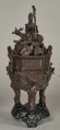 Kadzielnica z końca XIX wieku, z cyzelowanego brązu, miejscami patynowana, z przykrywką na trzech nóżkach w kształcie nóg słoni, wspartych na trąbach. Naczynie o skomplikowanej formie, finezyjnie zdobione. Brzusiec w dolnej części naczynia pokryty jest dekoracją stylizowanych, rytych fal na których unoszą się cztery mityczne zwierzęta ch’i¬-lin i dwa psy Fo wykonane w reliefie. Powyżej brzuśca znajdują się archaizujące motywy maski t’aotie na tle meandra. Do boków brzuśca przymocowane dwa uchwyty w formie smoków o wężowych ciałach. Przykrywka wypukła, ażurowa, zdobiona wyciętymi, stylizowanymi obłokami, zwieńczona figurką boga długowieczności Sho – Lao, siedzącego na spoczywającym jeleniu. Bóstwo w jednej dłoni trzyma brzoskwinię, w drugiej laskę. Kadzielnica umieszczona na podstawie drewnianej, czarnej, ażurowej, z dekoracją geometryczną. Na wierzchu owalne wgłębienia na nogi kadzielnicy. Drewno rzeźbione i malowane. Tāotiè - nazwa mitologicznego potwora i motywu ornamentacyjnego, charakterystycznego chińskich naczyń z brązu z epok Shang i Zhou. Kadzielnica, to naczynie przeznaczone do spalania kadzidła lub perfum w postaci stałej. Naczynia te różniły się znacznie rozmiarem, formą i materiałem konstrukcyjnym. Znajdowały zastosowanie typowo użytkowe w obszarze świeckim jak i sakralnym już od czasów starożytnych w wielu kulturach. Służyły do oczyszczania powietrza z patogenów w przypadku zagrożenia epidemiologicznego, perfumowania pomieszczeń, a nawet odmierzania czasu podczas rytuałów i ceremonii – mierzono postęp spalania kadzideł stożkowych. Kadzidełka są spalane przez umieszczenie ich bezpośrednio na źródle ciepła lub na gorącej metalowej płycie w kadzielnicy. Do kadzideł domowego użytku sprzedawane były małe, wklęsłe brykiety z węgla drzewnego. Zapalało się róg brykietu, a następnie umieszczało go w kadzielnicy i gasił płomień. Po tym, jak świecące iskry przemierzyły cały brykiet, gotowy do umieszczenia na nim kadzidła.