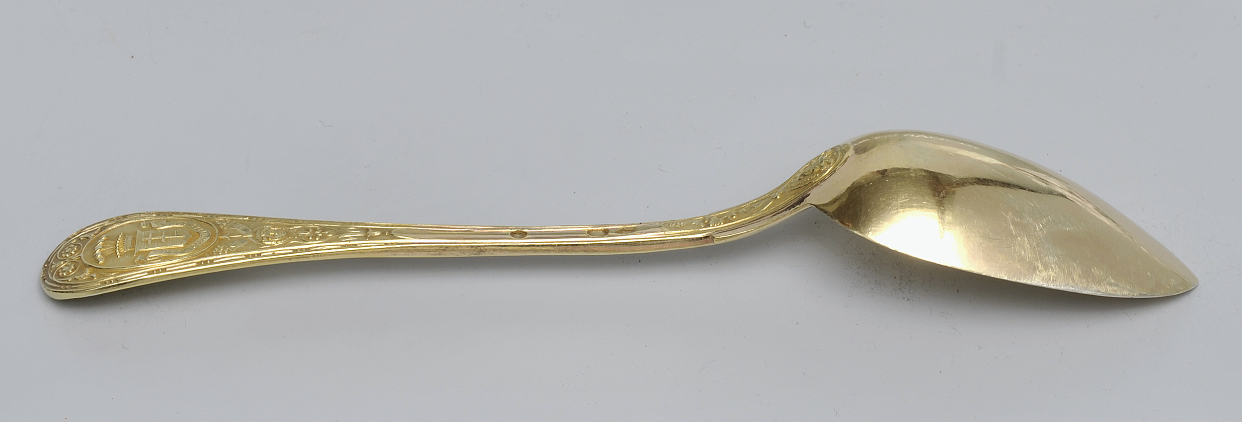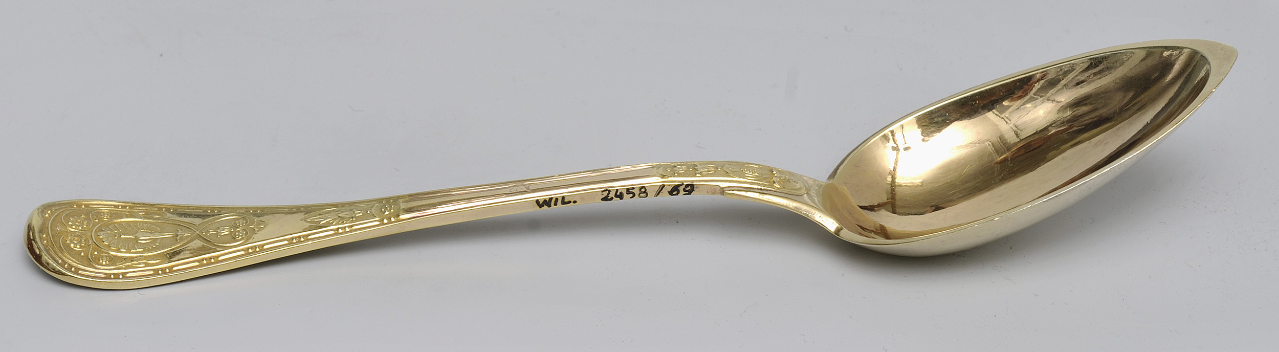 Łyżka deserowa o wydłużonym owalnym czerpaku jest jedną z siedemdziesięciu dwóch łyżek zachowanych w wilanowskiej kolekcji.