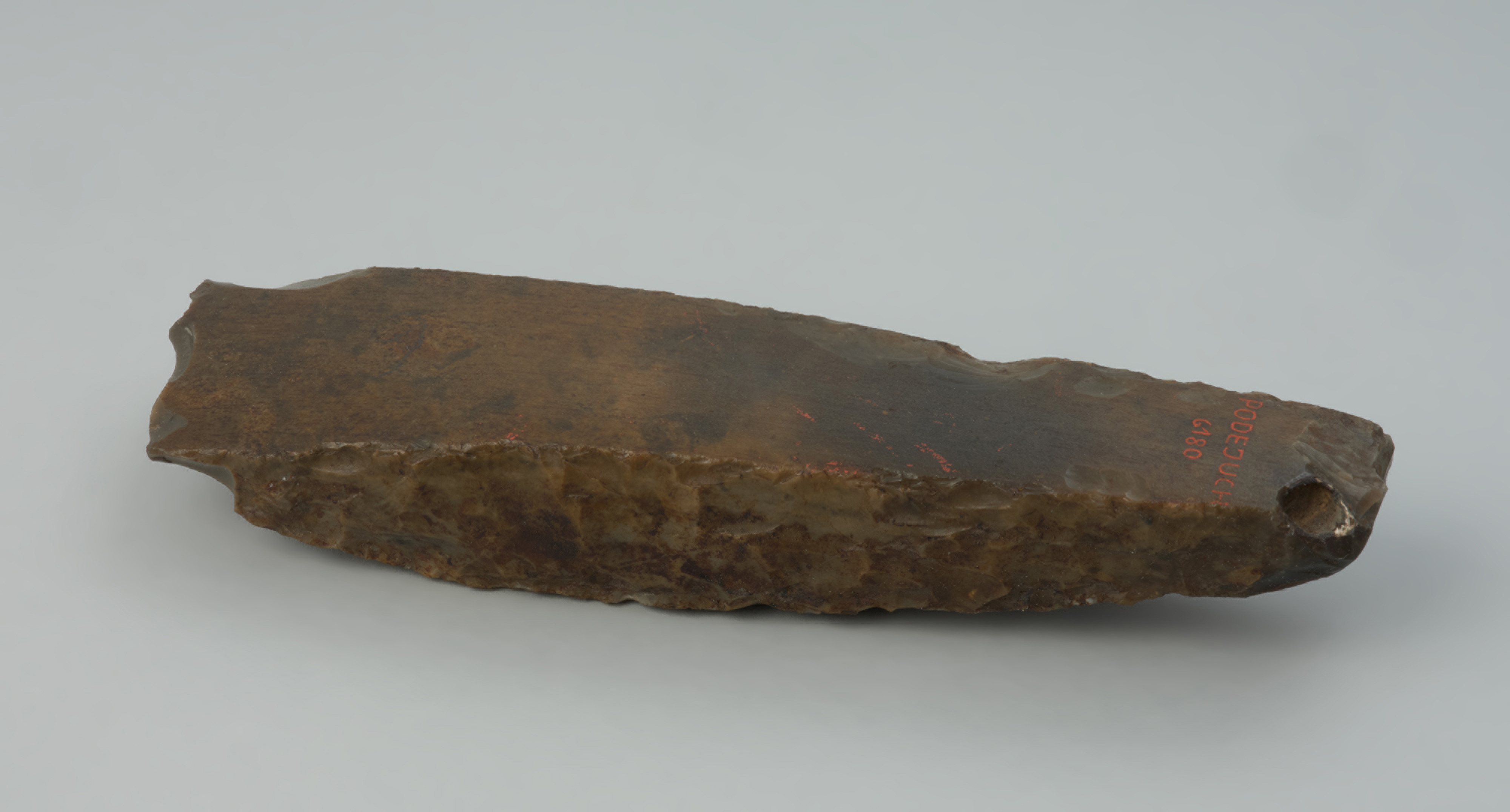 Narzędzie krzemienne trafiło do szczecińskich zbiorów muzealnych w 1910 roku wraz z kilkunastoma innymi znaleziskami wydobytymi na wysokości ówczesnych wsi Ognica (niem. Nipperwiese), Podjuchy (niem. Podejuch) i Zdroje (niem. Finkenwalde) w trakcie intensywnych prac regulujących Odrę, prowadzonych w początkowych dekadach XX wieku. Odkrycia archeologiczne dokonywane przy okazji przebudowy biegu rzeki i skierowania głównego koryta ujściowego jej wschodnim ramieniem były na tyle liczne i wartościowe, że w 1909 roku władze państwowe zdecydowały się zobligować resort robót publicznych do zadbania o ich losy i przekazywania do kolekcji muzealnych. Najczęściej zabytki takie znajdowano w koszach maszyn płuczących, w których gromadziły się kamienie i inne przedmioty. Odnotowywano przy tym ich lokalizację, a jeśli było to możliwe, także informacje o kontekście zalegania.