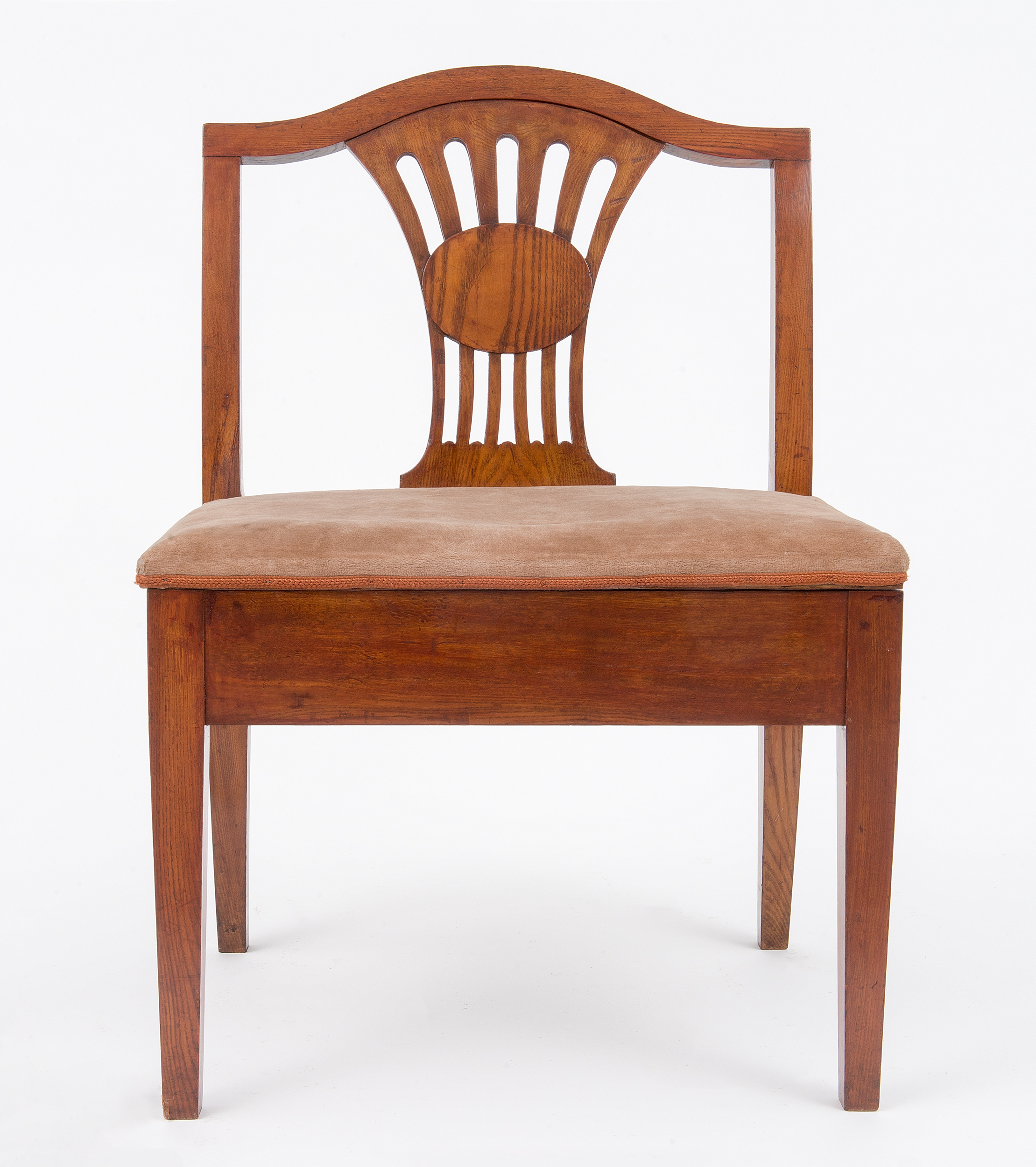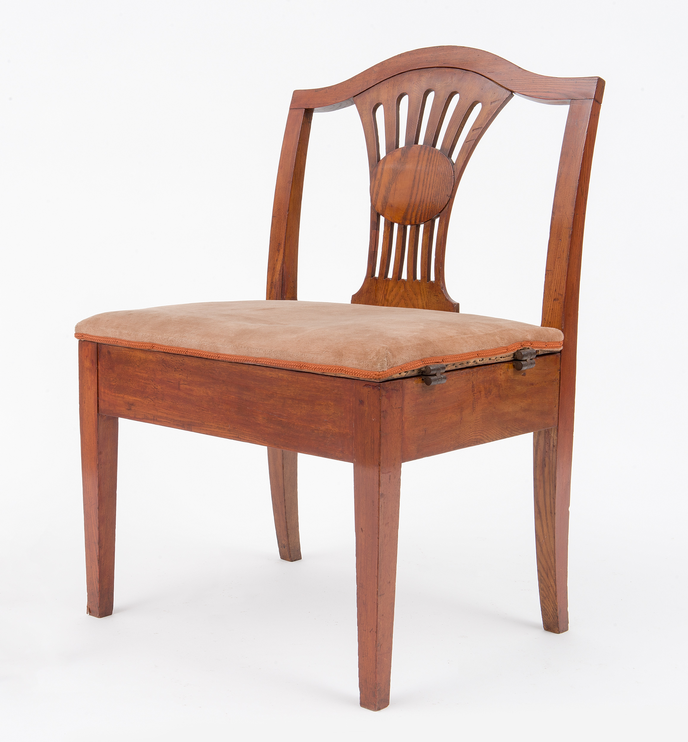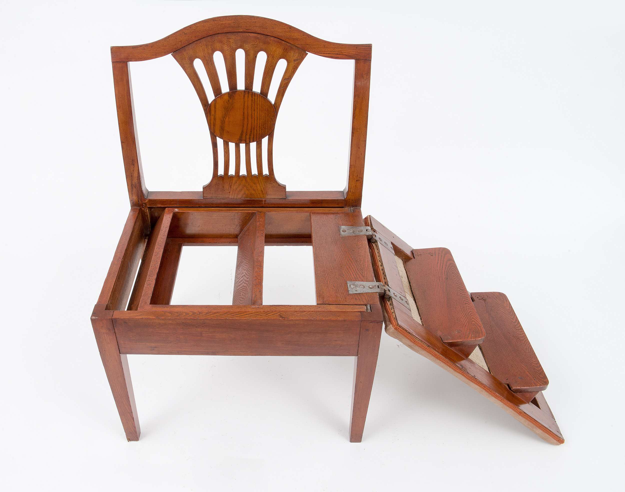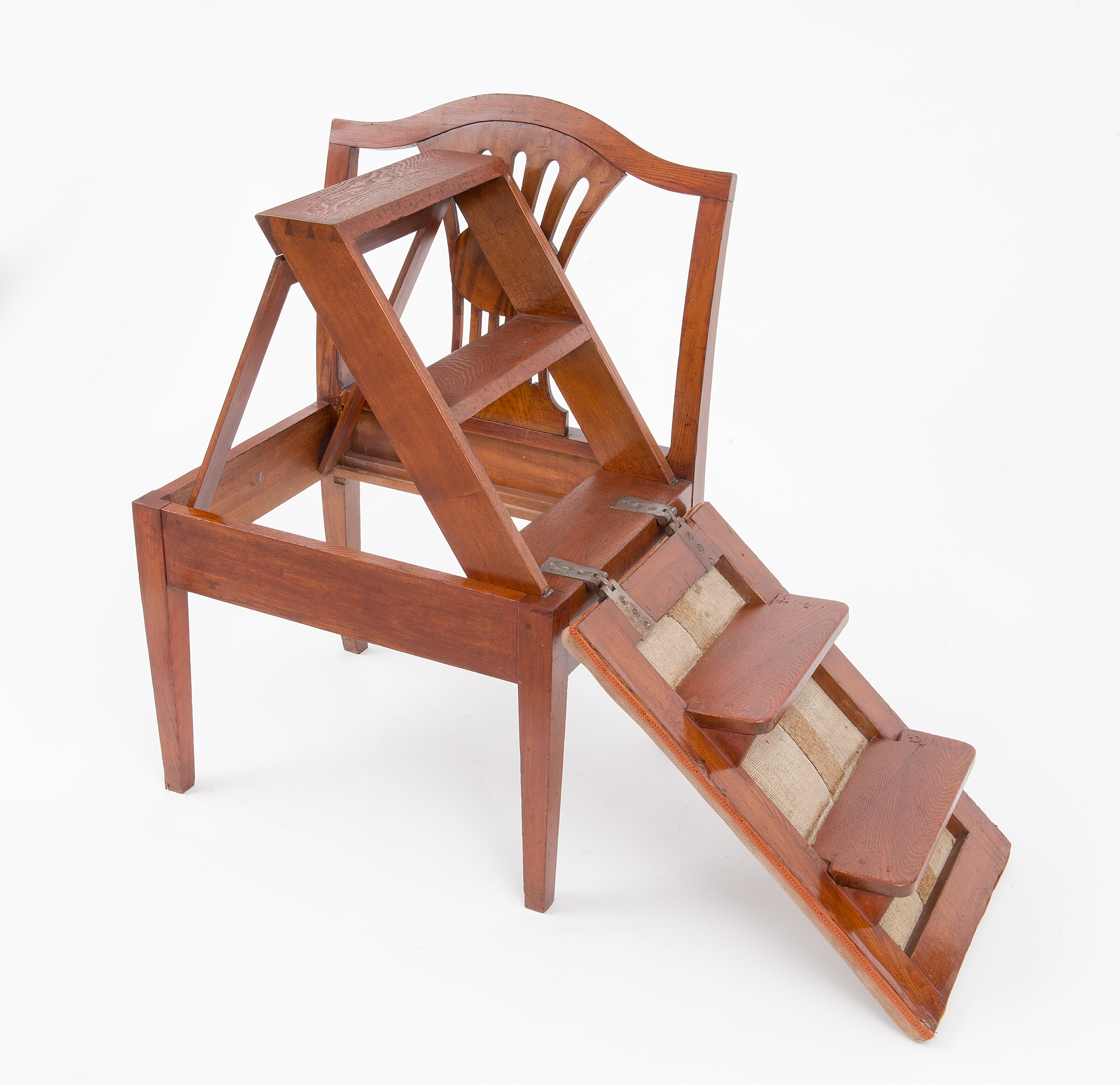 Mebel wielofunkcyjny w formie prostego krzesła pełniącego rolę siedziska i drabinki. Krzesło jest meblem o tapicerowanym siedzisku w kształcie prostokąta pokrytym aksamitem opartym na prostej ramie cargi z czterema prostymi, lekko zwężającymi się ku dołowi nogami. Lekko odchylone do tyłu ażurowe oparcie pleców składa się z prostokątnej ramy o podniesionym nieco zwieńczeniu oraz z wpisanej w nią na osi stylizowanej palmety jedynej ozdoby tego mebla. Podniesienie siedziska zamocowanego na mosiężnych zawiasach na bocznej ściance cargi i oparcie go o podłogę zmienia całkowicie jego funkcję. Pojawia się odwrocie siedziska z dwustopniowymi schodkami. oraz połączona z nim ukryta pod siedziskiem rama z kolejnymi trzema stopniami. Po oparcie jej specjalnym wspornikiem na cardze przeciwległego boku krzesła uzyskuje się wygodną, pięciostopniową, stabilną drabinkę. W ten sposób krzesło dzięki prostym, technicznym rozwiązaniom podejmuje funkcje drabinki niezbędnej nie tylko w bibliotece. Krzesło pierwotnie wykonane było jako część wyposażenia biblioteki w pałacu warszawskim Potockich (obecnie gmach Ministerstwa Kultury, Dziedzictwa Kulturowego i Sportu). Po ukończeniu przebudowy pałacu wilanowskiego przeprowadzonej przez Aleksandra Potockiego, stało się częścią wyposażenia Biblioteki Wilanowskiej.