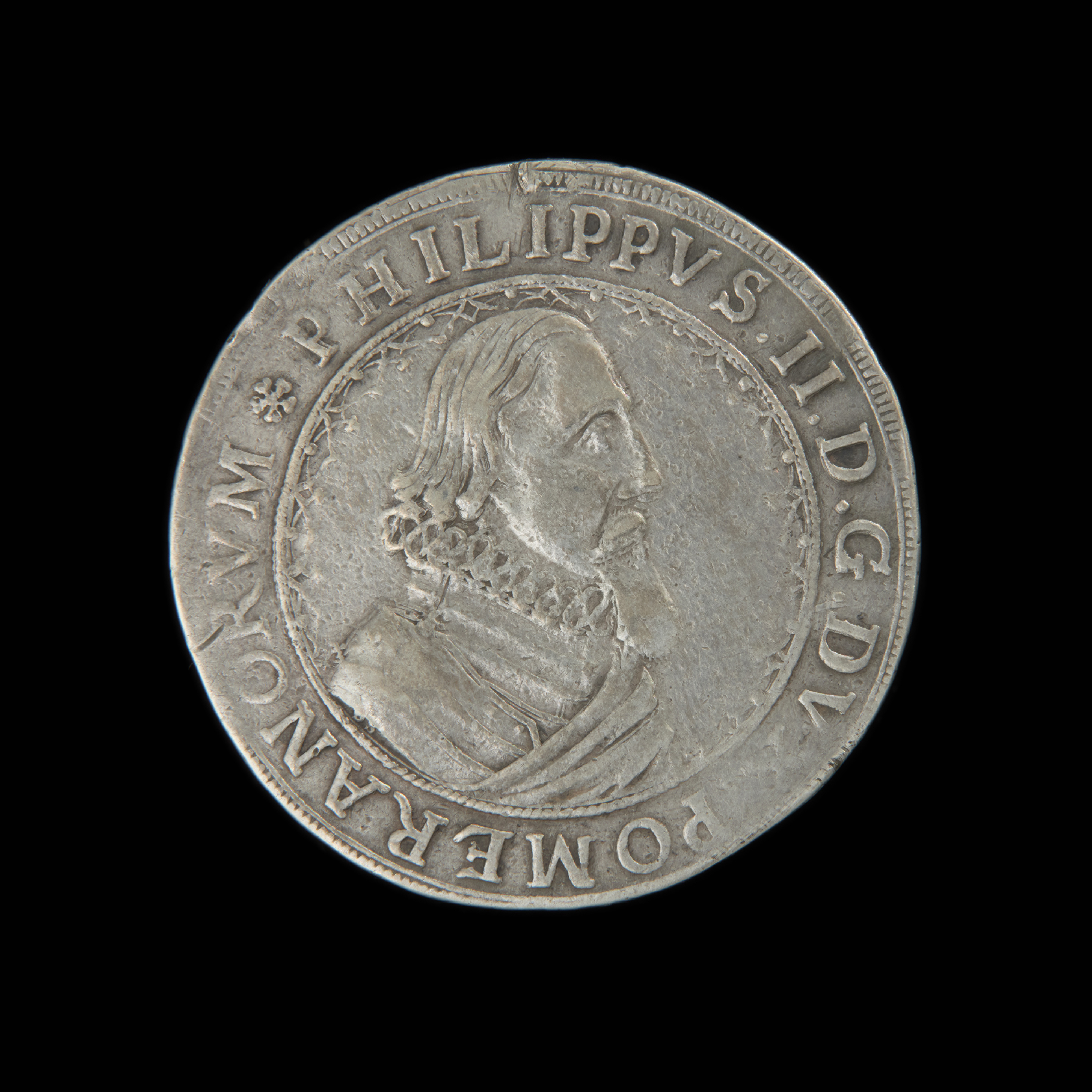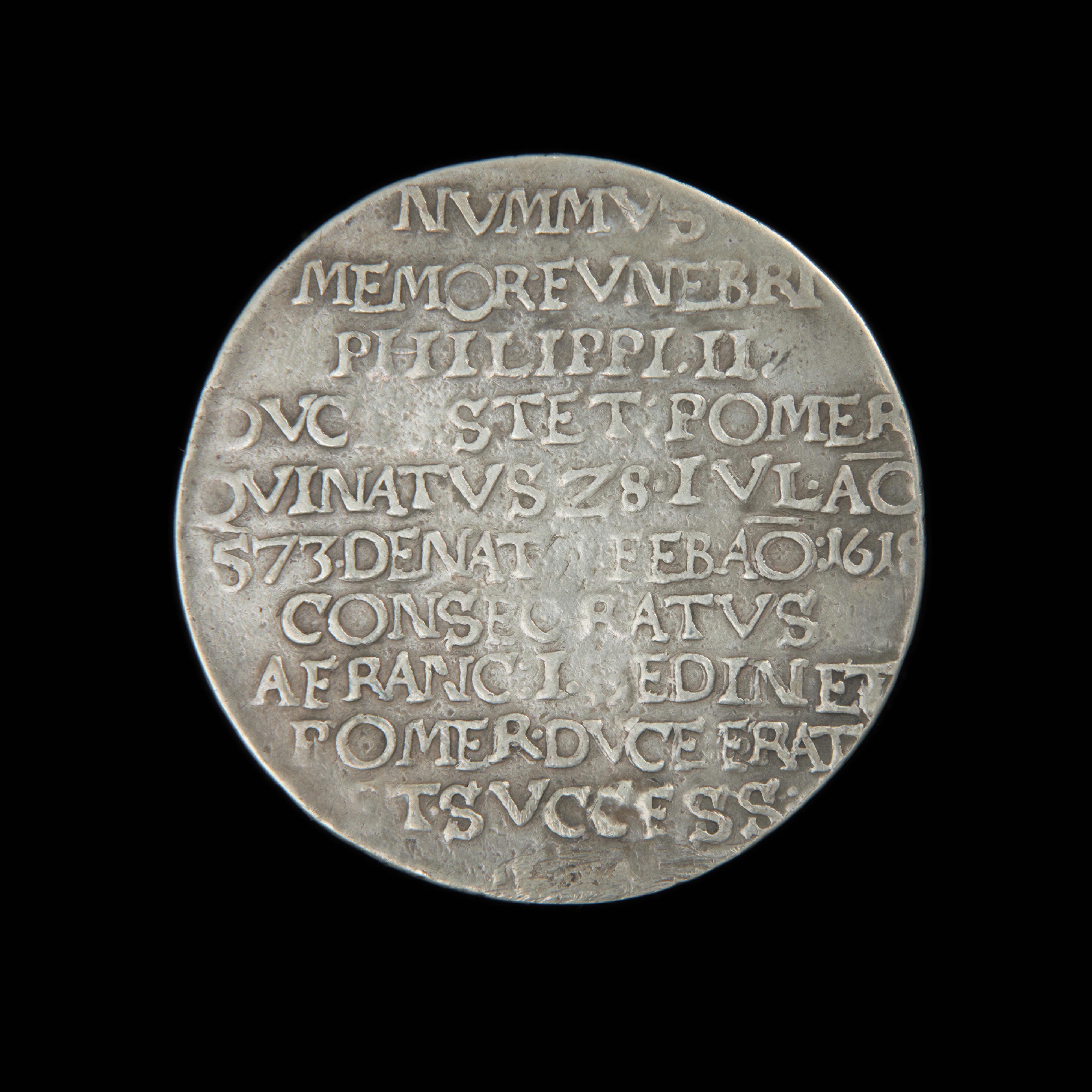 Prawdziwy rozkwit emisji okolicznościowych na Pomorzu Zachodnim nastąpił za panowania księcia szczecińskiego Filipa II (1606–1618), wielkiego mecenasa sztuki i kolekcjonera. Treści stempli odzwierciedlały nie tylko ówczesne wydarzenia i sytuację polityczną, ale również ideologię panowania (tzw. Regierungskunst). Najliczniejsze są okazy bite pośmiertnie dla uczczenia pamięci książąt i ważnych postaci z rodu Gryfitów. Wieloma interesującymi emisjami upamiętniona została śmierć księżnej Anny, drugiej żony Bogusława XIII (1616) i jego brata, księcia Jerzego III (1617). Z kolei odejście Filipa w 1618 roku upamiętnił jego następca Franciszek I, który w Szczecinie wybił serię talarów oraz ich części i wielokrotności. Pojawiły się na nich zarówno tradycyjne kompozycje, takie jak popiersie zmarłego na awersie i wielowierszowa legenda na rewersie, jak i oryginalne wyobrażenia czaszki i kosy oraz sentencje niewiązane dotąd z odejściem – kwiaty i słońce. Omawiany półtalar wybity został stemplami talara, którymi wykonano również bardzo rzadkie podwójne i poczwórne talary. Warto podkreślić, że odbitka poczwórnego talara znajduje się również w zbiorach Muzeum Narodowego w Szczecinie. Do wybicia awersu posłużył stempel talara używany wcześniej do produkcji innych rzadkich, niedatowanych okazów pamiątkowych. Były to talary ze wspiętym gryfem i tarczami herbowymi na skrzydłach, talary z owalnymi tarczami w otokowym wieńcu oraz talary z łodzią żaglową na morzu. Portret księcia nie odbiega od konwencjonalnego ujęcia profilowego, zbroja z szarfą podkreśla przymioty rycerskie Filipa II. Inicjały DS umieszczone pod ramieniem władcy wskazują na Daniela Sailera, augsburskiego złotnika i medaliera zatrudnionego w mennicy szczecińskiej do produkcji stempli. Sailer był autorem niezwykle ciekawych i różnorodnych dzieł, jednak w przypadku tej emisji trudno mówić o interesującym pomyśle.