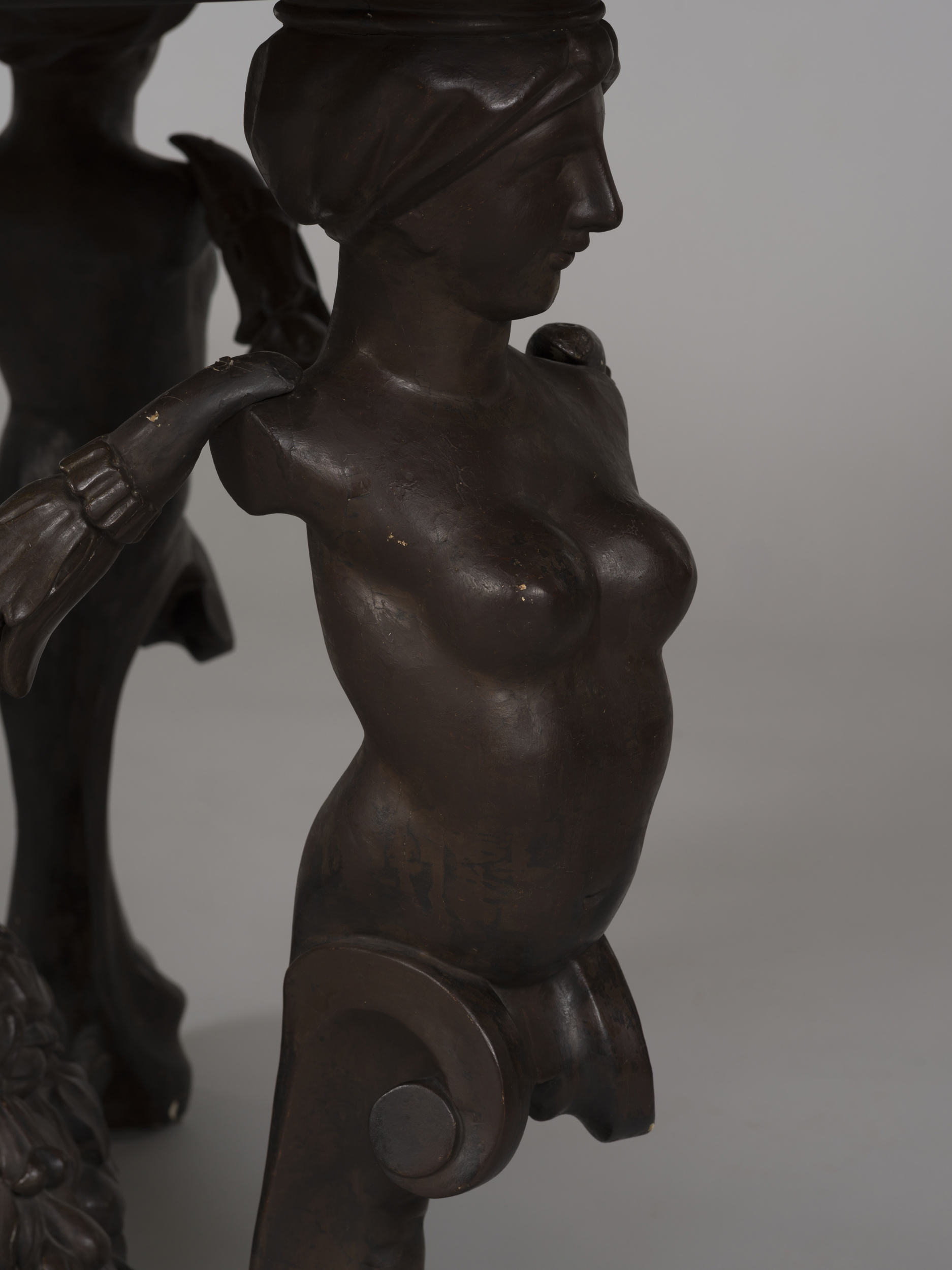 Główną ozdobą dekoracyjnego stołu zwanego gerydonem jest okrągły, masywny blat wykonany z kremowo-różowego onyksu wsparty na drewnianej podstawie. Podtrzymują go trzy kariatydy, których popiersia łagodnie przechodzą w lwie łapy. Ramiona kariatyd łączą wiszące girlandy kwiatów i owoców. Kompozycja ułożonej piramidy kwiatów i owoców zdobi również trójkątne wiązanie nóg tuż nad podłogą. Podstawę gerydonu pierwotnie złoconą pomalowano wtórnie na ciemny brąz. Zabieg ten pozbawił mebel lekkości i wyrazistości rzeźbionych elementów, jednak prawdopodobnie inne względy decydowały o zmianie barwy. Być może były to względy stylistyczne dostosowujące mebel do ciemnych tonacji epoki historyzmu lub demonstracja żałoby narodowej w okresie rozbiorów, podobnie jak czarne suknie dam noszących żałobną biżuterię z symbolami męczeństwa i heroizmu polskiego narodu.