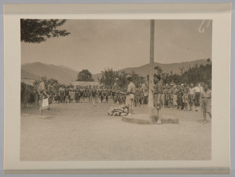 Fotografia przestawia grupę młodzieży w mundurach harcerskich stojącą w półokręgu. Pośrodku stoi drewniany słup. Obok niego stoją dwaj mężczyźni (drużynowi?).