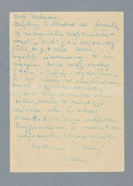 Dziękuję Ci bardzo za paczki, są rzeczywiście wspaniałe – wszystkie dostaję, ale doprawdy jeżeli jest to dla Ciebie wysiłek finansowy – to nie wysyłaj, bo ja sobie radzę. Pytasz o Jadzę – słyszałam, że być może w niedługim czasie wyjedzie do Vittel, to jest w Wogezach. Nie wiem tylko kiedy to nastąpi. Mówiła mi, że wtedy stamtąd do Ciebie napisze. Przypuszczam, że masz tam znajomych. Napisz wkrótce.