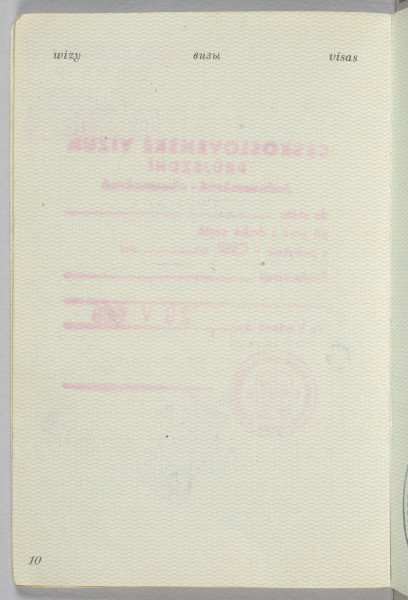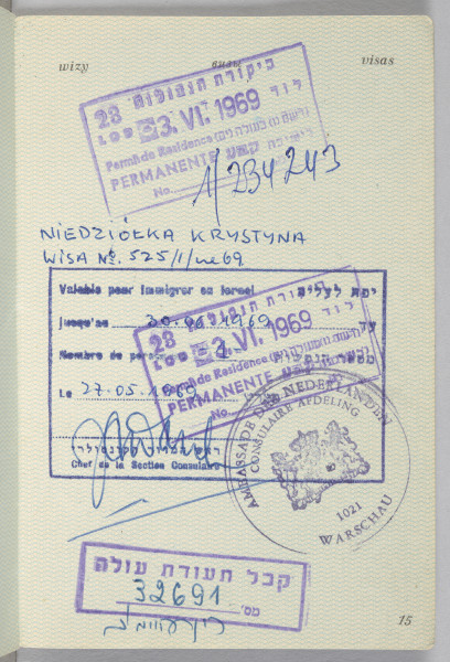 Odprawienie bagażu (pieczątka na s. 17) nastąpiło 27.05.1969. Przekroczenie granicy polsko-czechosłowackiej 2.06.1969 (pieczątka z Zebrzydowic na s. 7; pieczątka z Piotrowic koło Karwiny na s. 9, przy wizie czechosłowackiej). Wylot z Wiednia i przylot do Izraela z Wiednia – 3.06.1969 (pieczątka na s. 11, nad wizą austriacką z Warszawy).