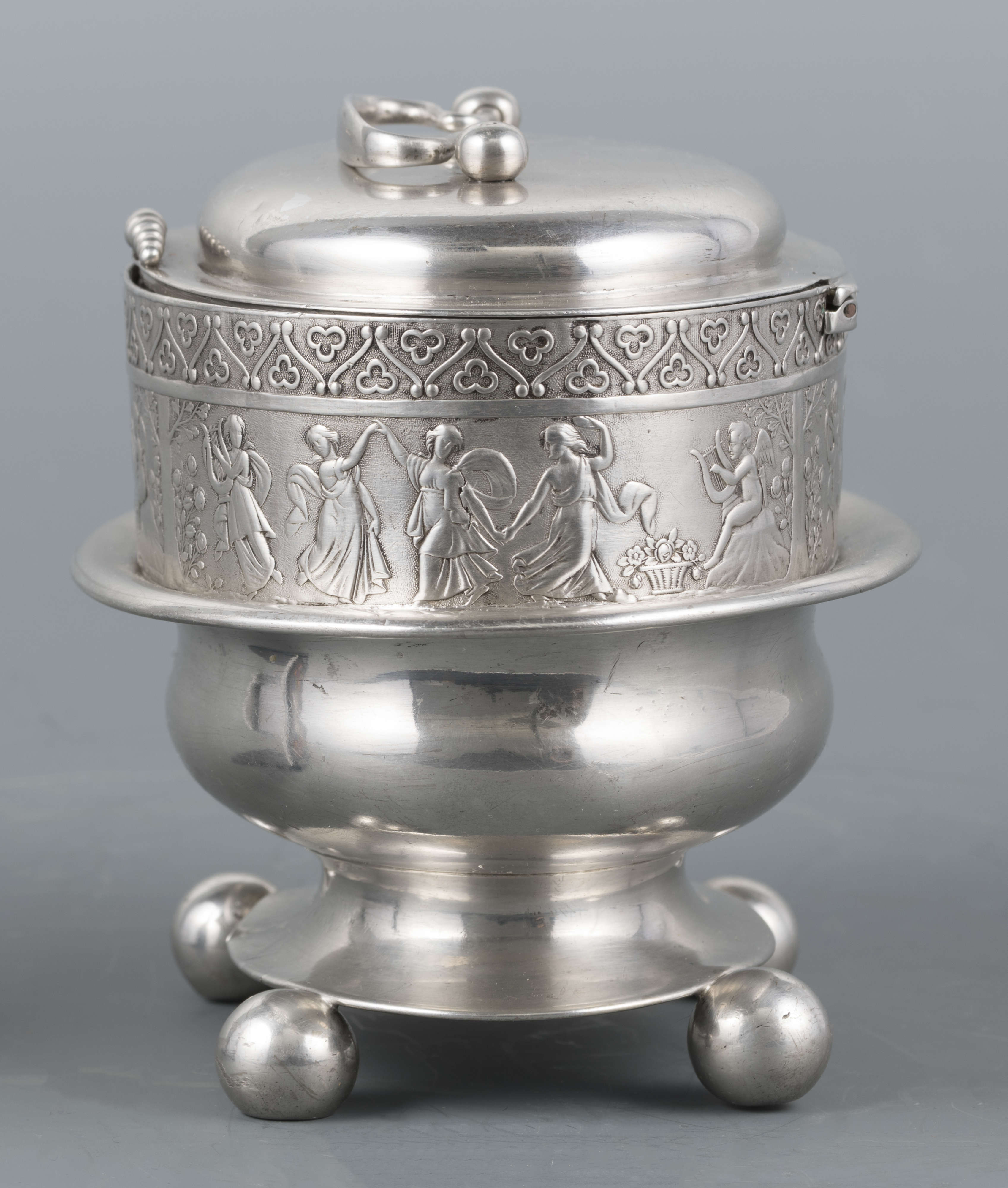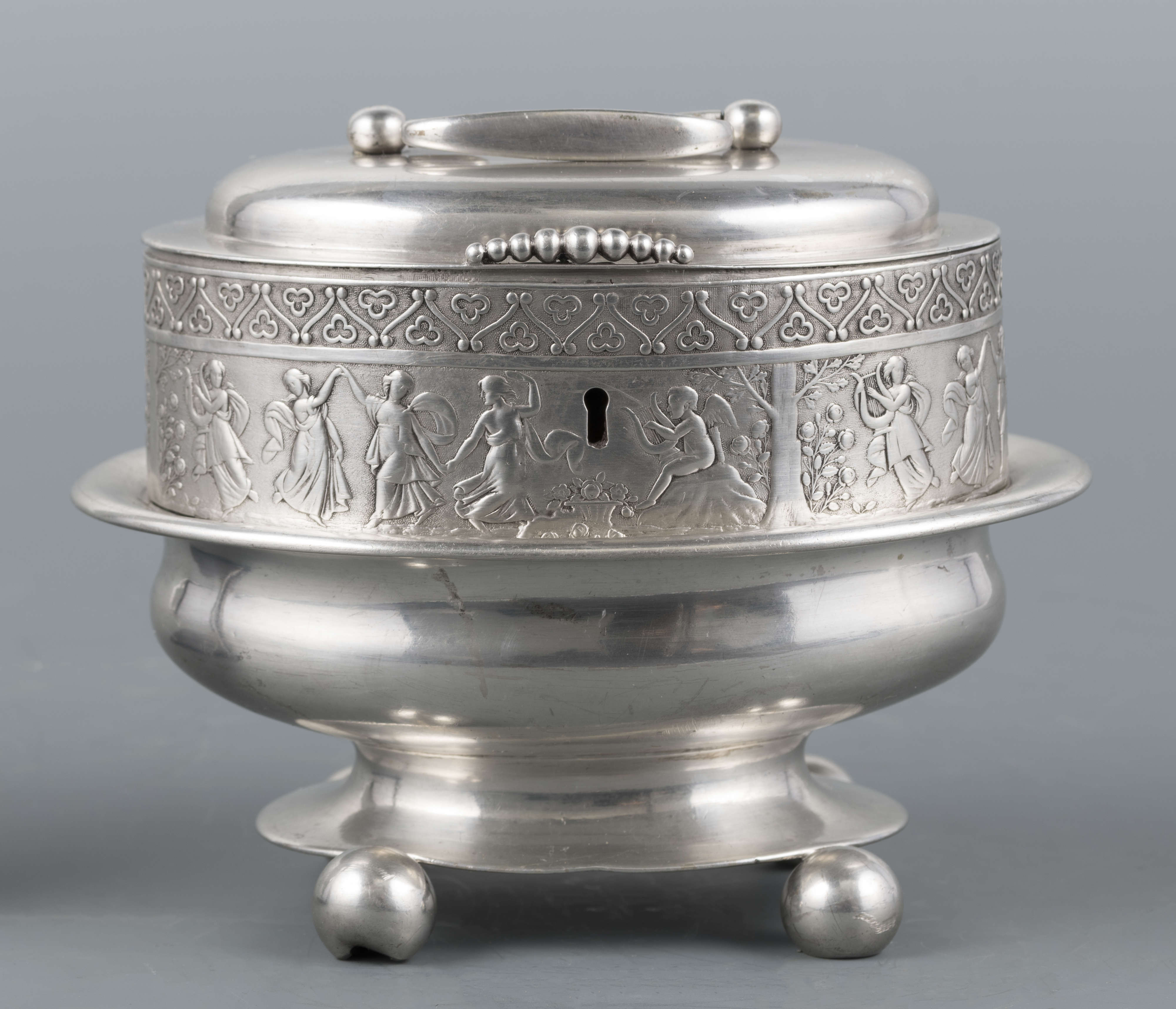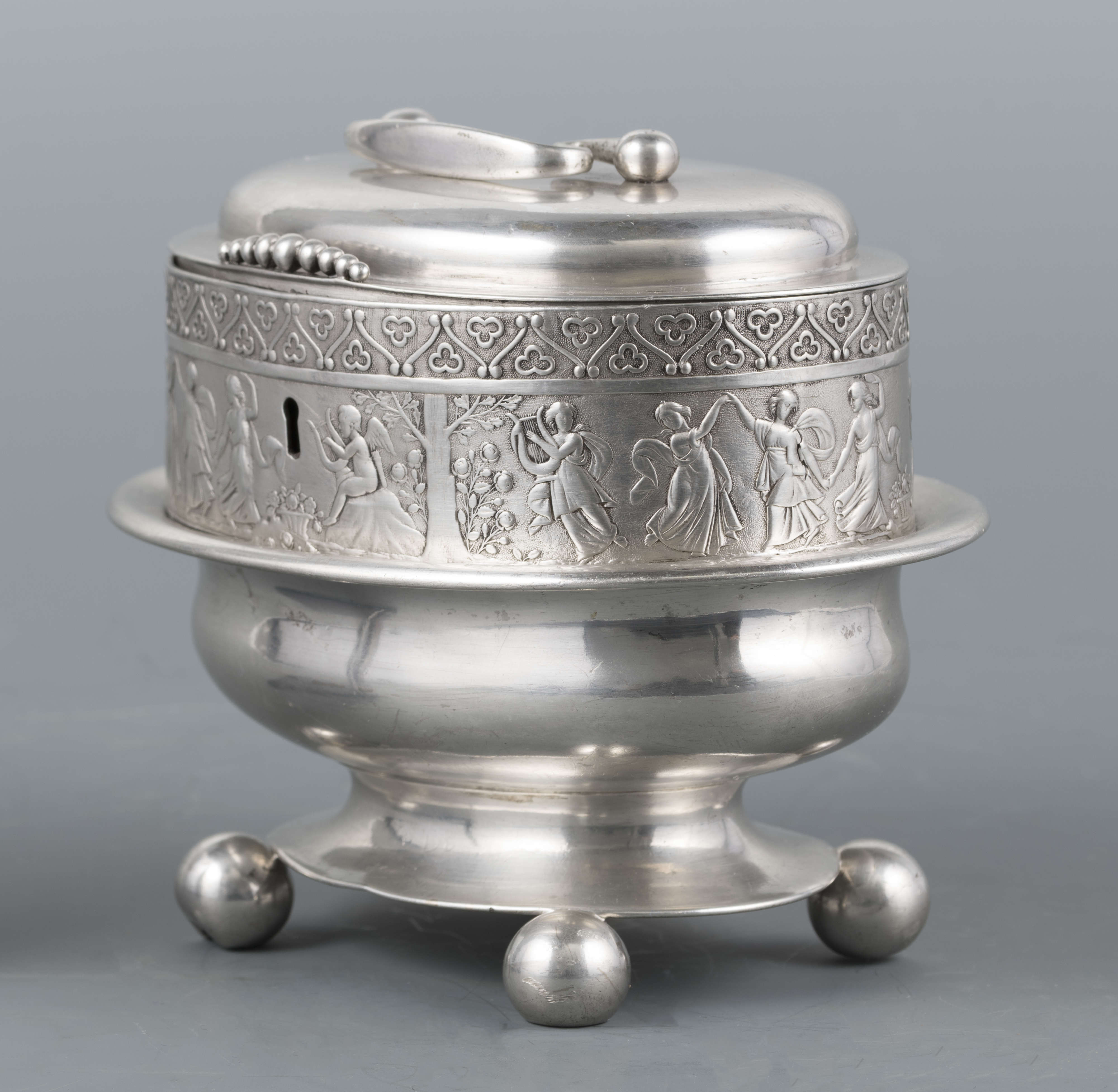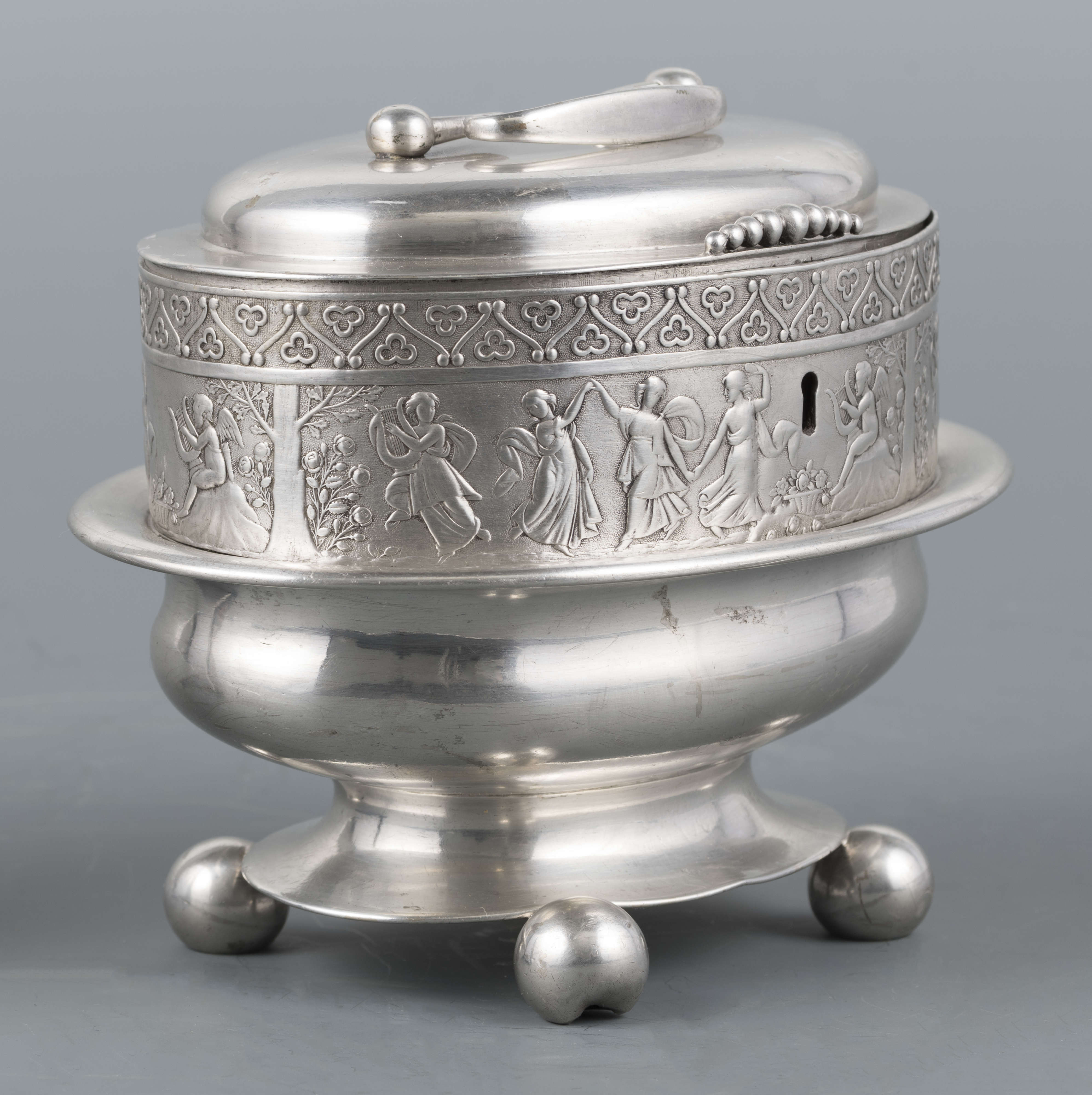 Część dolną cukiernicy tworzy lekko wybrzuszona gładka powierzchnia kończąca się w połowie wysokości przedmiotu wywiniętym kołnierzem, natomiast część górną – szeroki pas ze sztancowanej taśmy. Sztancowanie jest techniką kształtowania metalowych wyrobów artystycznych. W tej metodzie złotnik wykorzystuje punce, czyli stemple, a także płyty służące do wygniatania, zwane matrycami , i do jednorazowego tłoczenia form złożonych. Dzięki temu sposobowi pojedyncze uderzenie stempla lub matrycy jest wystarczające do wytłoczenia skomplikowanego wzoru, który stanowi niewysoki relief o miękkim, ciągłym kształcie, pozbawionym ostrych krawędzi i kątów.
