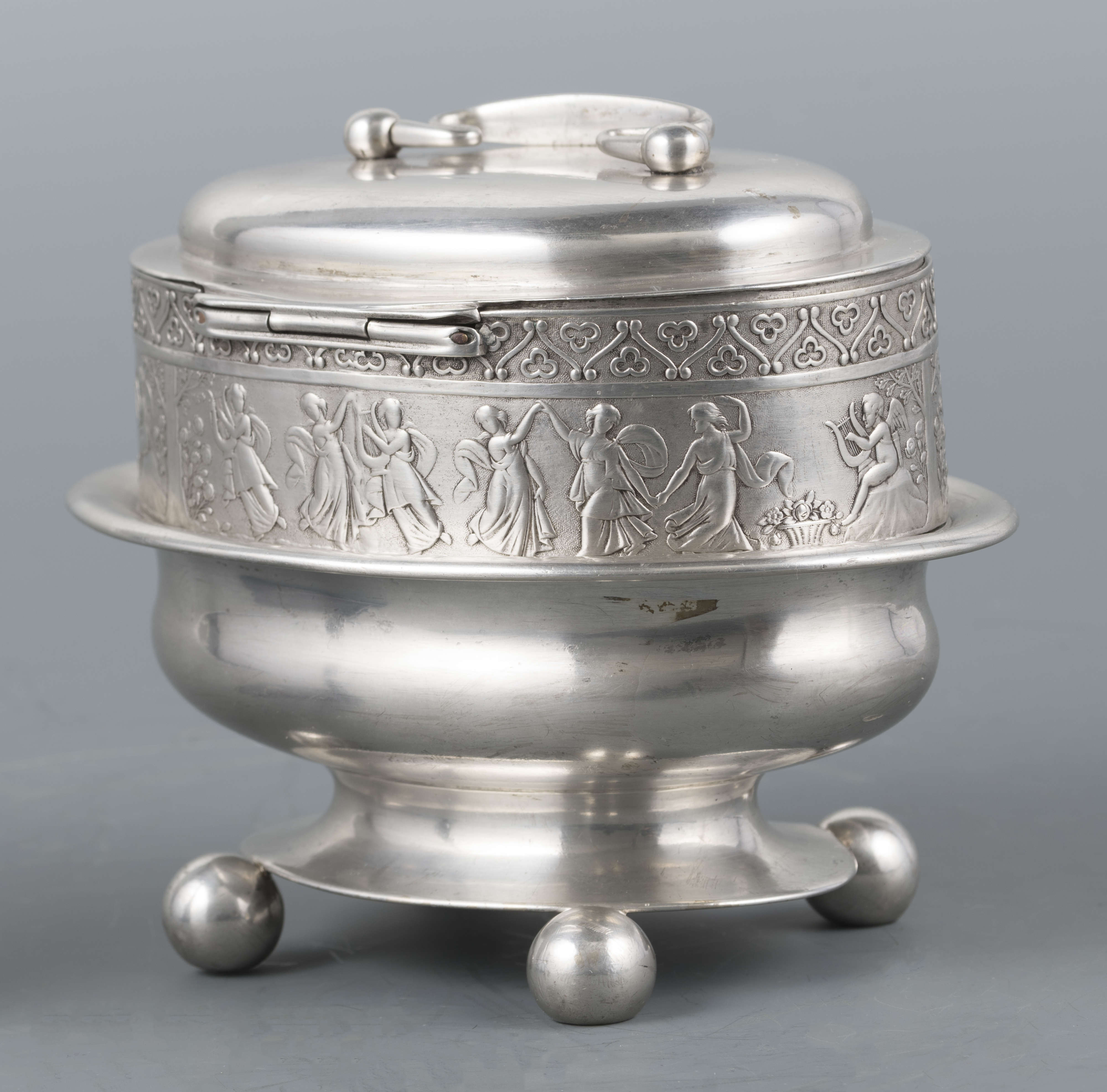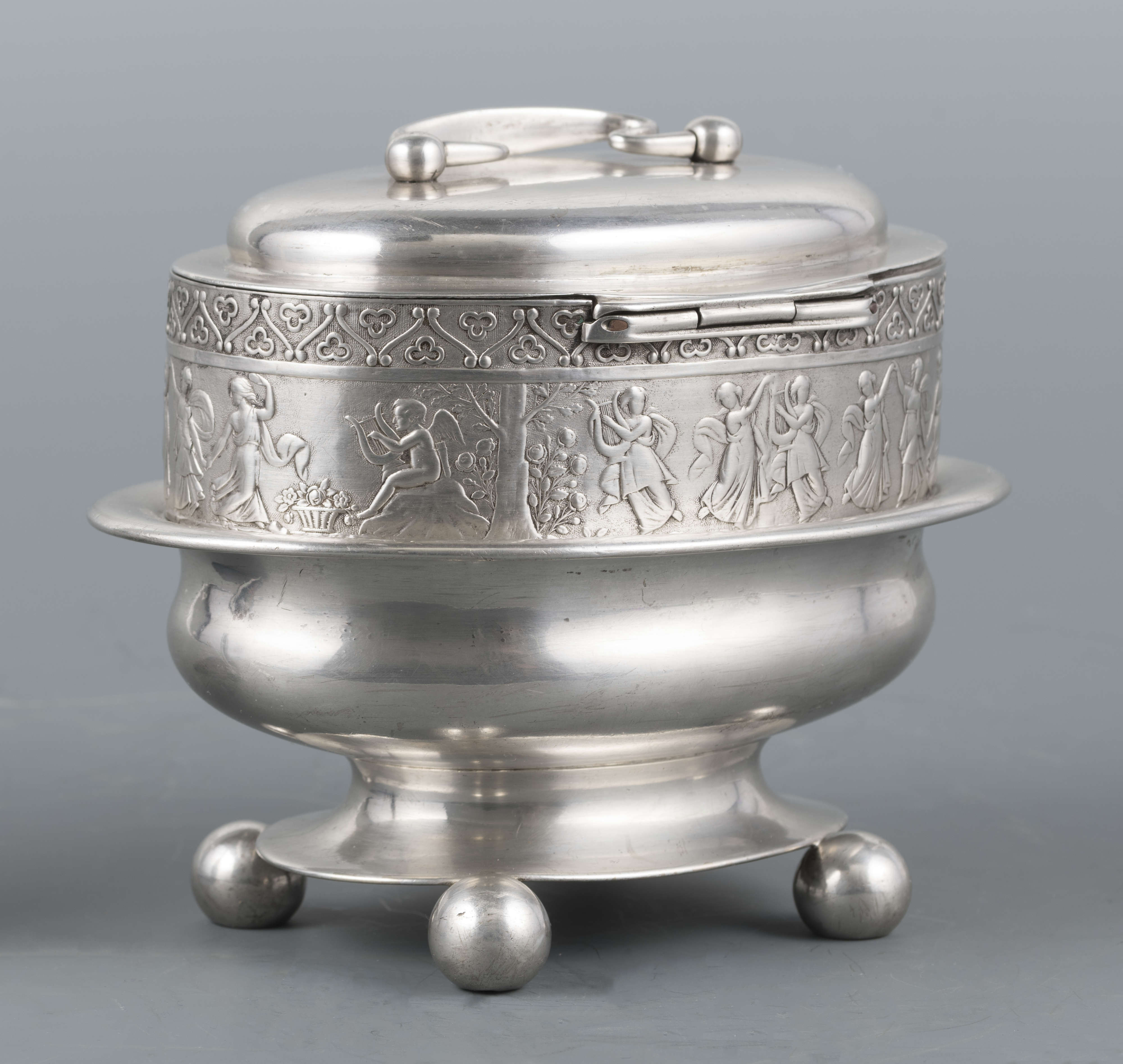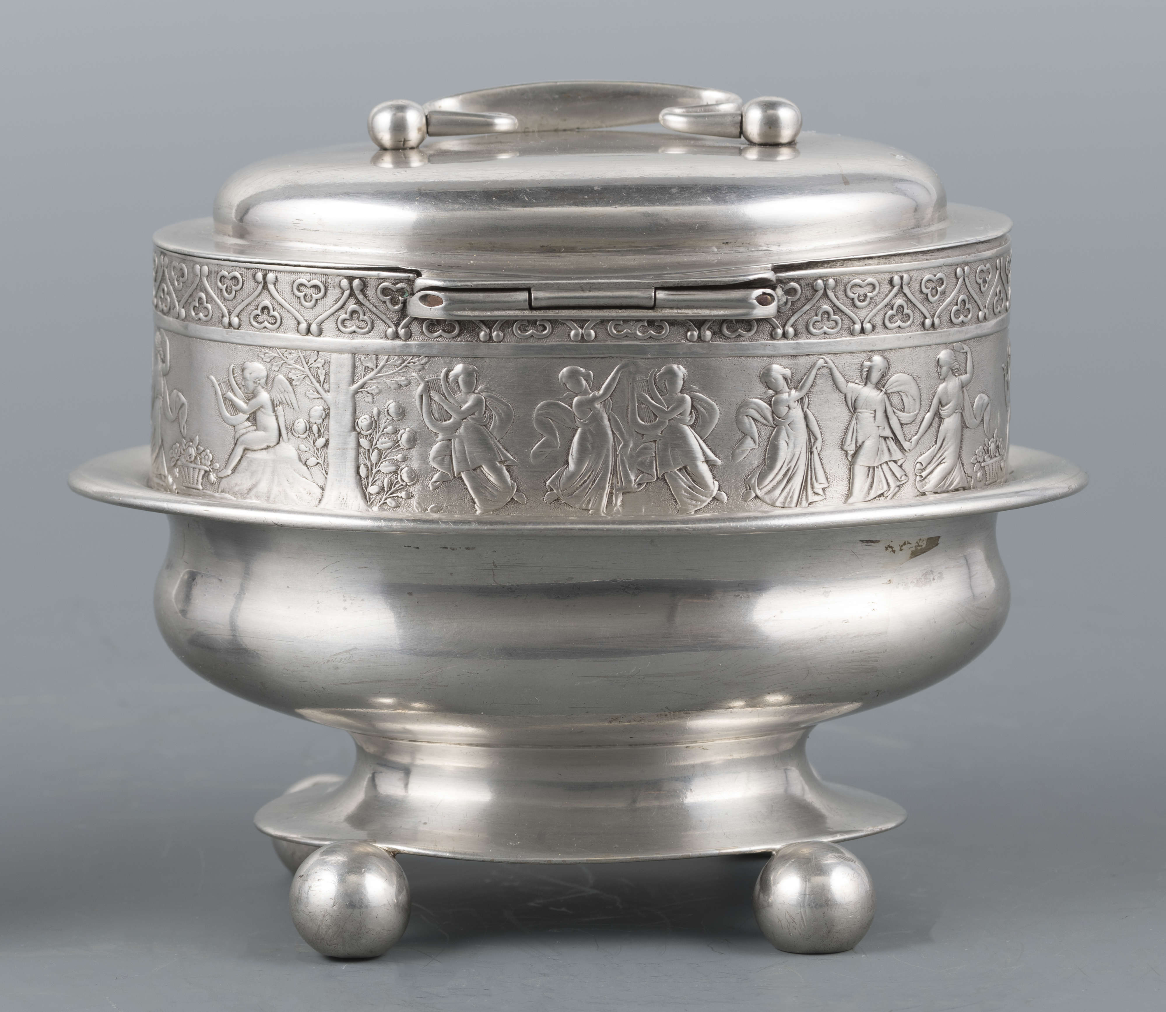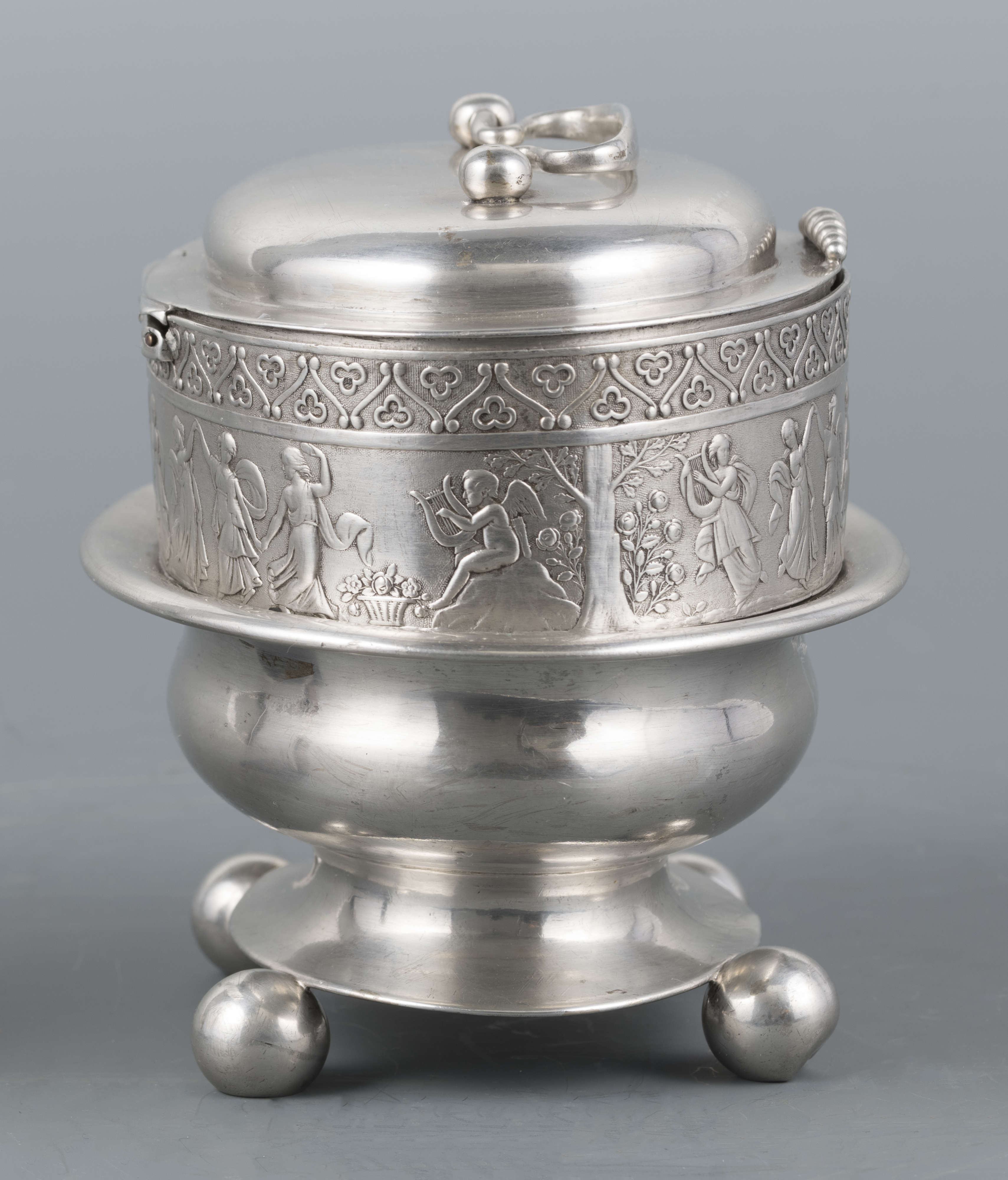 Część dolną cukiernicy tworzy lekko wybrzuszona gładka powierzchnia kończąca się w połowie wysokości przedmiotu wywiniętym kołnierzem, natomiast część górną – szeroki pas ze sztancowanej taśmy. Sztancowanie jest techniką kształtowania metalowych wyrobów artystycznych. W tej metodzie złotnik wykorzystuje punce, czyli stemple, a także płyty służące do wygniatania, zwane matrycami , i do jednorazowego tłoczenia form złożonych. Dzięki temu sposobowi pojedyncze uderzenie stempla lub matrycy jest wystarczające do wytłoczenia skomplikowanego wzoru, który stanowi niewysoki relief o miękkim, ciągłym kształcie, pozbawionym ostrych krawędzi i kątów.