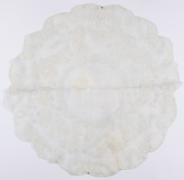 Biała okrągła serwetka o buklowanym brzegu została wyhaftowana białą nicią. Tego typu wyroby o prostej estetyce pojawiały się w Chinach już w 2. ćw. XIX w., jednak to od 2. poł. XIX w. i 1. poł. XX w. powstawało więcej takich prac. Hafty wykonane białą nicią na białym podłożu to część zachodniej hafciarskiej tradycji dekoracji stołu. Ale Chińczycy zaadaptowali ją do tych swoich prac, które były głównie eksportowane na rynek zachodni. W omawianym wyrobie pojawiają się motywy chińskie takie jak lotos, czy ryby. Ponieważ ryby mają mnóstwo potomstwa, symbolizują bogactwo i obfitość wszystkiego, czego można sobie życzyć. Często pojawiają się w sztuce ludowej jako motyw gratulacyjny. Symbolika lotosu natomiast powiązana jest z buddyzmem i oznacza czystość.