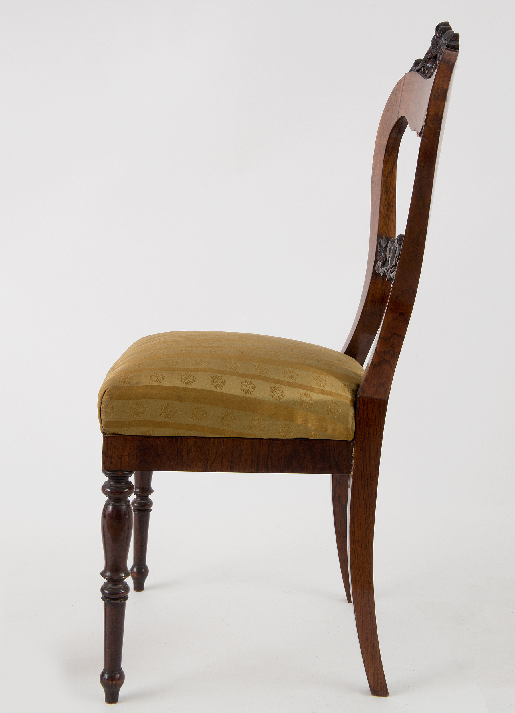 Krzesło o trapezoidalnym siedzisku, na czterech nogach z których przednie są tralkowo toczone, zaś tylne o przekroju kwadratowym, lekko zbieżne, nieco odgięte ku tyłowi, płynnie przechodzą ramiaki boczne oparcia, esowato odchylonego do tyłu. Oparcie ażurowe o kształcie balonowym, szersze u góry, w dolnej partii przewężone i związane rzeźbioną łączyną o motywach roślinnych. Szerokiego ramiak górny z wyraźnym ugięciem, od dołu ozdobnie podkrojonym, od góry ozdobiony ażurowym rzeźbionym zwieńczeniem o motywach roślinno-muszlowych. Ramiaki boczne oparcia zwężające się ku dołowi, tuż nad siedziskiem przełamane, poniżej przełamania przechodzące w tylne nogi. Okrzynienie proste. Ramiaki oparcia, oskrzynienie oraz tylne nogi pokryte fornirem palisandrowym, przednie nogi oraz elementy rzeźbione lakierowane, w kolorze ciemnobrązowym. Siedzisko tapicerowane, obite złotym adamaszkiem w parzyste kremowe pasy pokryte deseniem z wieńców laurowych.