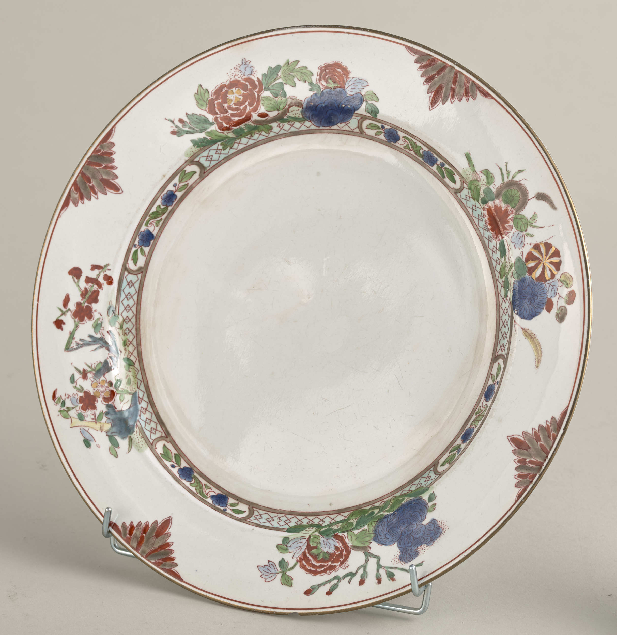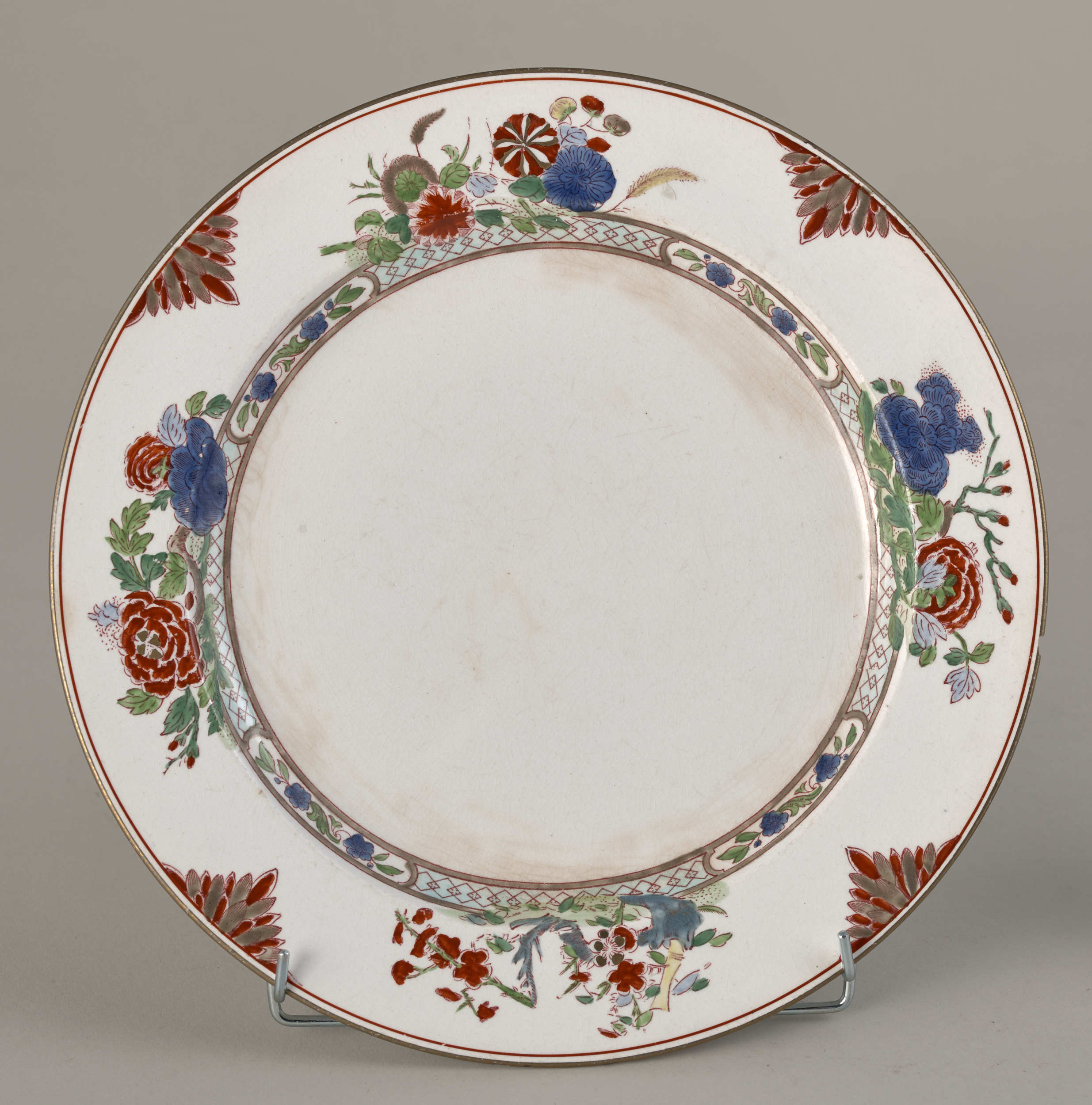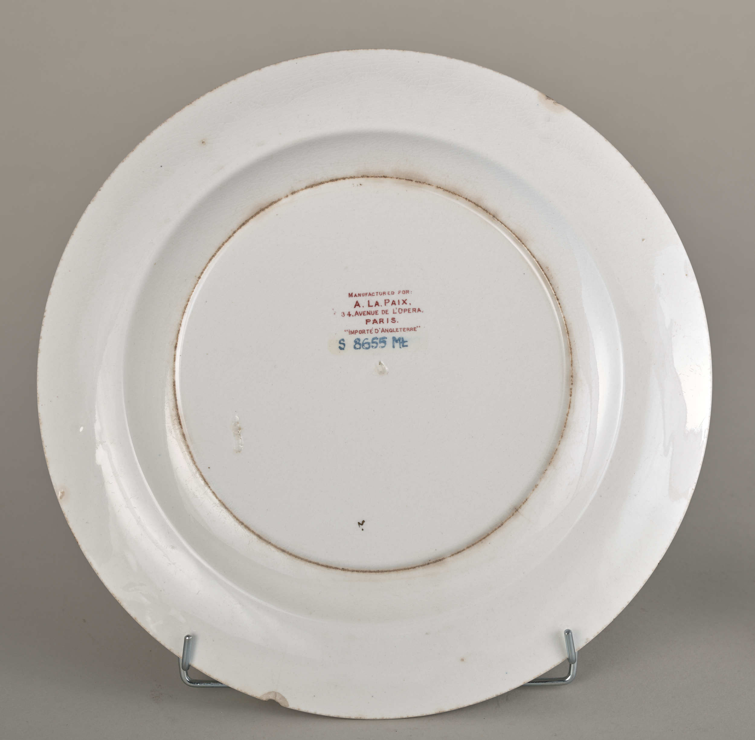 Talerz płytki z dekor chinizującą. Talerz płytki, fajansowy o lekko kremowym odcieniu, pokryty siatką ozdobnych spękań szkliwa, zdobiony dekoracją malarską w typie dalekowschodnim o motywach roślinno – geometrycznych, a skoncentrowaną w partii kołnierza. Szczegółowy rysunek wzoru dekoracji naniesiony drukiem w kolorze purpurowym, następnie już na szkliwie- ręcznie podmalowany farbami w kilku kolorach: rdzawa czerwień, ciemnoniebieski, zielony, piaskowo-beżowy. Natomiast w mniejszości użyto farb w kolorach: jasnoniebieskim, stalowozielonym, seledynowym i żółtym. Na dekorację tę składa się pas ornamentu geometrycznego z motywem rombów, biegnący tuż pod krawędzią wrębu, następnie cztery duże kompozycje kwiatowo-roślinne, a jedno z nich z motywem połamanego krzewu, rozmieszczone na kołnierzu, blisko pasa ornamentu. Kompozycje te rozdzielone są liściastymi półrozetami. Złoto znajduje się jedynie w pasku lamującym brzeg kołnierza i drobnych elementach trzech kwiatów w dużych kompozycjach. Odwrocie talerza pokryte jest pod szkliwem szarymi plamkami. Widoczne oznakowania: w centralnym punkcie litera „B”, sygnatura fabryki „BOOTHS” – obydwa znaki stemplowane w masie i duża pieczęć drukowana podszkliwnie w kolorze bordowym: „MANUFACTURED FOR:/A.LA.PAIX,/34.AVENUE DE L’OPERA, /PARIS./IMPORTE D’ANGLETERRE”. Pod nią napis z aktualnym nr inwen. Anglia, Hanley, XIX w.
