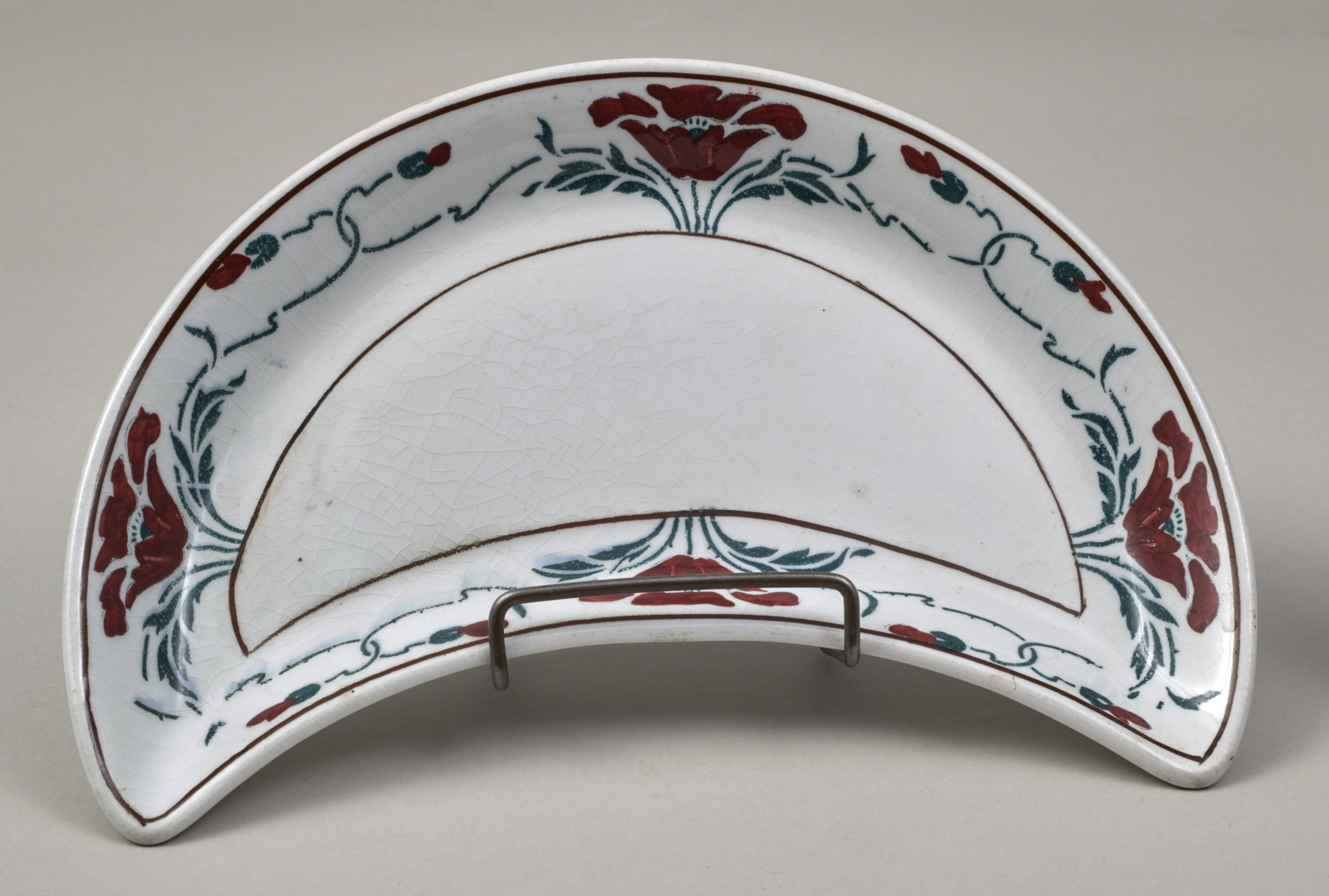 Talerzyk przystawkowy z fajansu o żółtawej tonacji, posiadający kształt półksiężycowatej, płytkiej rynienki, dostosowany do ustawienia przy okrągłym, płytkim talerzu. Lustro talerza płaskie, a kołnierz stromy, tj. ukośnie odchylony na zewnątrz. Kołnierz obiega rodzaj bordiury z dwubarwnym wzorem maków (płatki kwiatowe bordowo-czerwone, łodygi i liście w kolorze ciemnej, morskiej zieleni), stylizowanych w duchu umiarkowanej secesji. Na wzór składają się cztery kielichowate kwiaty stojące pomiędzy parą liści, odpowiadające punktom osiowym, powiązane, a zarazem mijające się z dwoma pąkami kwiatowymi na długich, wężykowatych łodygach, które w miejscu spotkania pętlowo zahaczają o siebie. Bordiura wpisana jest pomiędzy dwa brązowe prążki, z których cieńszy obrysowuje powierzchnię lustra, a grubszy obiega krawędź kołnierza. Wzór został namalowany na wpół mechanicznie przy zastosowaniu szablonu, tzw. przepróchy. Bezpośrednio przez szablon naniesiono liście i łodygi ciemną podszkliwną zielenią. Natomiast płatki kwiatowe malowano już z wolnej ręki, również podszkliwną farbą w kolorze bordowo-czerwonym. Powierzchnie talerza pokrywa drobna siatka spękań szkliwa. Na odwrociu dna dwie sygnatury w zielony, pieczętnym nadruku. Jedna przedstawia znak kotwicy w owalu, pod nim napis S.B. i S /ENGLAND, druga to sygnatura magazynu londyńskiego SOUTH AUDLEY ST/ T. GOODE & Co/ LONDON. W. Na uwagę zasługują tu wyraźnie uwidaczniające się spod zielonych partii wzoru roślinnego niebieskie przebicia tego wzoru. Szczególnie występuje ona na krótszym odcinku kołnierza. Drugą charakterystyczną cechą jest optyczne zmniejszenie płaszczyzny lustra, poprzez przesunięcie linii brązowego prążka zarysowującego jego pole, przez granicę załamania się partii lustra w krzywą kołnierza. Prążek ten poza tym prowadzony jest niezdecydowaną ręką, tj. często wychodzącą z toru. Obok sygnatur występuje znak malarza kwiatów postaci ręcznie napisanej bordową farbą cyfry „2”.