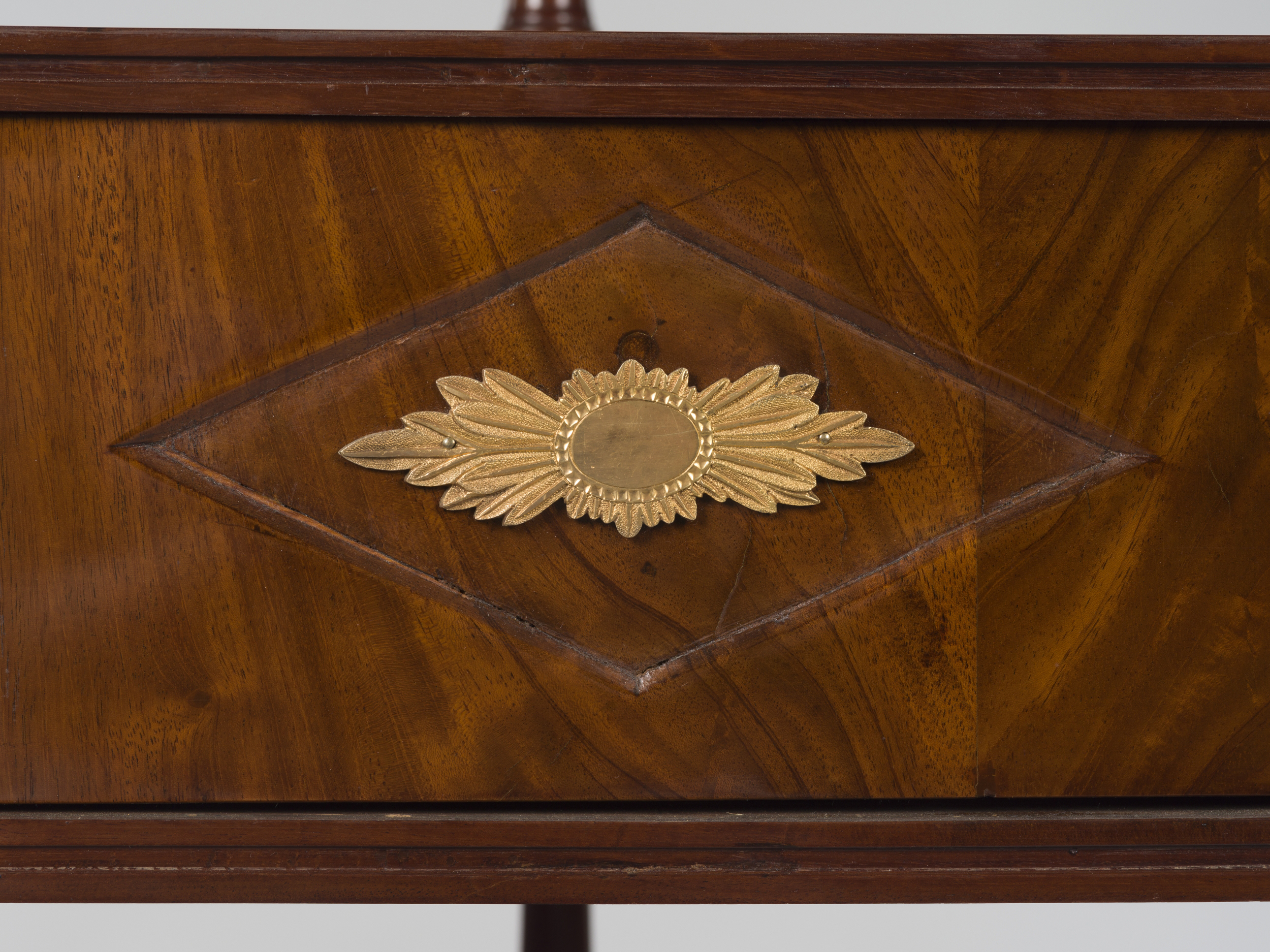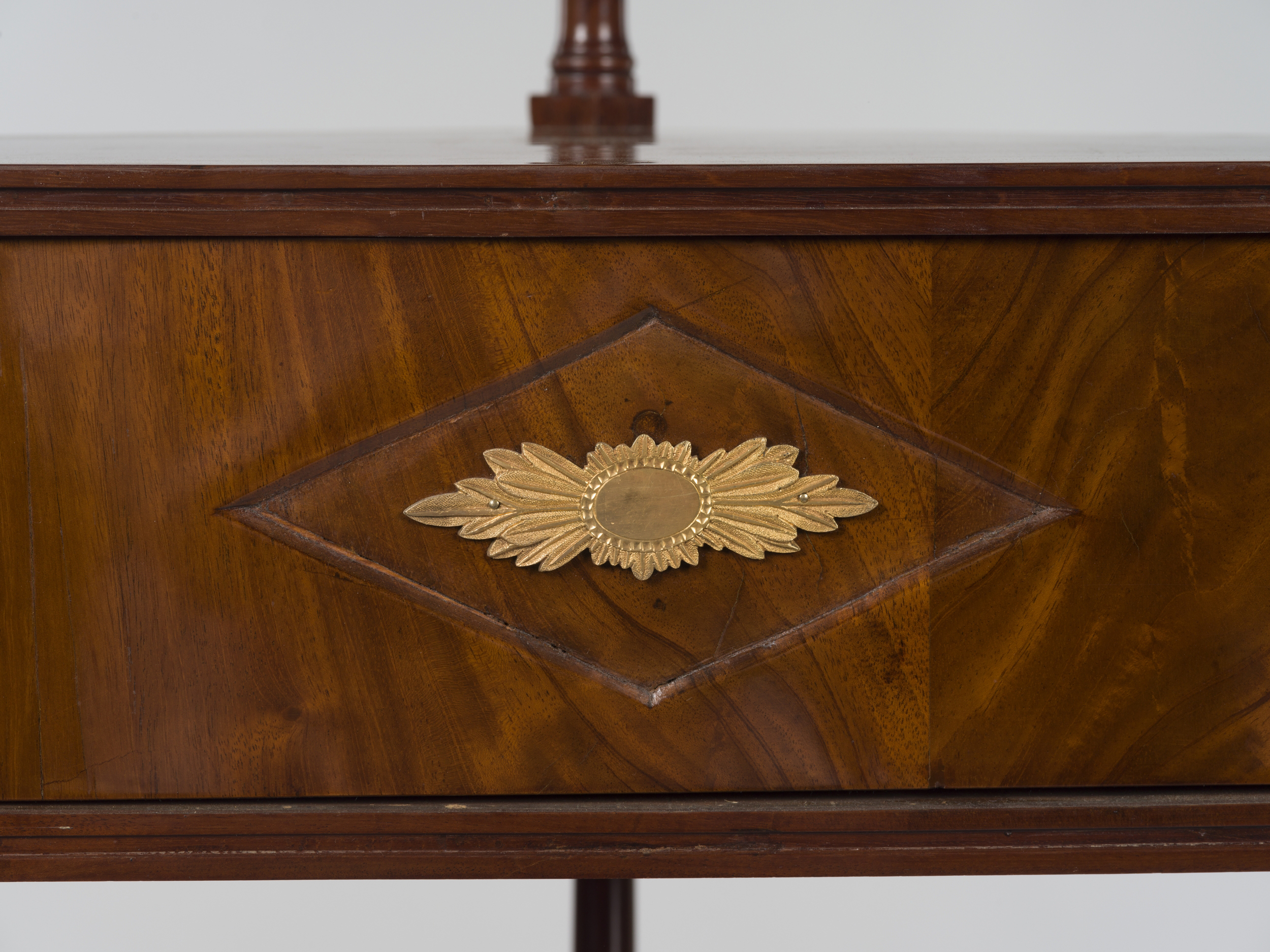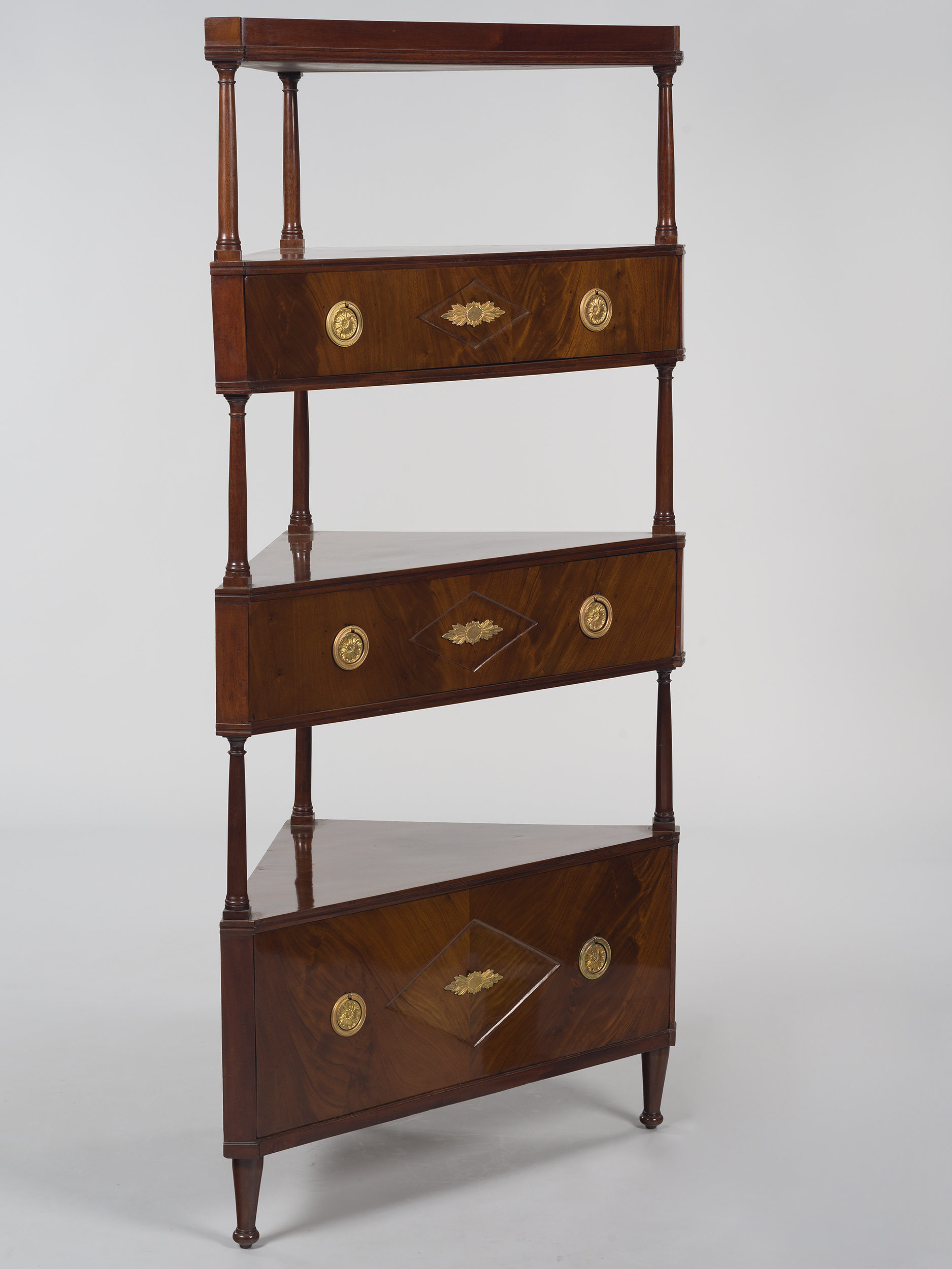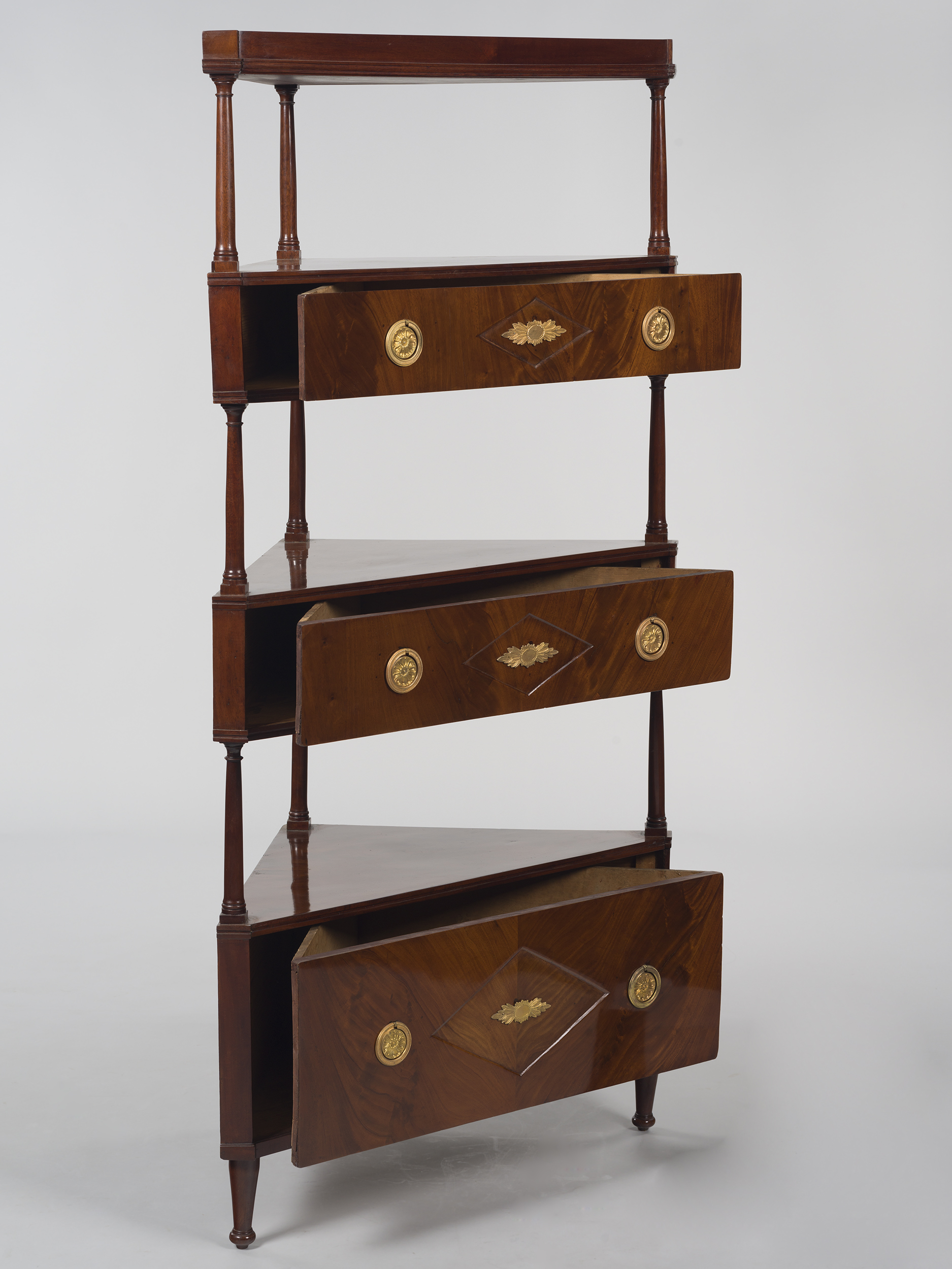 Etażerka kątowa o czterech kondygnacjach, wsparta na zbieżnych stożkowatych nóżkach zakończonych kulistymi stopkami. Najniższą kondygnację stanowi półka wsparta na wysokiej szufladzie. Lico szuflady fornirowane jest drewnem egzotycznym o czerwonej barwie i ozdobione zostało dwiema złoconymi antabami kołatkowymi o okrągłych uchwytach, zawieszonych na okrągłych szyldach z motywem rozety. Między antabami znajduje się wklęsła płycina w formie spłaszczonego rombu ozdobiona pośrodku wtórnie podłużną plakietką w formie owalnego kartusza ujętego po bokach w dwa pęki liści akantu, zasłaniającą na stałe kluczynę zamka. Kolejne dwie kondygnacje są podobne, jednakże ich szuflady są o połowę niższe od najniższej. Najwyższą kondygnację stanowi gładka półka zamykająca całość od góry. Wszystkie kondygnacje mają ścięte prosto i nieznacznie wyłamane do przodu.