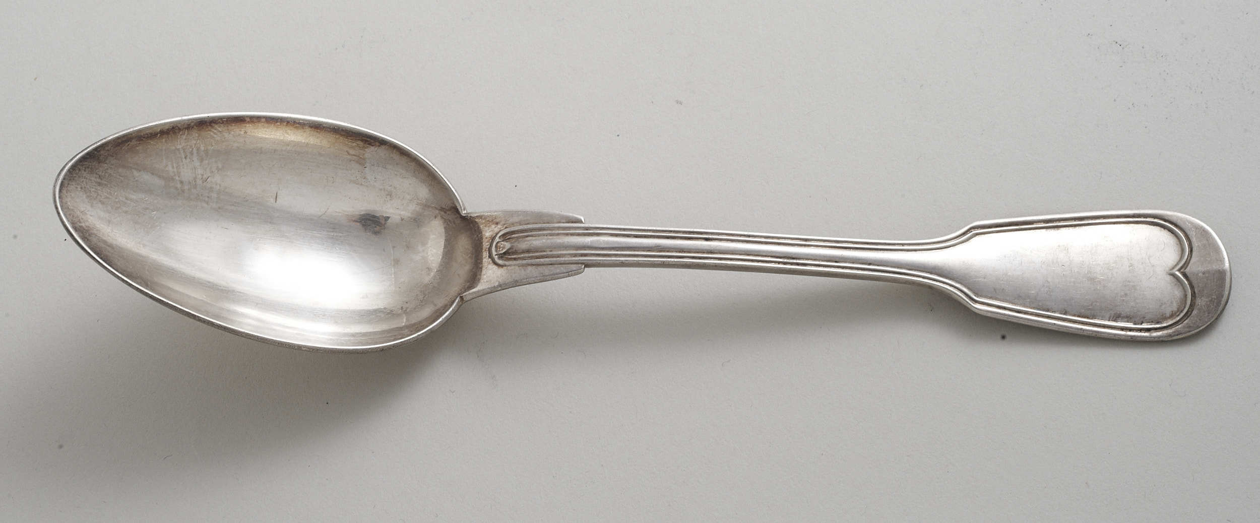 Łyżka z elipsowatym czerpakiem węższym przy zakończeniu i szerszym przy trzonku. Trzonek płaski z rozszerzonym zakończeniem ozdobiony podwójnym profilowaniem. Na rewersie w dolnej części trzonka widoczna korona hrabiowska a pod nią herb Potockich - Pilawa. Po bokach symetrycznie rozmieszczone litery R i P a pod herbem widoczna szarfa z napisem „Julin”. Ponadto na przewężeniu trzonka wybito punce i stempel producenta „Christofle”.