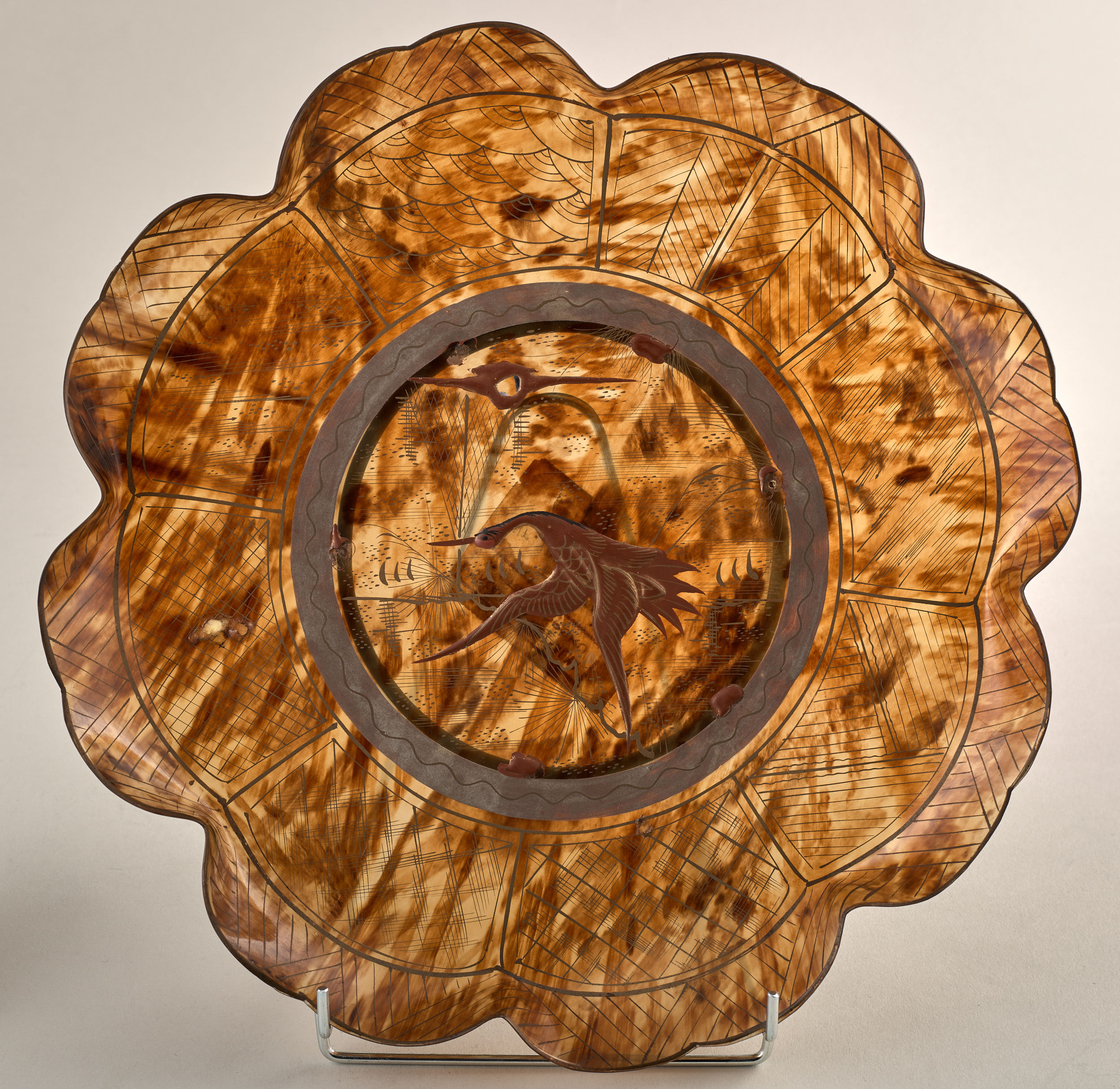 Patera japońska z szylkretu zdobiona motywem złotego żurawia, lecącego nad zatoką. Okrągła, z cienkiego arkusza szylkretu wyciętego i modelowanego tak, że wygląda na ośmiolistną rozetę. Pejzaż ukazany w polu centralnym, wycięty i ozdobiony masą perłową ślimaka haliotis – technika inkrustacji aogai. Wokół obrazka sześć małych skałek, skala i ptak wykonane w reliefie z masy plastycznej (węgiel drzewny sumi i ciekła żywica lakowa seshime, na tym laka czerwona e-urushi i pył złoty – technika takamakie.