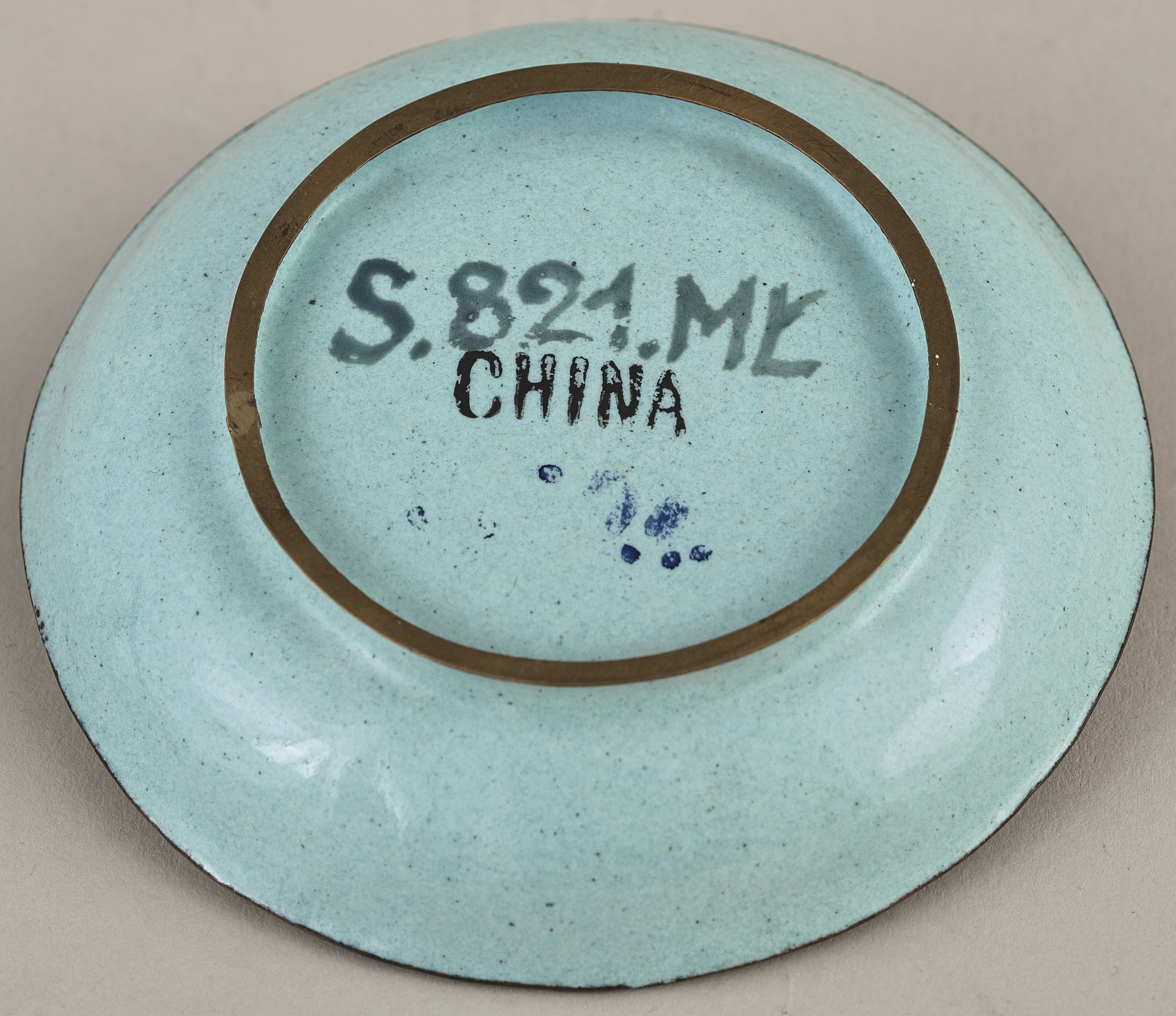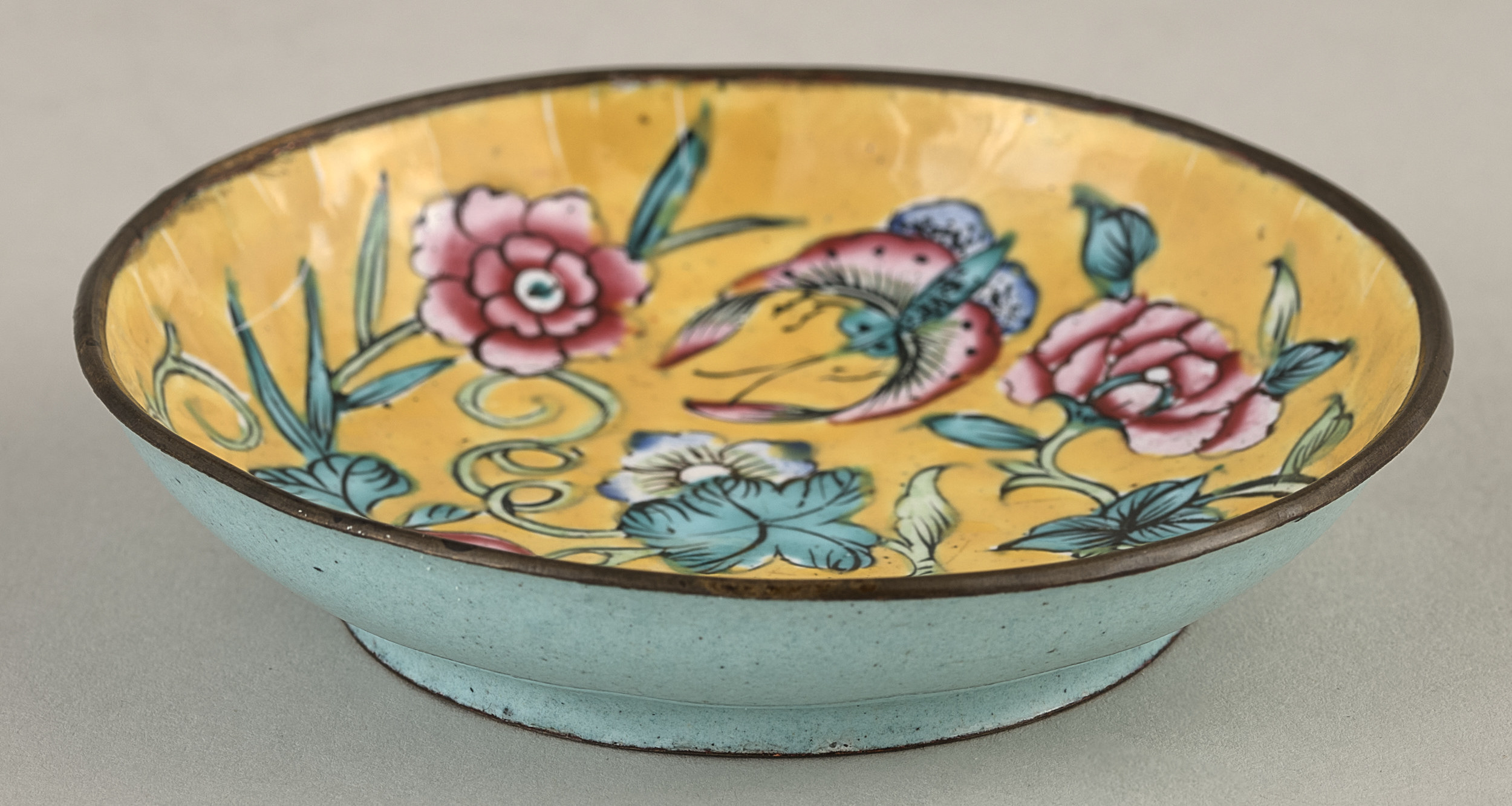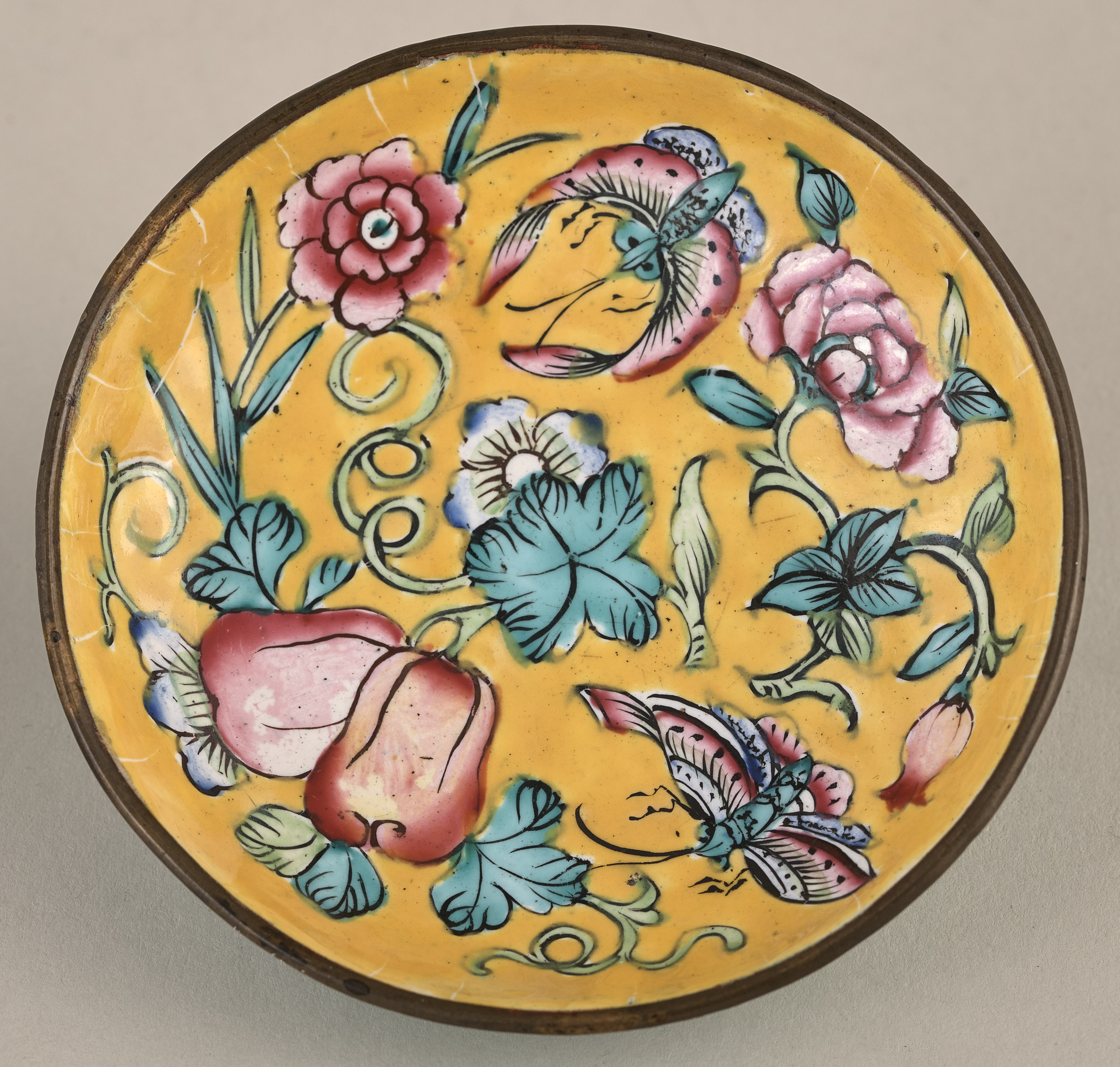 Talerzyk miedziany na niziutkiej, wyodrębnionej stopie, o gładkim lustrze, z brzegiem lekko wzniesionym ku górze, prosty, pokryty emalią w typie falang. Tło żółte, zdobione kwiatami, owocami i motylami w kolorach zieleni, różu i bordo, z czarnymi konturami i kreskowaniem. Odwrocie malowane emalią w kolorze blado turkusowym. Chiny, II połowa XIX wieku.