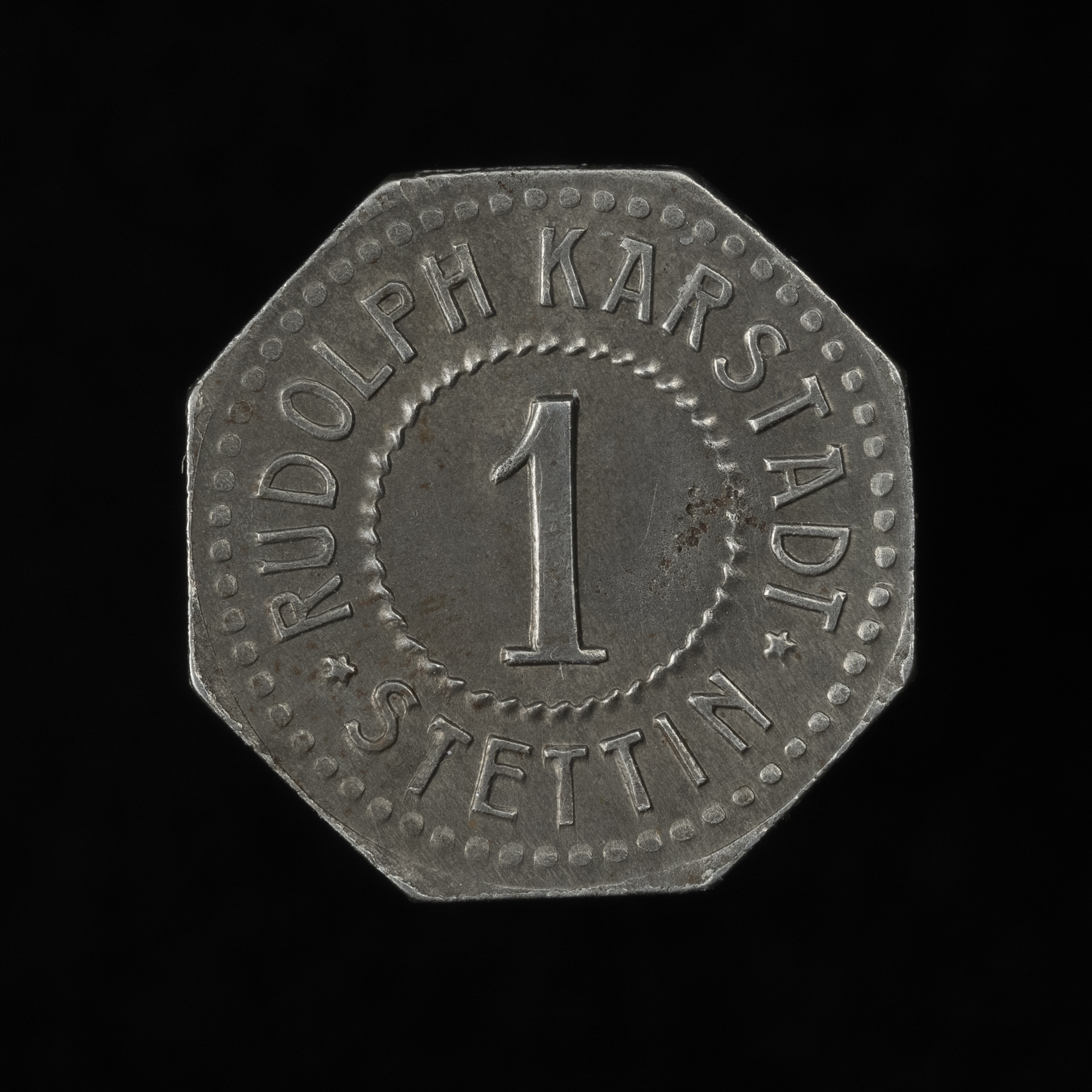 Jedną z nich był szczeciński dom handlowy Rudolpha Karstadta. Za pośrednictwem firmy L. Chr. Lauer z Norymbergii wyemitował dwie serie monet zastępczych. Prawdopodobnie najpierw wybito w cynku oktagonalne żetony w czterech nominałach: 1, 5, 10 i 50 fenigów. Następnie, mając już pewne doświadczenie w zapotrzebowaniu rynku, zamówiono większą ilość 1-fenigówek, tym razem wybitych w żelazie. O dużym nakładzie tej monety świadczy istnienie kilku odmian stempli, które w kontakcie z żelaznymi blankietami zużywały się znacznie szybciej niż w przypadku pracy z bardziej plastycznym cynkiem.