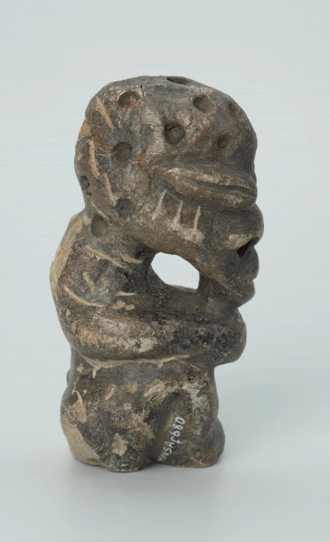 Rzeźbiona w steatycie postać ludzka w pozycji siedzącej ma głowę ozdobionąo licznymi okrągłymi wgłębieniami, natomiast całe ciało pokrywają pionowe i ukośne nacięcia. W ten sposób prawdopodobnie zaznaczono skaryfikację.