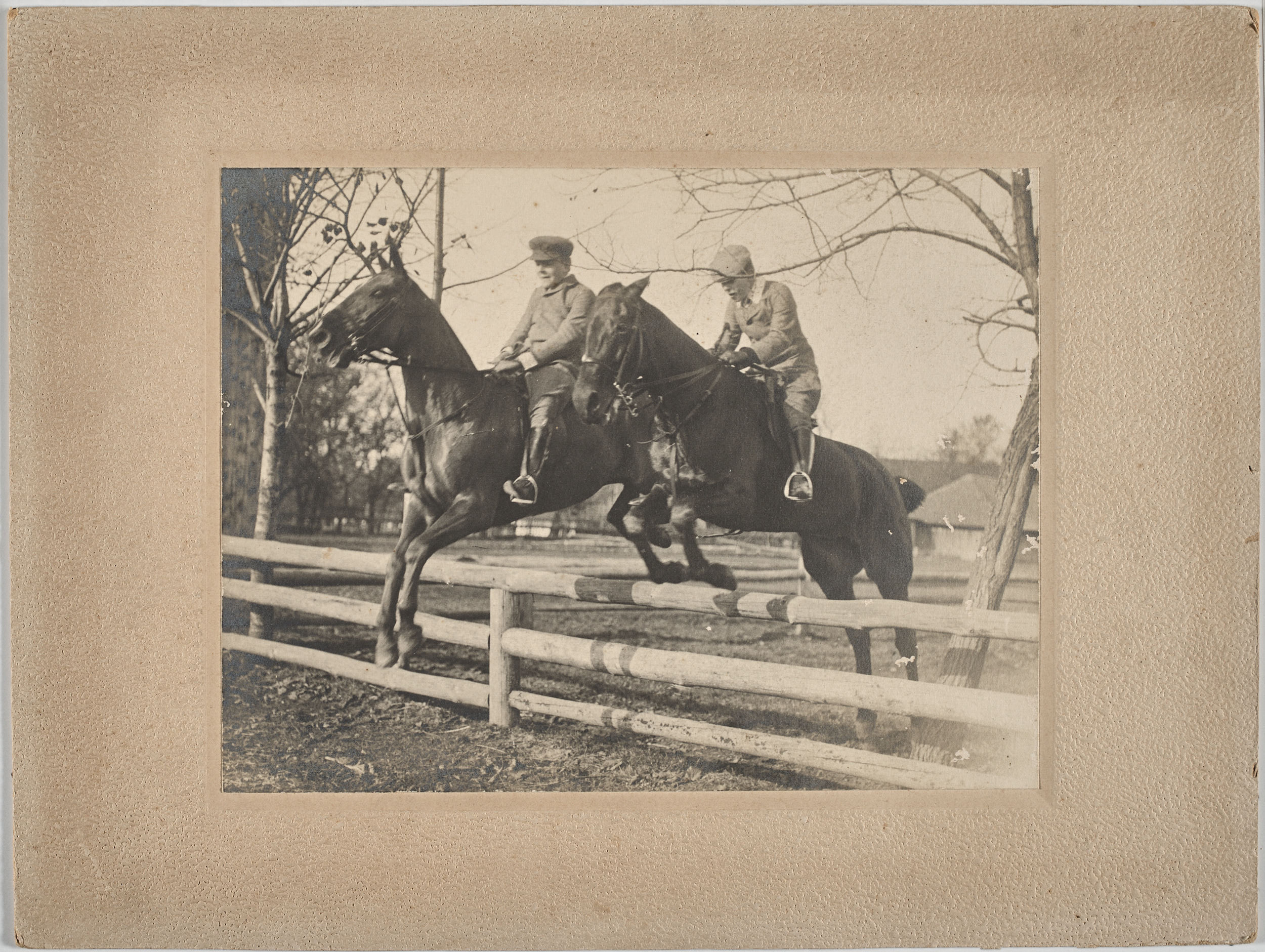 Fotografia przedstawia synów Romana Potockiego III ordynata, Alfreda Antoniego (ur. 1886), późniejszego IV ordynata łańcuckiego i Jerzego Antoniego (ur. 1889) wojskowego i dyplomatę (ambasadora II RP w Ankarze i w Waszyngtonie) skaczących konno przez płot z drewnianych żerdzi. Obaj w chłopięcym wieku, ubrani w kurtki, bryczesy i wysokie buty do konnej jazdy oraz kaszkiety dosiadają koni pełnej krwi ciemnej maści. Nieznane jest miejsce ani dokładny czas wykonania tej fotografii. Powiększona reprografia tej fotografii eksponowana jest na stałej ekspozycji w Korytarzu Hippicznym w Stajni Zamkowej.