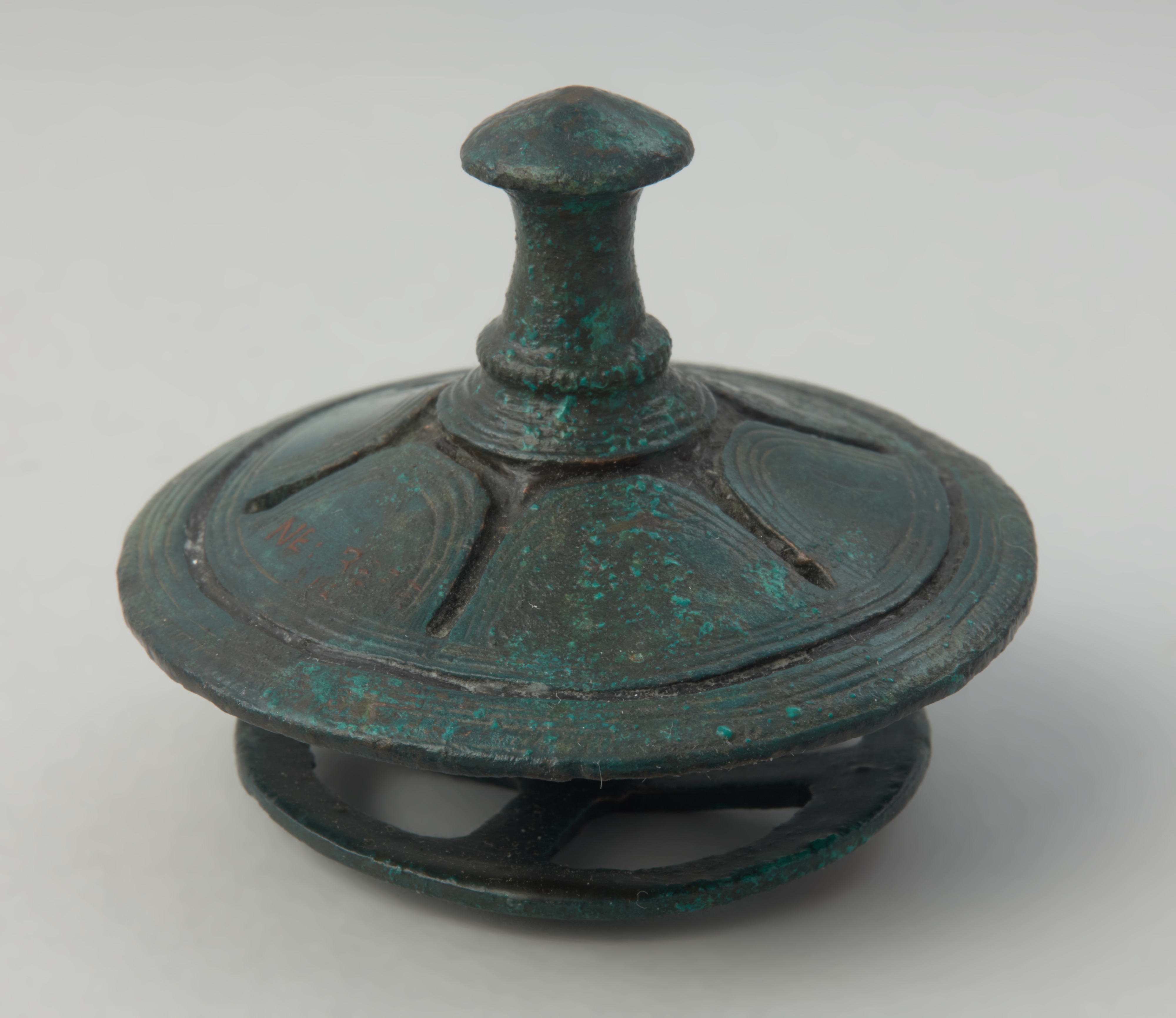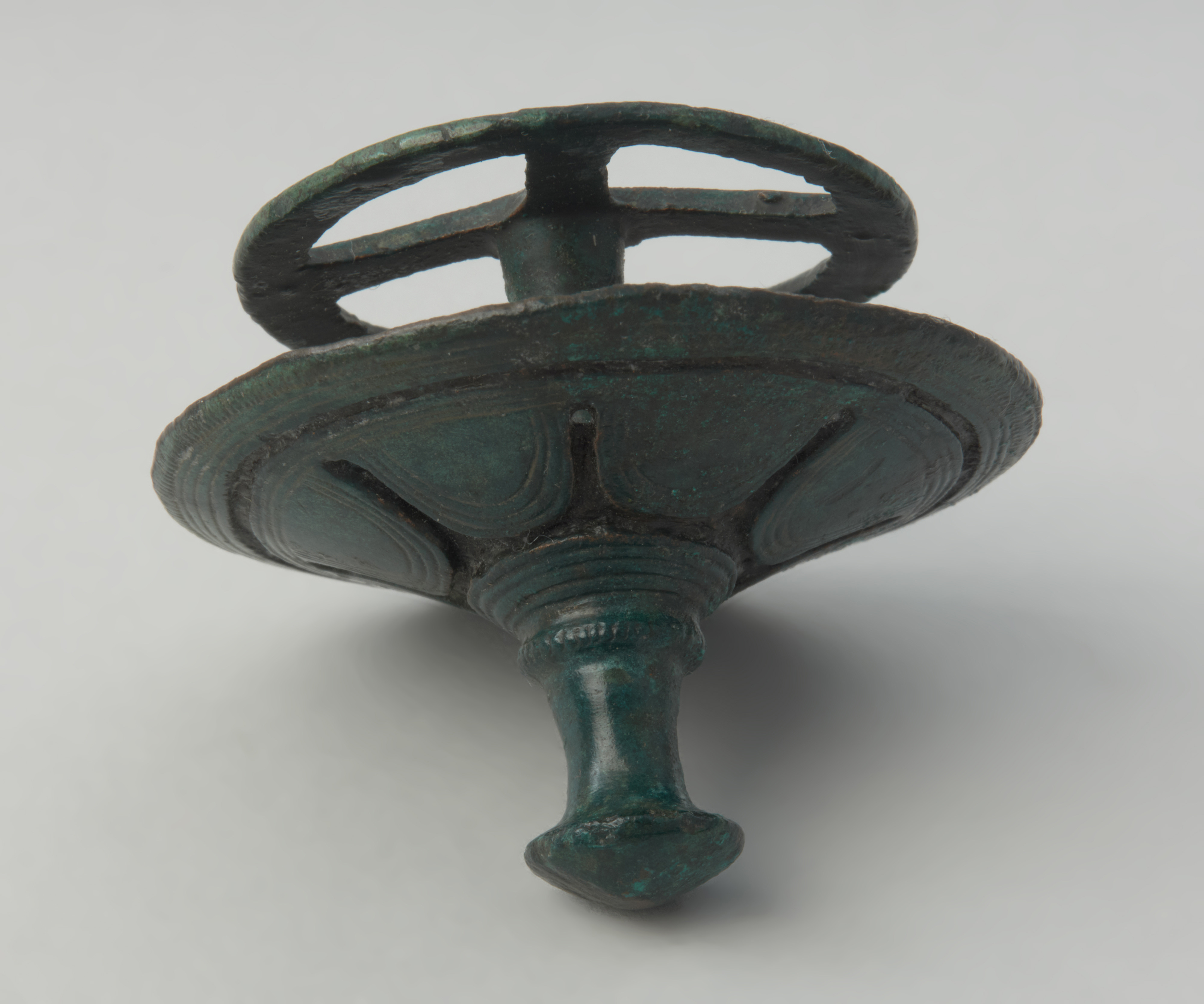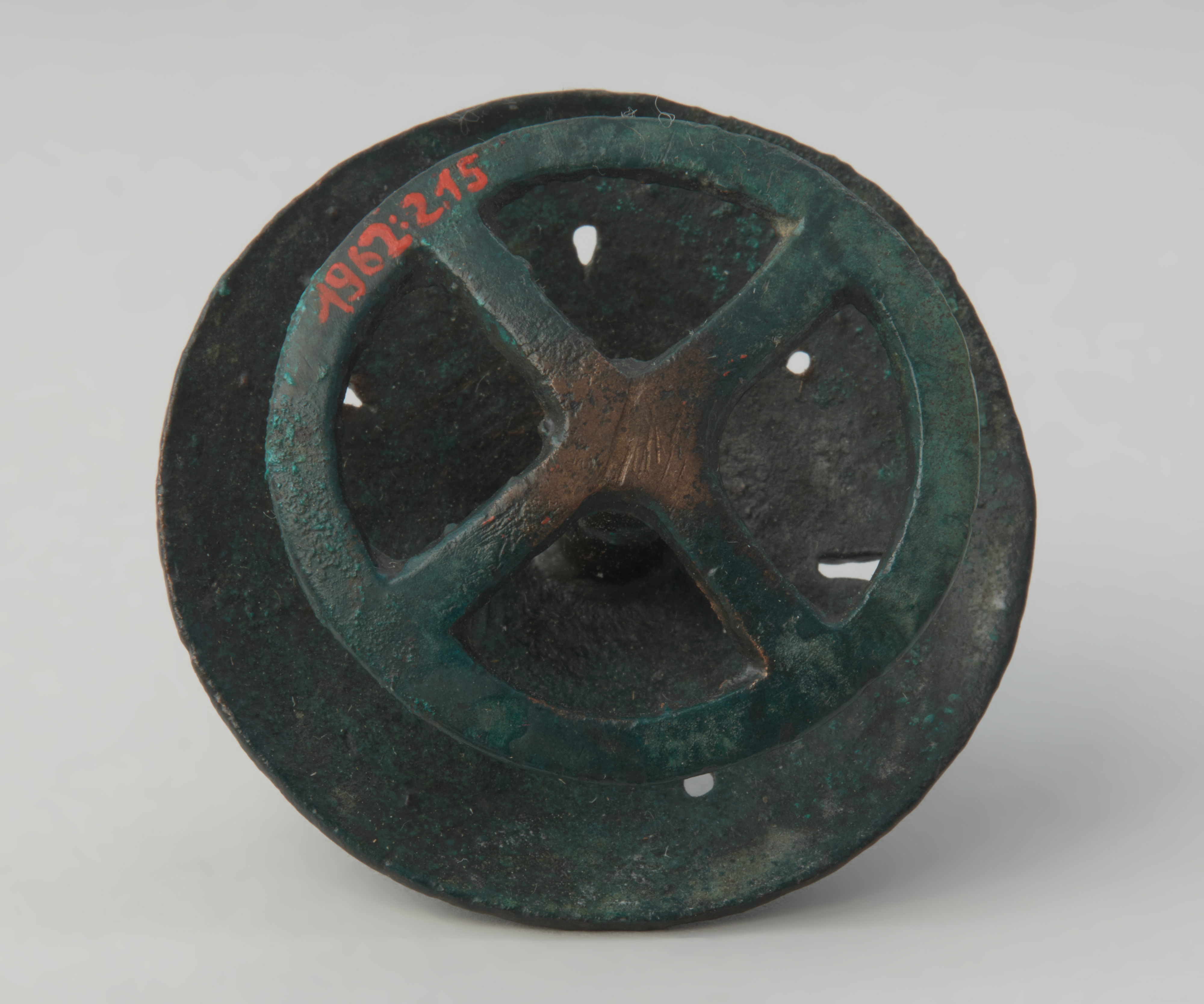 Brązowy ozdobny guz, tzw. tutulus, znajdował się w urnie z prochami umieszczonej w grobie skrzynkowym, na cmentarzysku z młodszej epoki brązu (ok. 1100-900 p.n.e.) w miejscowości Unieradz. Składa się z dwóch tarczek oraz kolca. Górna tarczka ma imponujące zdobienie w postaci żłobków, ażuru, linii rytych, nacięć oraz motywu solarnego, dolna natomiast ma postać koła z czterema szprychami. Jest importem z obszarów objętych osadnictwem ludności reprezentującej kulturę nordyjską. Tutulus pochodzi z okresu zmian w systemie wierzeń, jakie dokonały się na znacznych terenach Europy. Polegały one między innymi na upowszechnieniu się kultu słońca. Zmianie uległ obrządek pogrzebowy – pochówki ciałopalne w urnach-popielnicach zastąpiły pochówki szkieletowe. Fascynacja ciałami niebieskimi znajduje też odzwierciedlenie w dodatkach do stroju, w postaci lunul i dysków – symboli księżyca i słońca. Ludności z młodszej epoki brązu nie była obca astronomia i system kalendarzowy. Ze Skandynawii znane są ryty naskalne przedstawiające motyw wędrówki słońca umieszczonego na łodzi lub na wózku konnym. Społeczności epoki brązu charakteryzuje przywiązanie do symboliki, różnego rodzaju rytuałów i cykli, m.in. życia i śmierci, dnia i nocy.