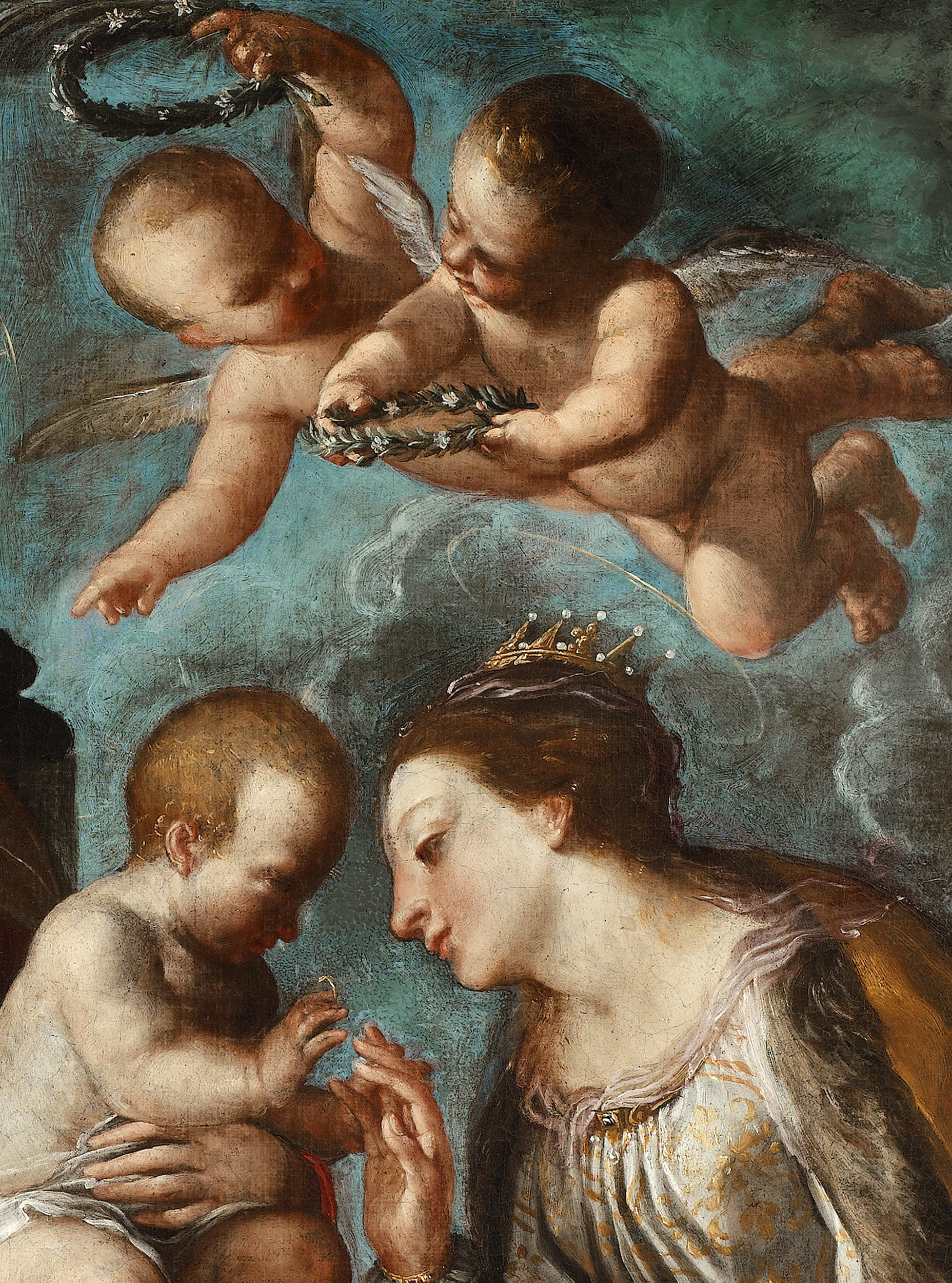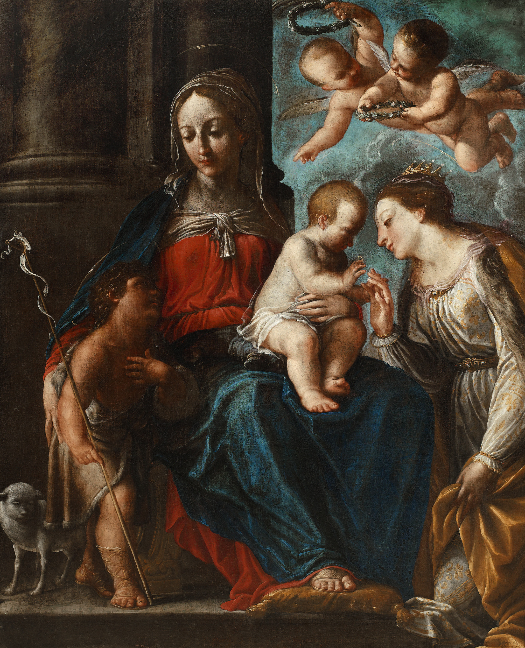 Koncepcja Mistycznych zaślubin Brizziego zakłada uchwycenie pewnego napięcia psychologicznego między osobami, a zarazem uwidacznia skłonność malarza do rzetelnego przedstawienia rzeczywistości. Madonna z Dzieciątkiem tronuje na tle monumentalnej architektury, wykreślonej z autentyczną znajomością form. Podtrzymując dłonią Jezusa, kieruje melancholijne spojrzenie ku stojącemu obok św. Janowi Chrzcicielowi, którego gesty wyrażają głęboką emocję, i zdaje się nie zwracać uwagi na scenę tytułową. Klęcząca u Jej stóp Katarzyna Aleksandryjska należy do świętych najbardziej czczonych w Kościele, a jej mistyczne zaślubiny do ulubionych toposów sztuki. Przekaz Złotej legendy, dotyczący jej osoby, z biegiem czasu zatracił ostrość, ginąc w mroku legend do tego stopnia, że niektórzy hagiografowie powątpiewali w jej historyczne istnienie. Przypuszcza się, że była chrześcijańską neofitką wysokiego urodzenia, która – w wizji mistycznej – poślubiła Zbawiciela. Aby uczynić zadość legendzie, chcącej widzieć w Katarzynie córkę króla Kustosa, malarz uwieńczył głowę świętej dziewczyny koroną, jej bogata suknia haftowana jest złotem, a z ramion spływa złoty płaszcz. Przedstawiona została w wystudiowanej pozie świadomej swego wdzięku księżniczki o arystokratycznych manierach, w momencie przyjmowania obrączki z rąk boskiego Oblubieńca.