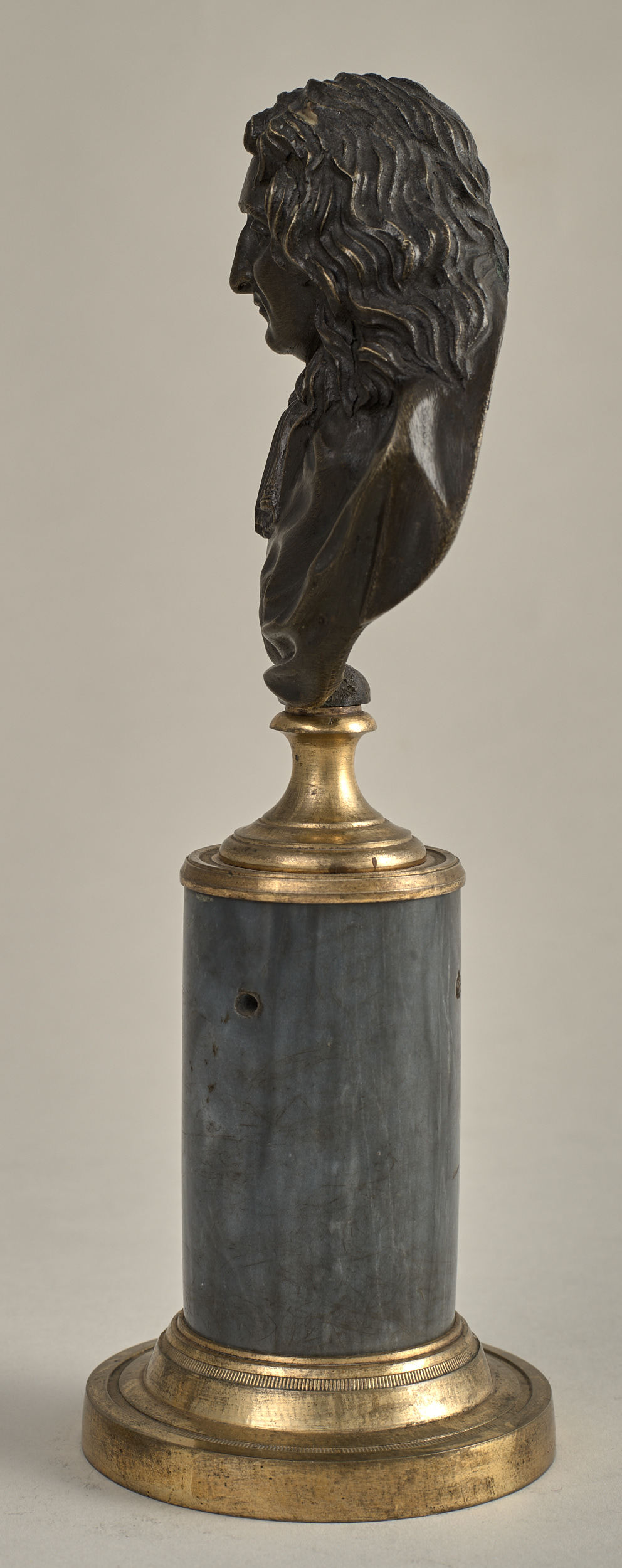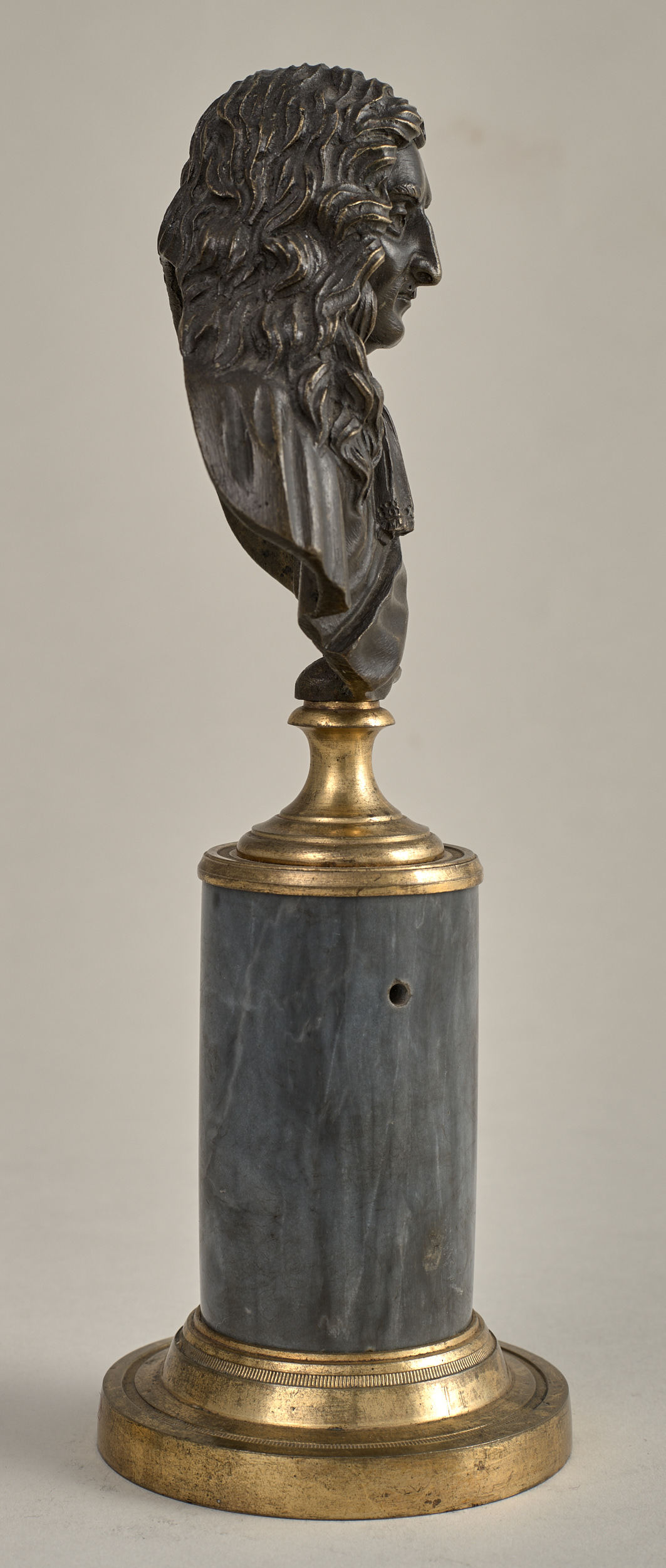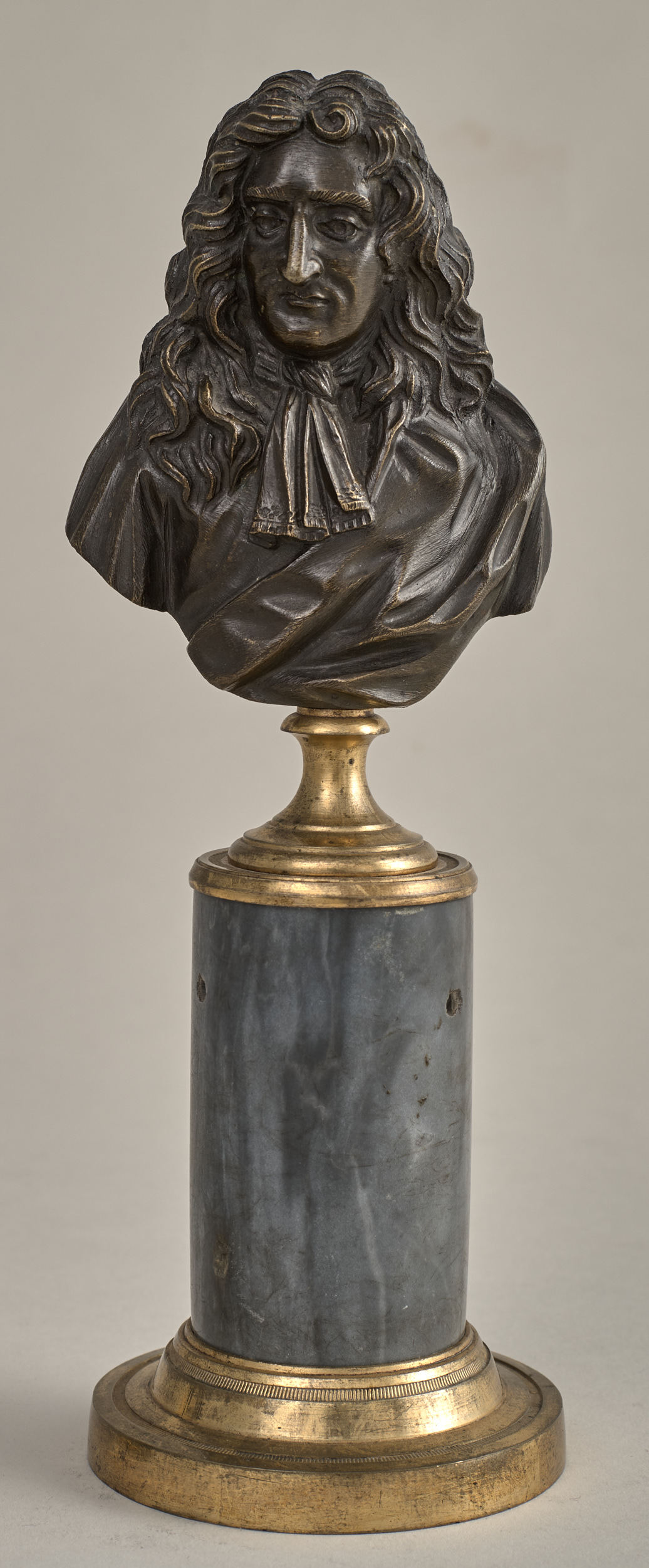 Jean de la Fontaine (1621 -1695) to francuski poeta i bajkopisarz. Brązowe, miniaturowe popiersie przedstawia go w starszym wieku, w peruce. Ma on pociągłą twarz, długi, orli nos, lekko skrzywione usta. Na jego ramiona narzucony jest luźny płaszcz, na szyi zawiązany szalik. Przez lewe ramię przełożona szarfa. Popiersie ustawione jest na podstawie złożonej z brązowego, złoconego cokoliku, cylindrycznego, marmurowego trzonu (brak metalowego łańcuszka) i brązowej, złoconej bazy. Twórca popiersia nie jest znany. Zapewne był nim francuski rzeźbiarz. Rzeźba wykonana została na przełomie XVIII i XIX w. Zdobi kominek w sypialni w Apartamencie Paradnym, wraz z drugim brązowym, miniaturowym popiersiem przedstawiającym Jeana Baptiste Racine`a (nr inw. S. 11738 MŁ), na identycznej podstawie.