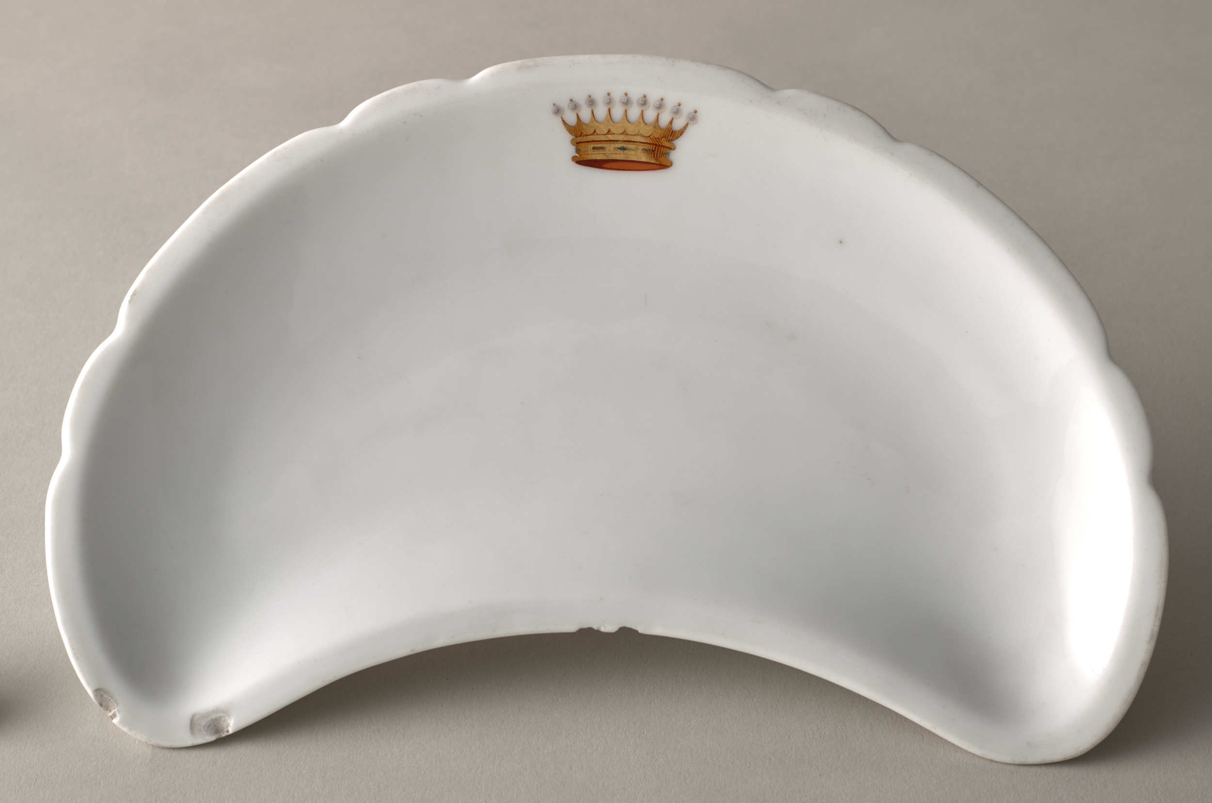 Talerzyk przystawkowy, w kształcie półksiężyca, z wyzębionym brzegiem, biały, z koroną hrabiowską