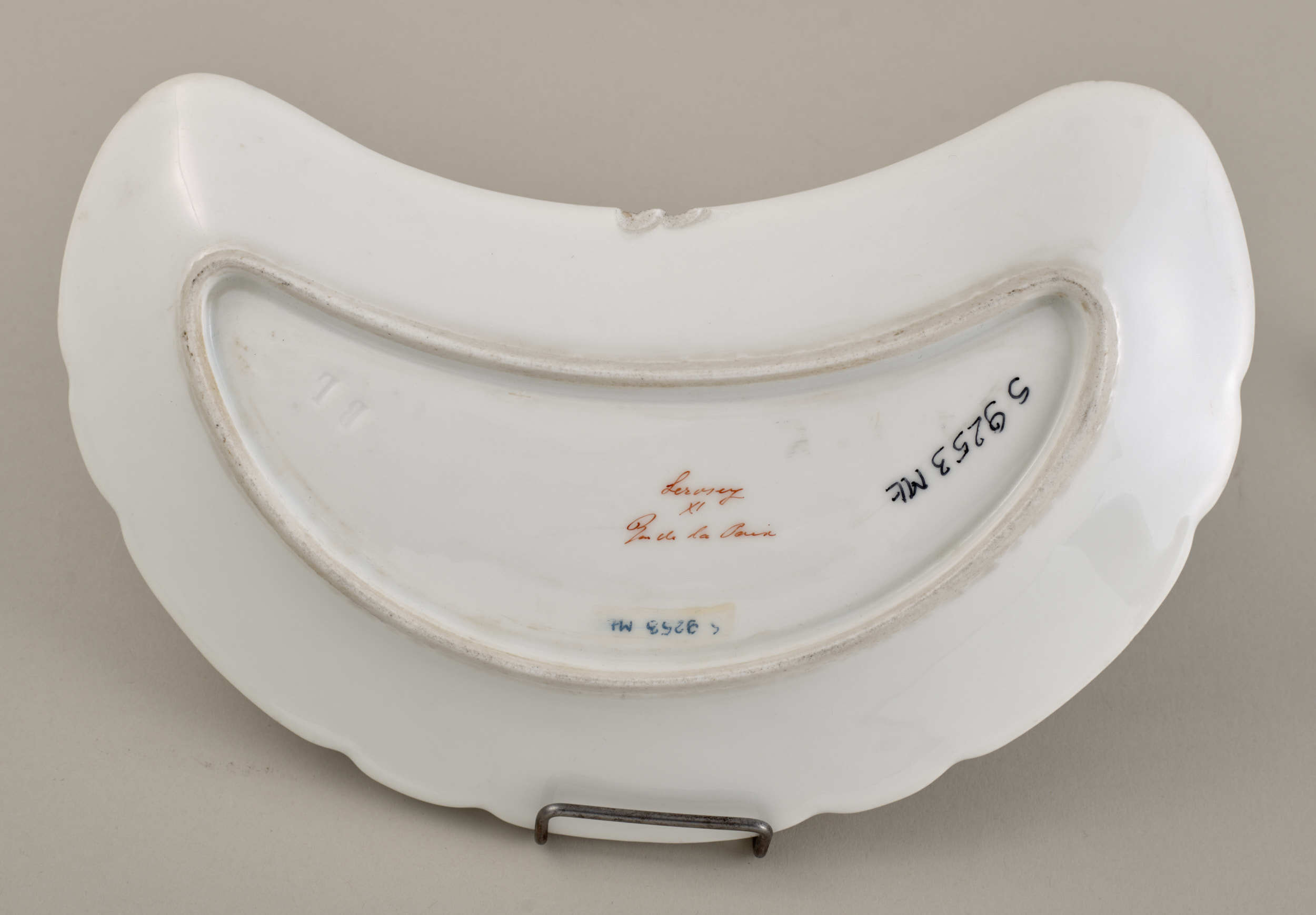 Talerzyk przystawkowy z hrabiowską koroną Talerzyk z dosyć grubej mlecznobiałej porcelany, kształtem zbliżony do półksiężyca bądź nerki, nieckowato zagłębiony z wąskim parapetowym brzegiem, który z jednej strony tj. na większym, niemal półkolistym łuku półksiężyca, wyróżnia się dziewięcioma zaokrąglonymi wyzębieniami, na przemian dłuższymi i krótszymi. Talerzyk zdobi złocista korona hrabiowska umiejscowiona pośrodku tj. na krótszej osi, poniżej brzegu. Jest ona malowana z szablonu w kolorach żelazowej czerwieni. Talerzyk tworzy komplet razem z pozostałymi 23 sztukami w tym typie. Francja, Paryż, 2 poł XIX w.